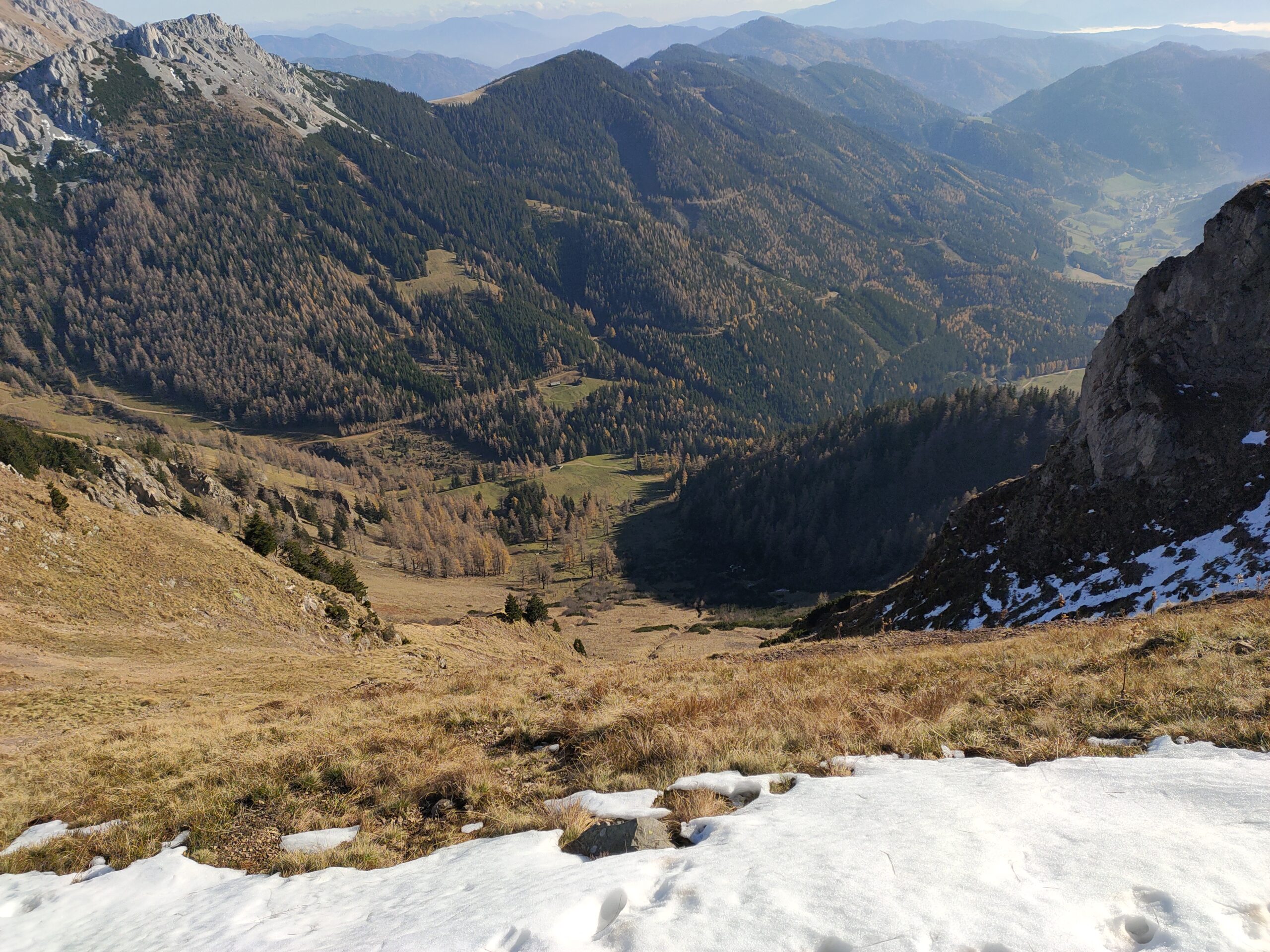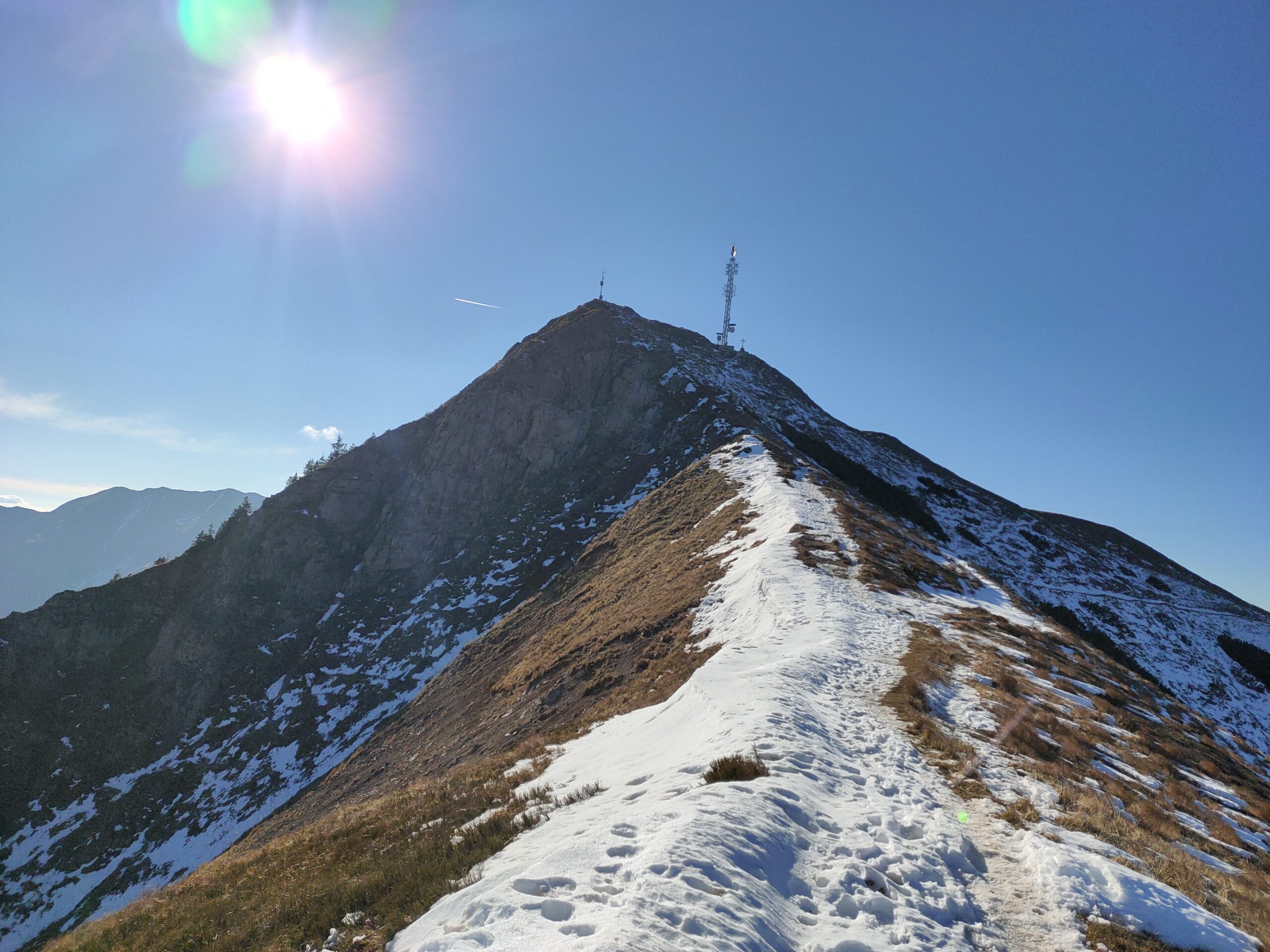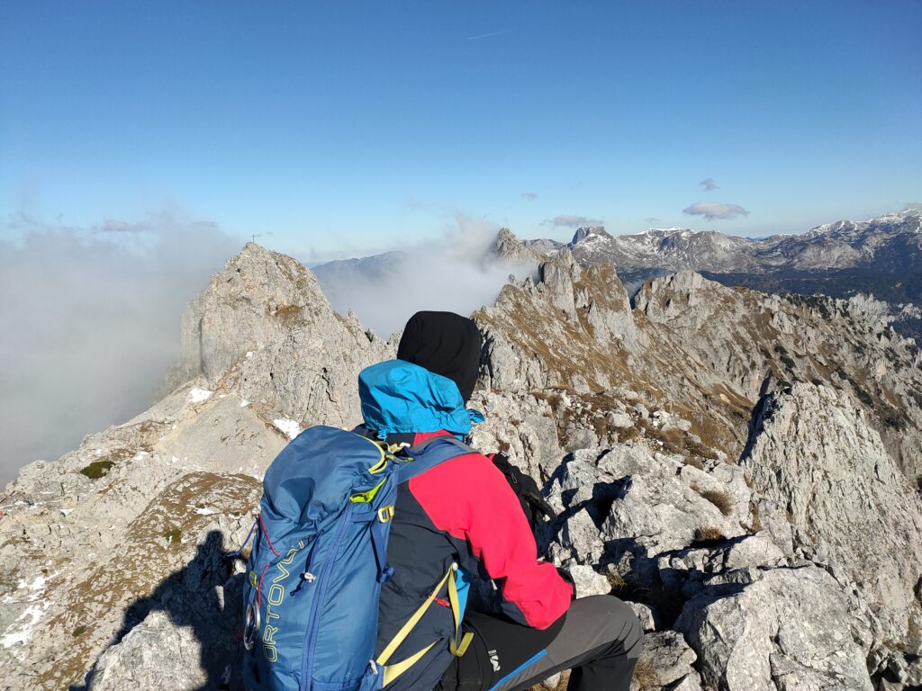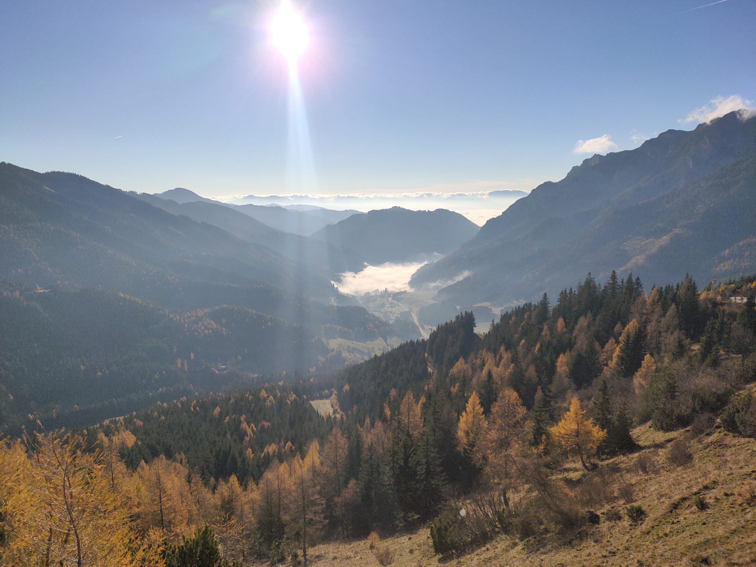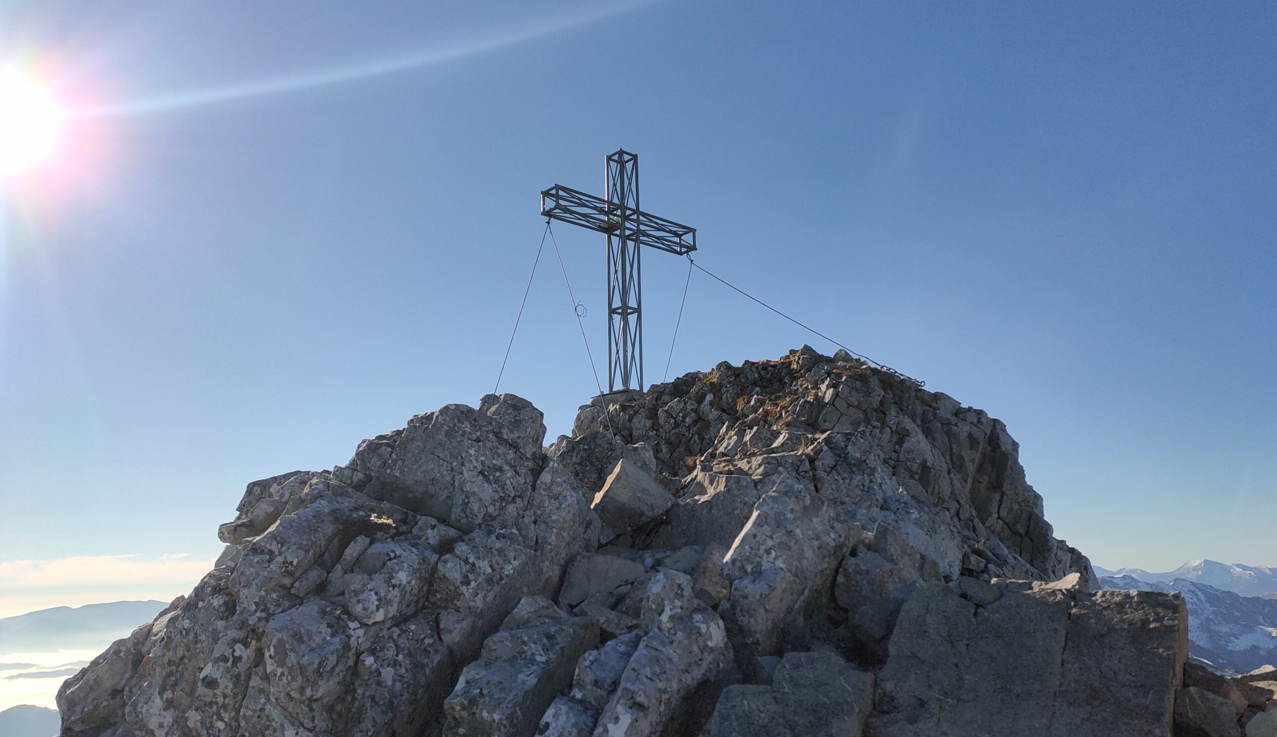 Wolfgang und ich nutzen den herrliche Tag für eine Bergetour vom Präbichl aus. Der Wind pfeift am Sattel und die Wolken und Nebelfetzen bläst es nach Norden über den Pass. Wir sind vorbereitet. Um halb neuen starten wir vom Parkplatz und steigen den Knappensteig hinauf zur Leobnerhütte. Dort helfen wir den Hüttenleuten den Fahnenmast abzubauen und im Gastraum unterzubringen. Dann geht es hinauf in den Hirscheggsattel. Im Sattel bläst wieder heftig der Wind, der erst wieder schwächer wird als wir auf der Nordseite, vorbei am Fledermausgrat aufsteigen. Die Vordernberger Griesmauer lassen wir noch rechts liegen und steigen durch Geröll und Schnee zum Einstieg des Steigs auf die TAC-Spitze. Die erste Querung ist heute durch den harten Schnee rutschig, aber mit dem Sicherungsseil ist es problemlos. Der Rest des Aufstiegs zum Gipfel ist steil aber recht einfach. Das schaut mit Schnee und Eis sicher anders aus. Am Gipfel erwartet uns dann ein herrliches Schauspiel aus Wolken, Wind und Sonnen. Mit der Sonne im Rücken entsteht vor uns ein Regenbogenkreis mit uns als Schatten im Zentrum. Bis hinüber zur Frauenmauer bläst der Wind immer wieder Wolkenfetzen um die Gipfel. Die Berge rundherum sind zum Greifen nah. Wir bleiben nicht lange, schauen uns aber die Skiabfahrten rundherum an, dann geht es weiter zur Vordernberger Griesmauer. Auch da sind wir wieder allein am Gipfel. Mittlerweile steigen noch einige vom Sattel herauf. Nachdem Wolfgang am Gipfel entdeckt, dass der eigentliche Gipfel der Griesmauer einige Meter höher ist, steigen wir auch noch auf diesen. Auf dem Rückweg zum Hirscheggsattel sehen wir eine Dreierseilschaft, die sich beim kalten Südfön den Fledermausgrat hinaufarbeitet und sind froh im Lee abzusteigen. Und weil es so schön ist, nehmen wir auf dem Rückweg noch den Polstergipfel mit.