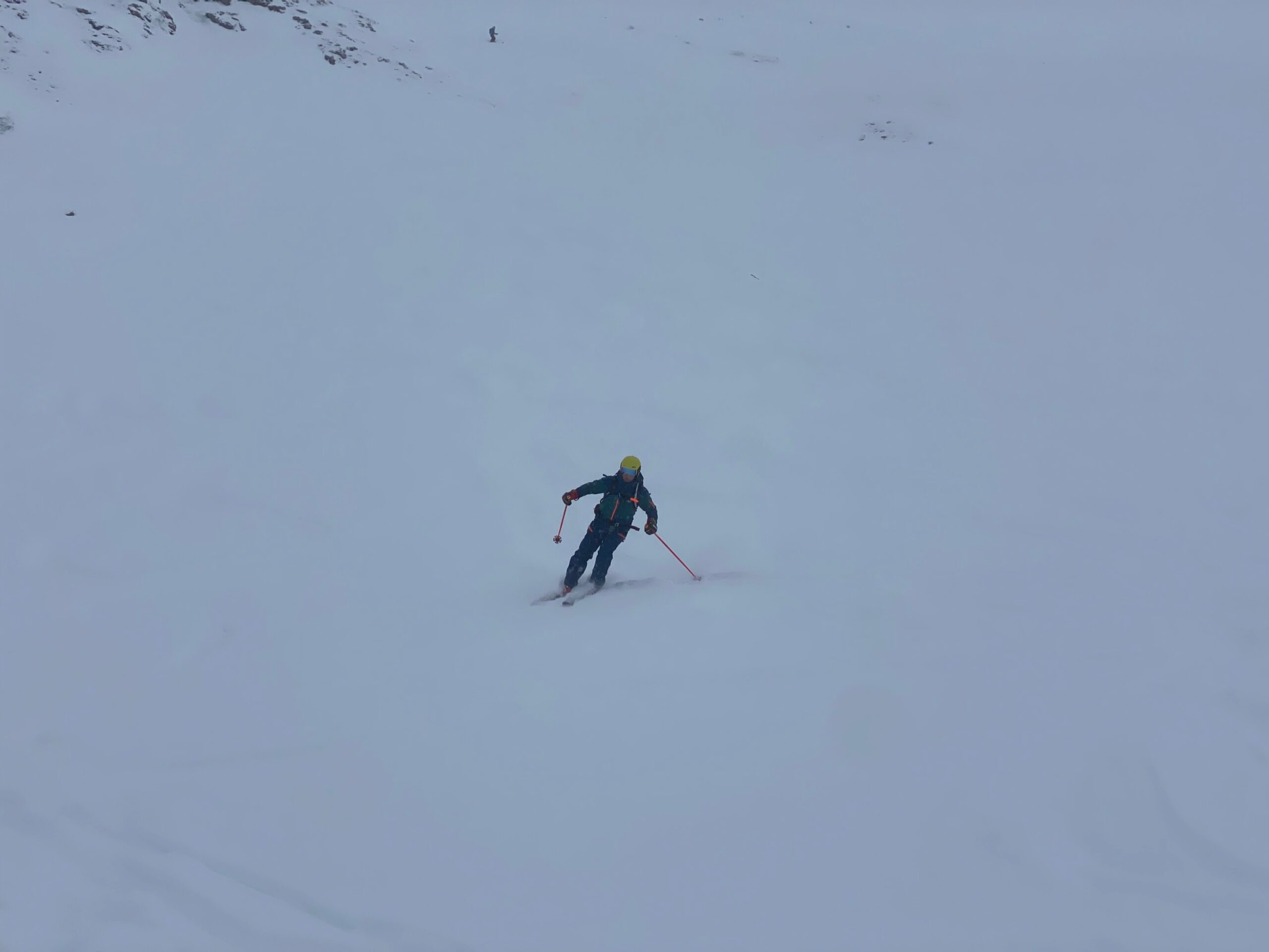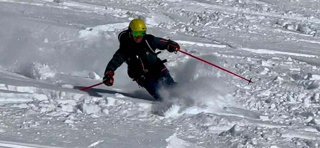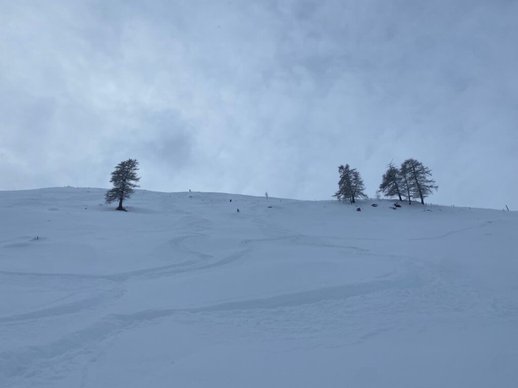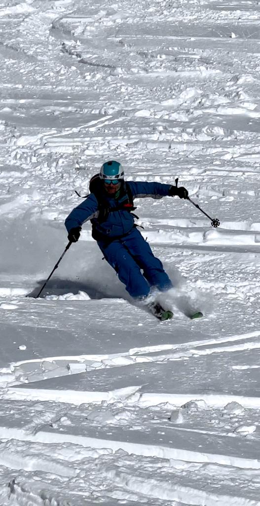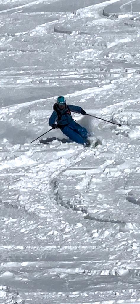 Der Sonntag wird dann richtig lässig, einerseits weil oben die Sonne strahlt, der blaue Himmel lacht und der Neuschnee fluffig ist. Wieder starten wir am Schindlergrat und mit Sonne und Sicht ist es richtig lässig. In einer steilen Rinne gehe ich mit breiter Skiführung wieder auf Sicherheit. Aber im flacheren Gelände geht das enge Auftriebs-starke fahren in enger Position schon gut und teilweise noch mit Kraft in den Beinen kann ich richtig Speed und Leichtigkeit in den Pulver zaubern. Leider ist am Ende der Kraftreserven noch viel Schnee und Hang übrig.