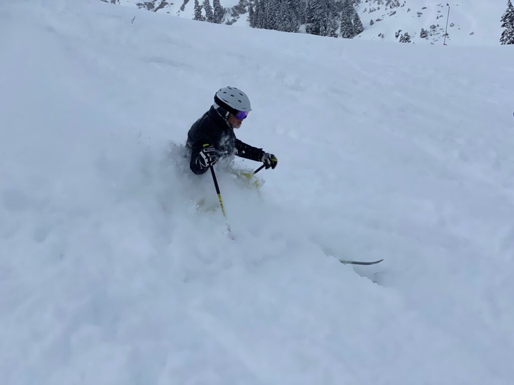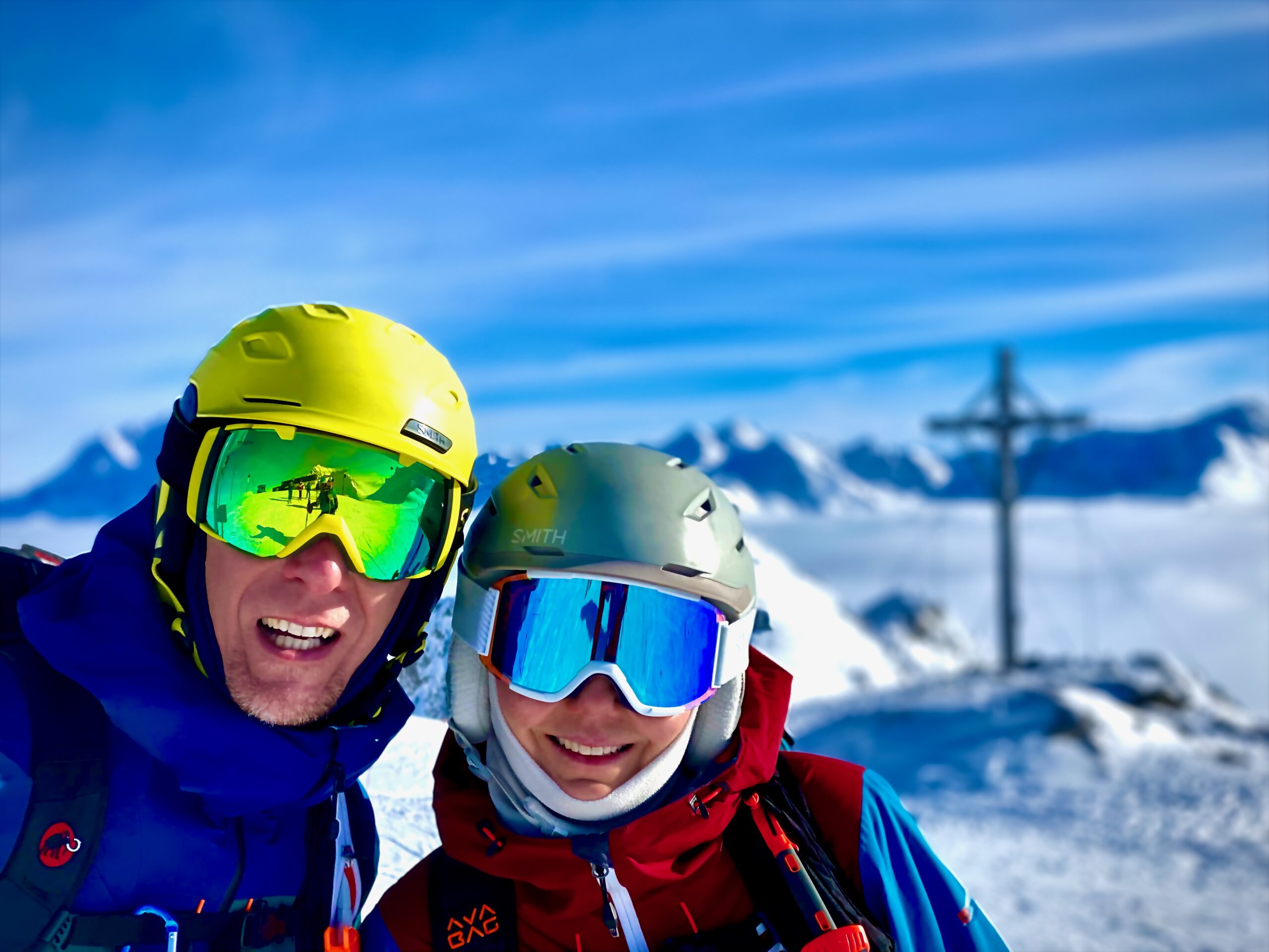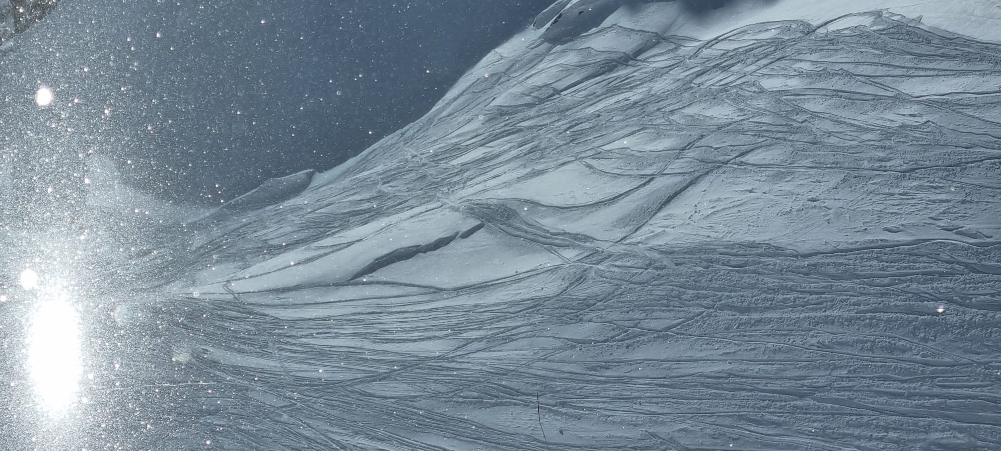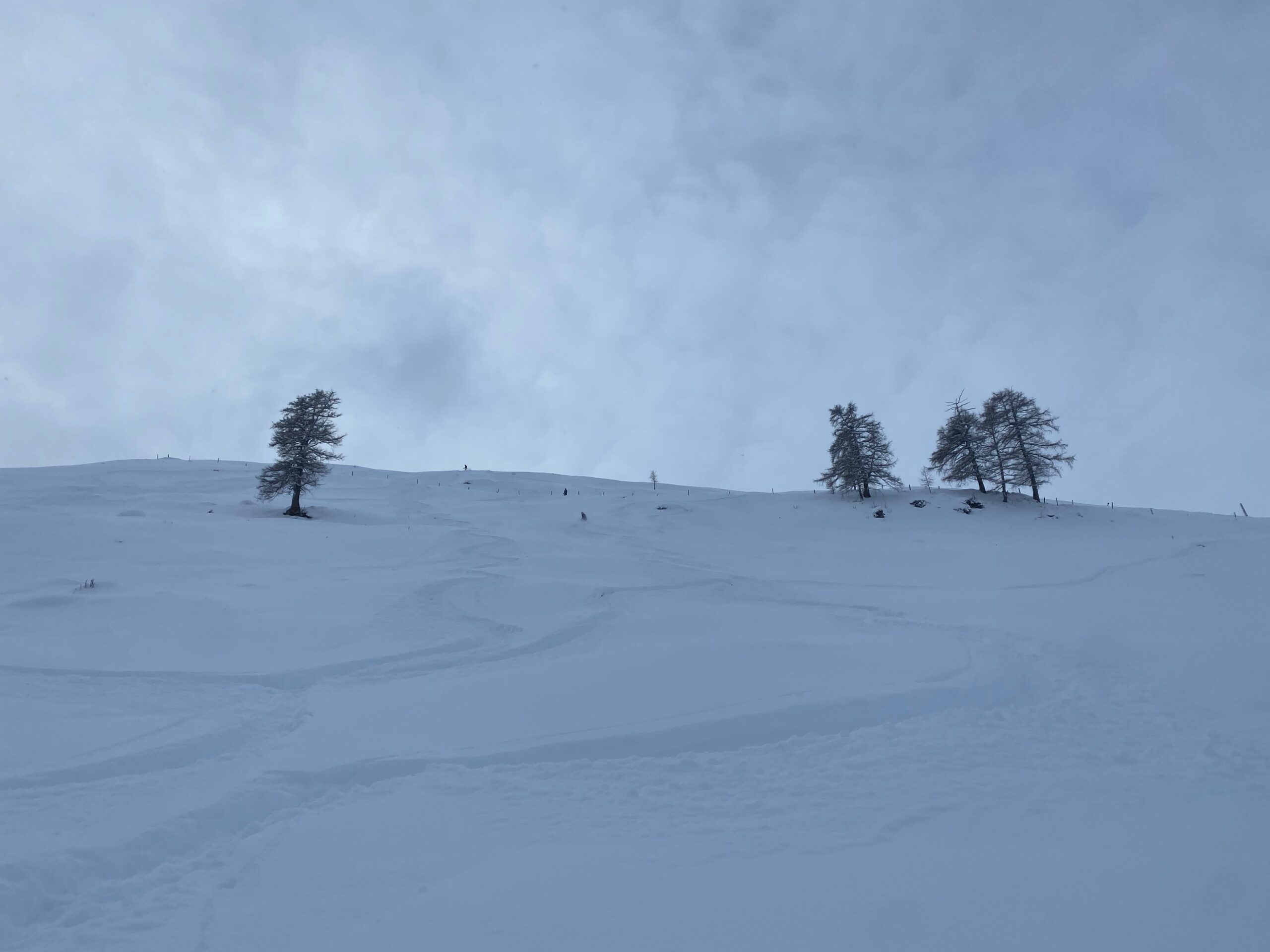 Der Sonntag wird dann richtig lässig, einerseits weil oben die Sonne strahlt, der blaue Himmel lacht und der Neuschnee fluffig ist. Wieder starten wir am Schindlergrat und mit Sonne und Sicht ist es richtig lässig. In einer steilen Rinne gehe ich mit breiter Skiführung wieder auf Sicherheit. Aber im flacheren Gelände geht das enge Auftriebs-starke fahren in enger Position schon gut und teilweise noch mit Kraft in den Beinen kann ich richtig Speed und Leichtigkeit in den Pulver zaubern. Leider ist am Ende der Kraftreserven noch viel Schnee und Hang übrig.