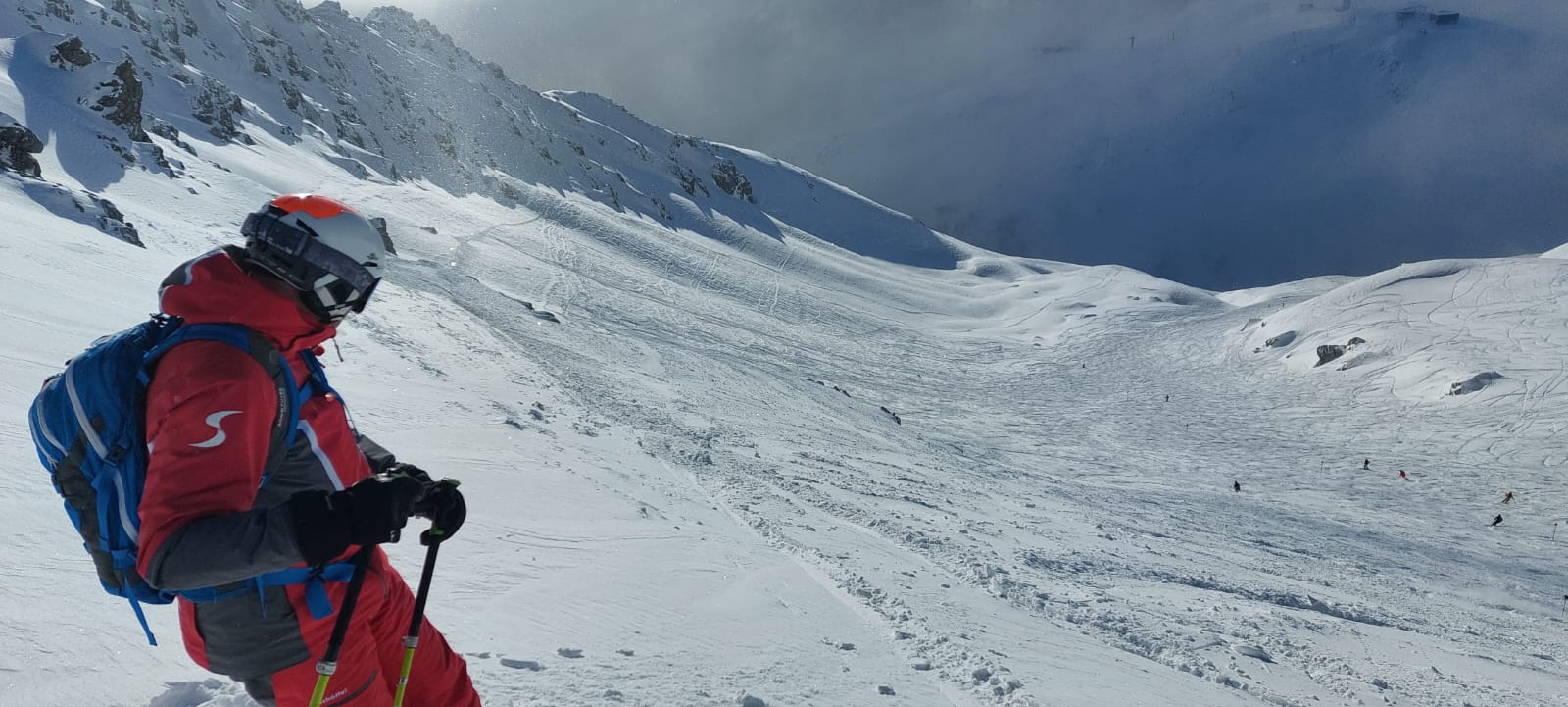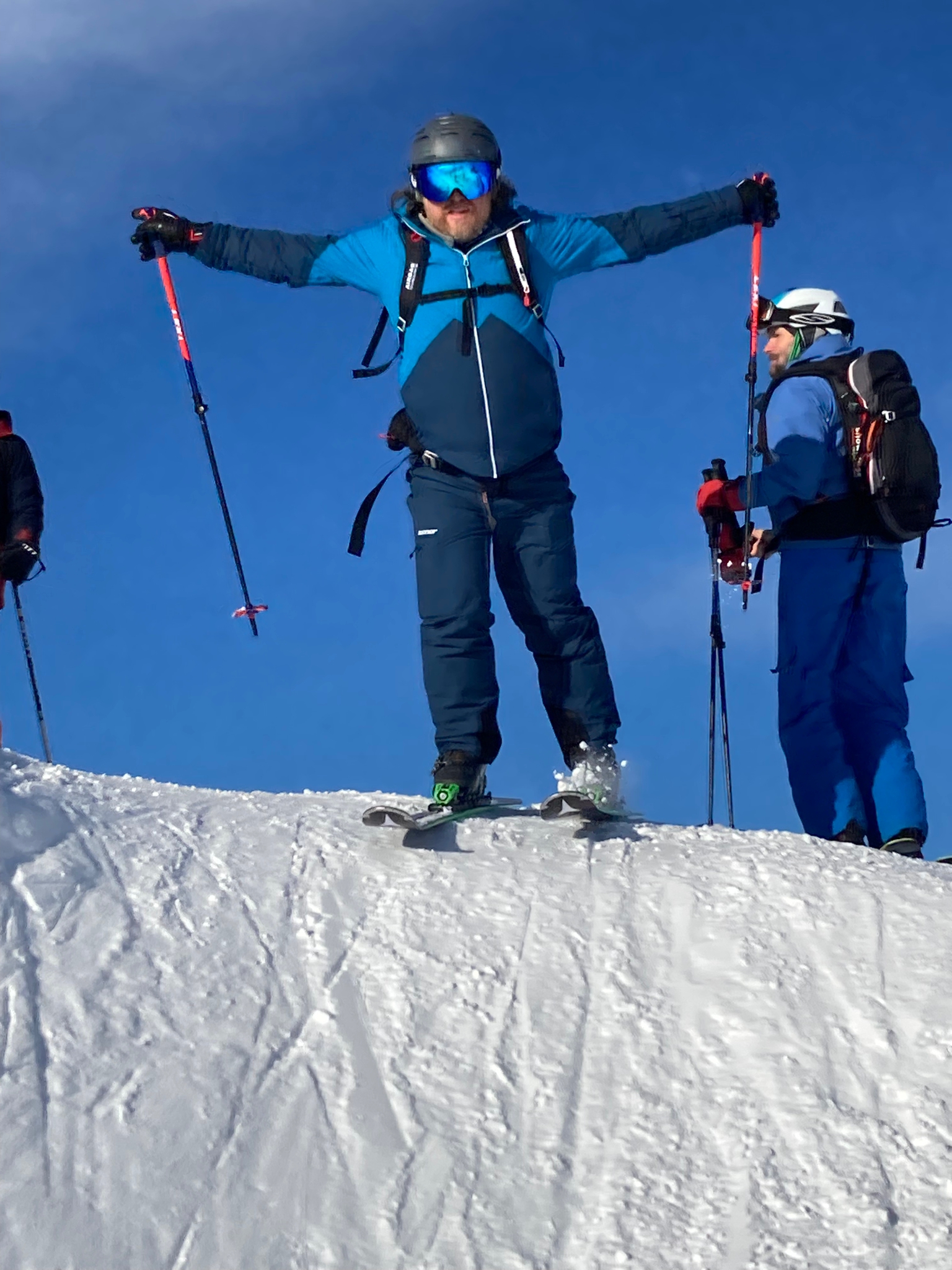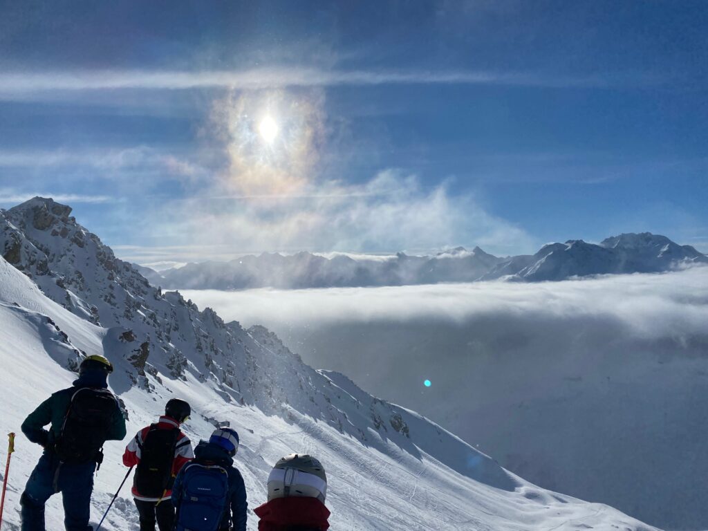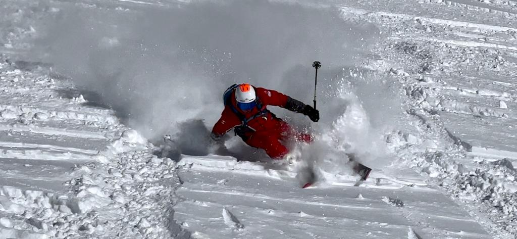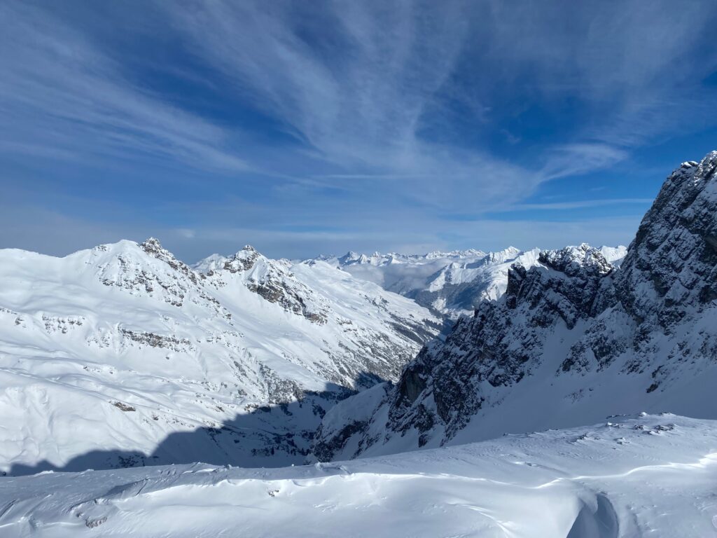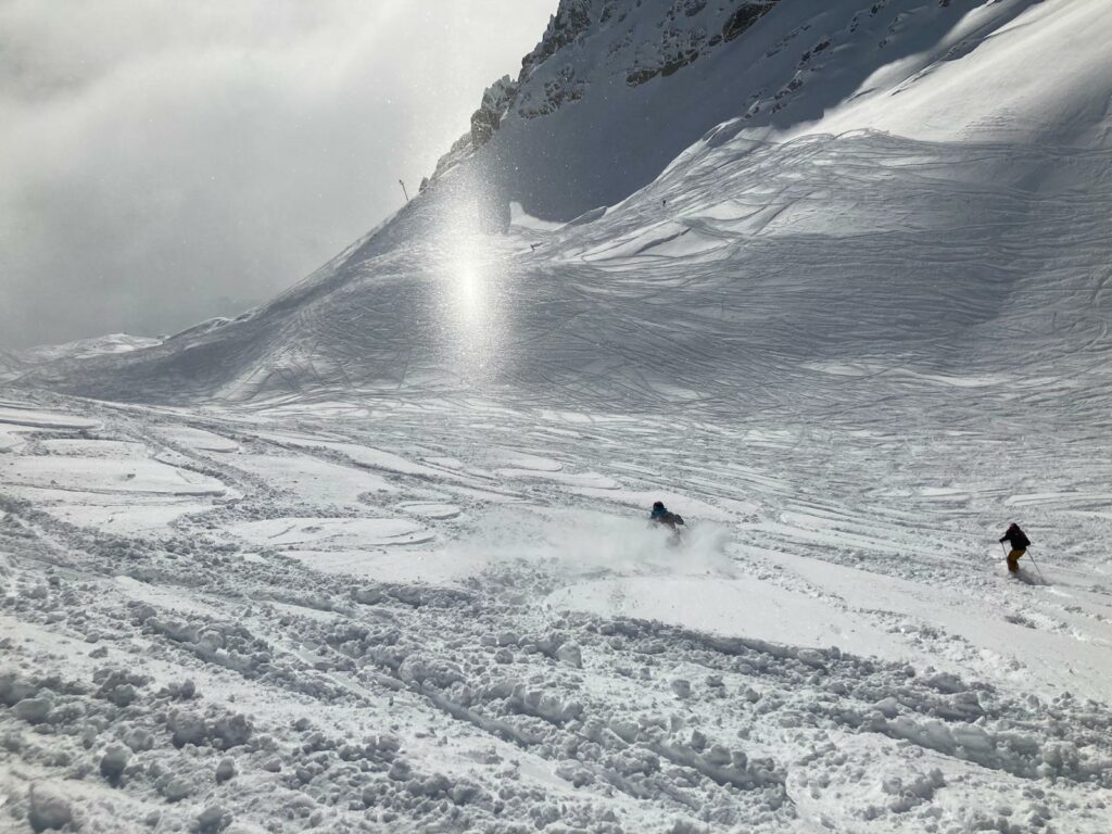 Insgesamt spulen wir gut 180 Kilometer und gut zwanzigtausend Tiefenmeter ab. Jeden Tag brennen die Oberschenkel, teilweise schon nach dem zweiten Run. Und der Sonntag entlohnt für die drei Tage „Schlechtwetter“ davor. Das Fahren macht Spass, das rundherum dämpft meine Freude. Zu viel von Menschen, Massentourismus, Hüttengaudi und Skiindustrie. Aber das Freeriden an sich macht Spass und bietet viele Entwicklungspotentiale für mich.