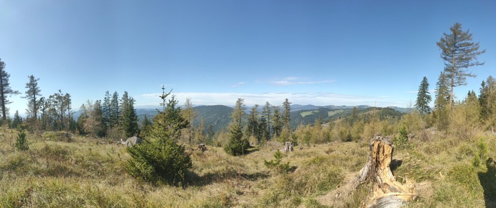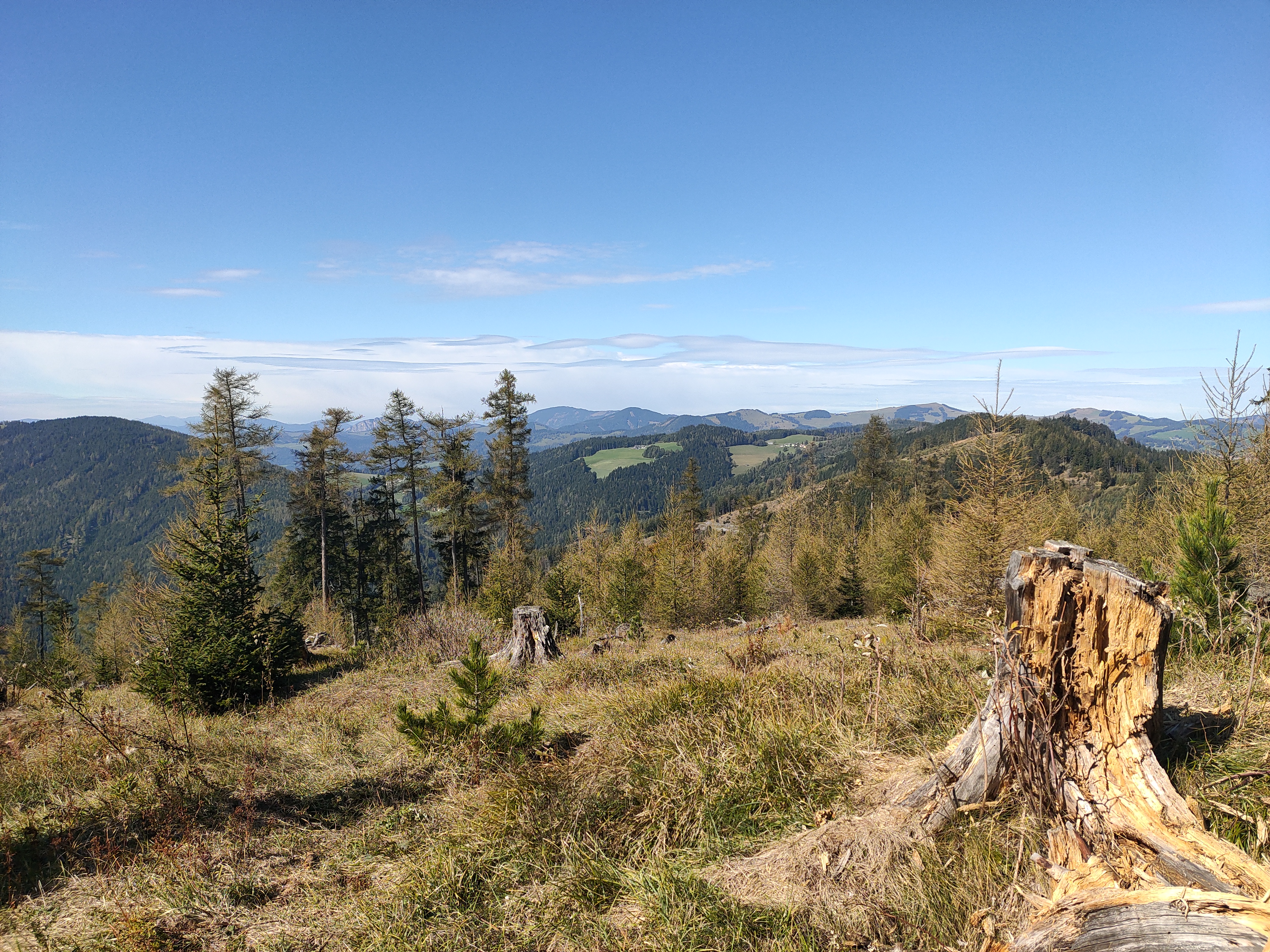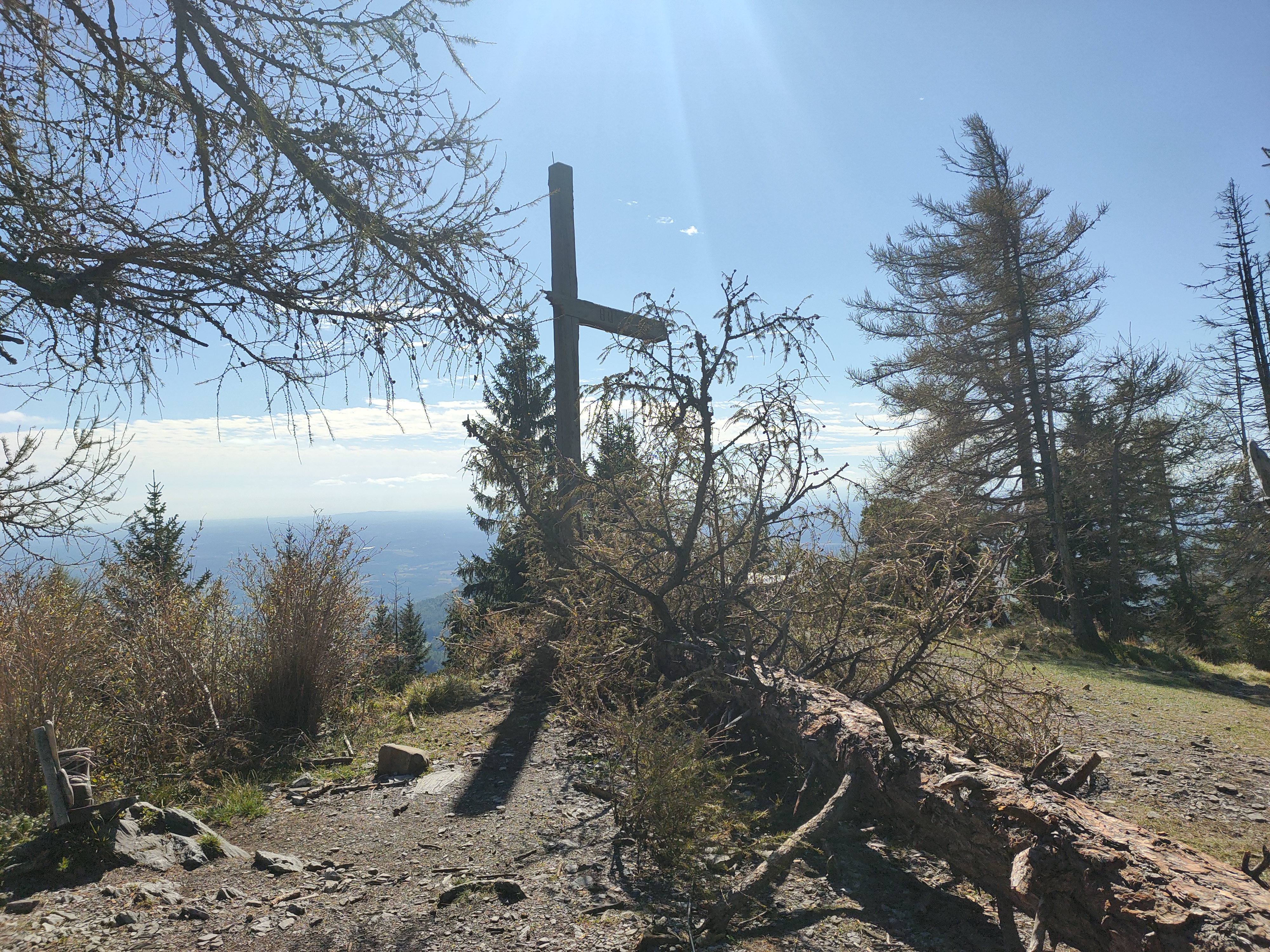 Am Zetz war ich schon lange nicht mehr. Das neue Haus von Markus ist in Regerstätten beim Upgrade und deshalb wandern wir auf den Zetz. Es ist frisch und windig. Die Unwetter der letzten Wochen haben ihre Spuren hinterlassen, aber der Weg hinauf ist ohne Hindernisse zu gehen. Erst am Weg hinauf zur Zetzwand liegen ein paar Bäume über dem Weg. Markus und ich nutzen die Zeit zum Reden, wofür schon länger nicht mehr die Möglichkeit gegeben war. Oben am Gipfel hat eine Lärche beim Gipfelkreuz den Querbalken abgerissen. Wir setzten uns in die Wiese und genießen den herrlichen Herbsttag. Ein schneebedecker Gipfel lugt über die Sommeralm her. Ich glaube es ist der Hochschwab. Dann praktizieren wir noch eine Runde Ehrliches Mitteilen und dann geht es zurück in Tal und zum Schneckenhaus der mittlerweile wieder reisefertig ist.