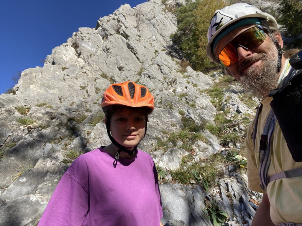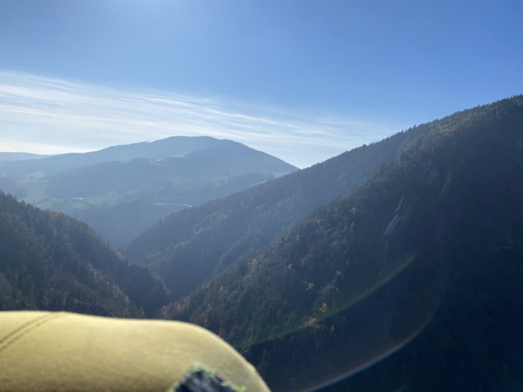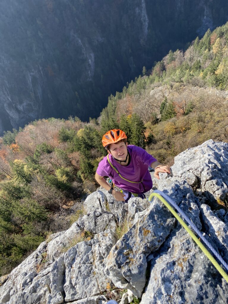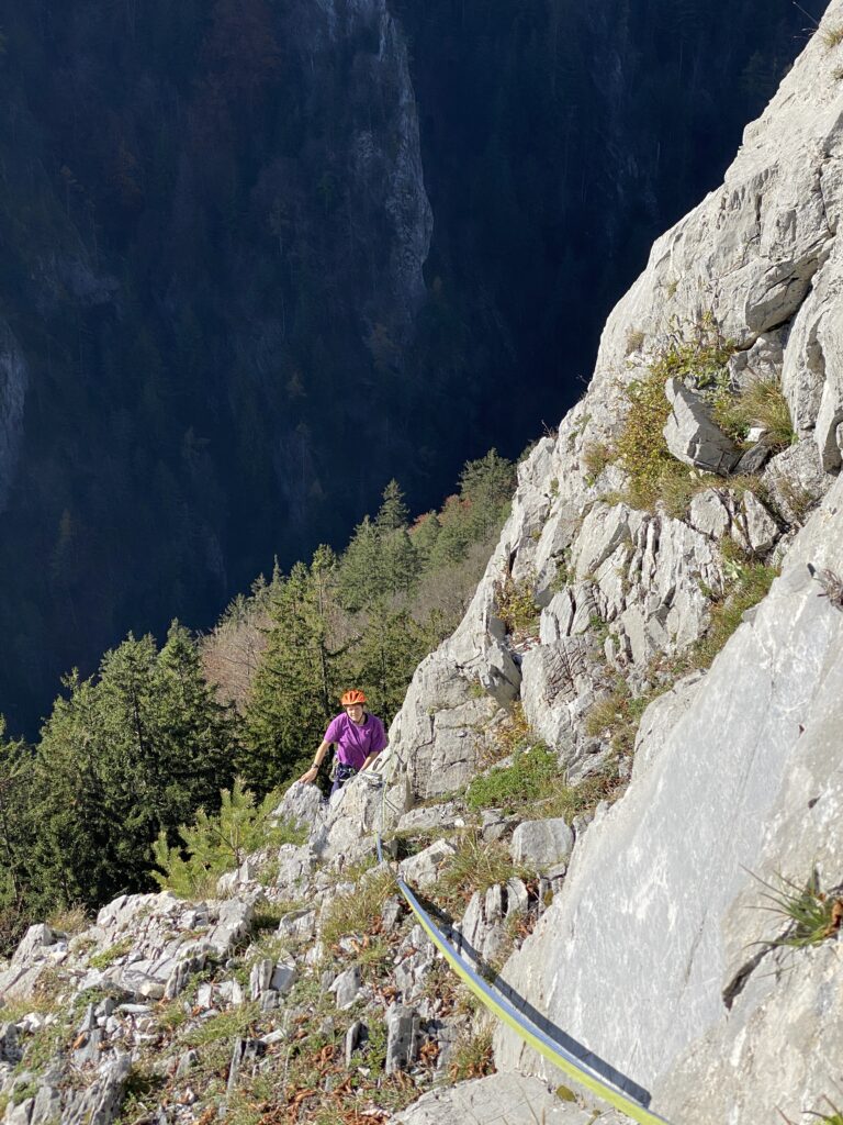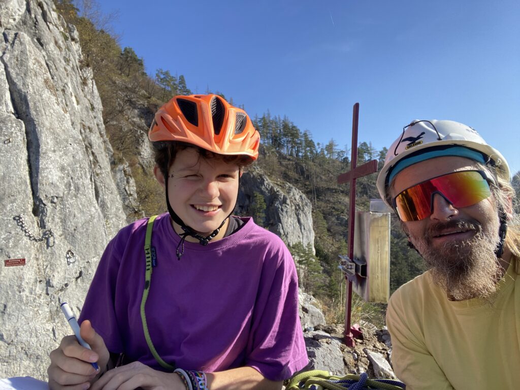 Das letzte Mal waren Leona und ich im Juni am Rablgrat unterwegs. Heute fährt sie uns schon in die Weizklamm und ich bin Beifahrer. Wie immer steigen wir zügig bergan. Das goldene Herbstlaub hängt noch in den Bäumen, das in allen dunklen Schattierungen von Rot bis Braun am Weg. Es ist einfach herrlich. Am Weg haben wir noch ein Plauscherl mit Wander*innen und von Leona erfahre ich, dass sie lieber zu Hause am Sofa sitzen würde, ich nach den fast 8000 Höhenmeter der Herbstferien auch. :-) Auf der Plattform angekommen gehen wir die Seiltechnik nochmal durch und dann geht es auf den Grat nach oben. Wir sind zügig unterwegs und nach einer halben Stunde sitzen wir beim Kreuz. Leona macht wieder einen Gipfelbucheintrag und eine Altherren-Kletter-Partie überholt uns. Wir seilen mit dem 60er-Doppelseil auf einen Schwung ab. Leona erklärt den erfahrenen Kletterern noch, dass sie das nicht zum ersten Mal macht, aber es sich immer wieder wie neu anfühlt. Dann geht es zurück nach Hause. Arian und Aron kommen zum Mountainbiken.