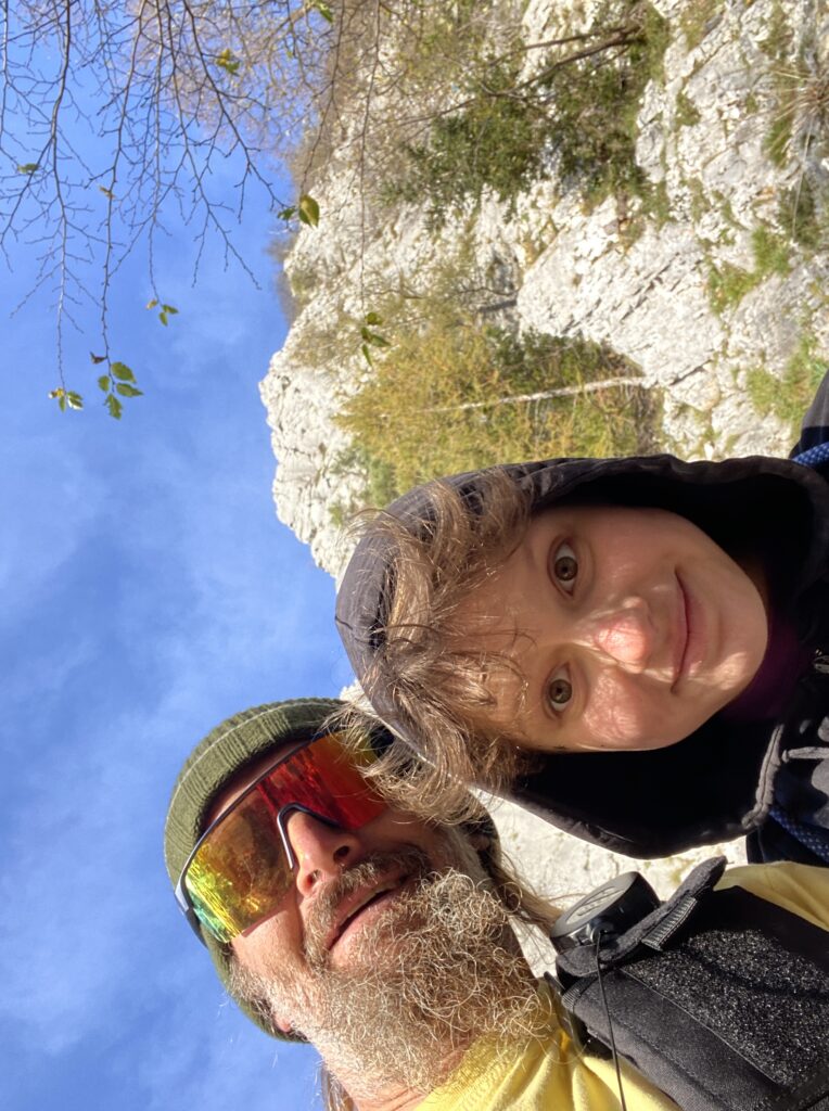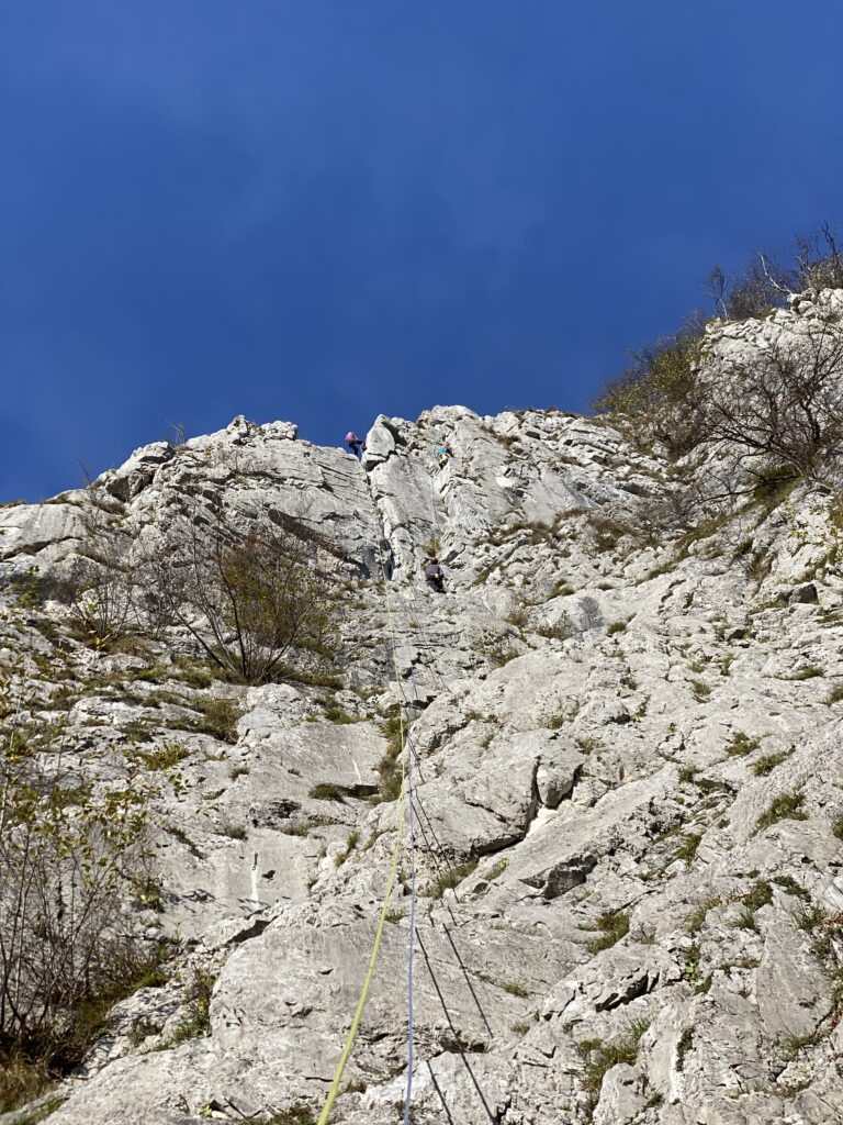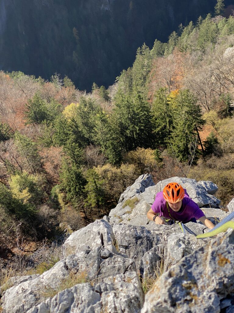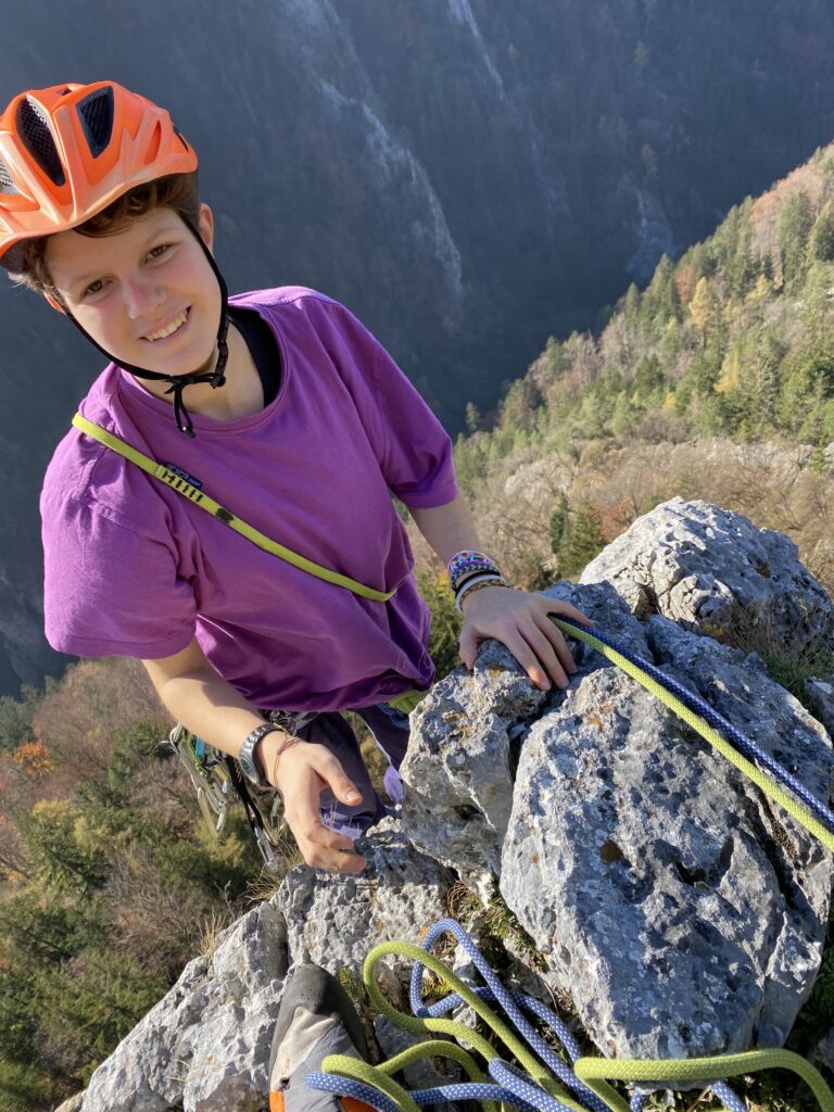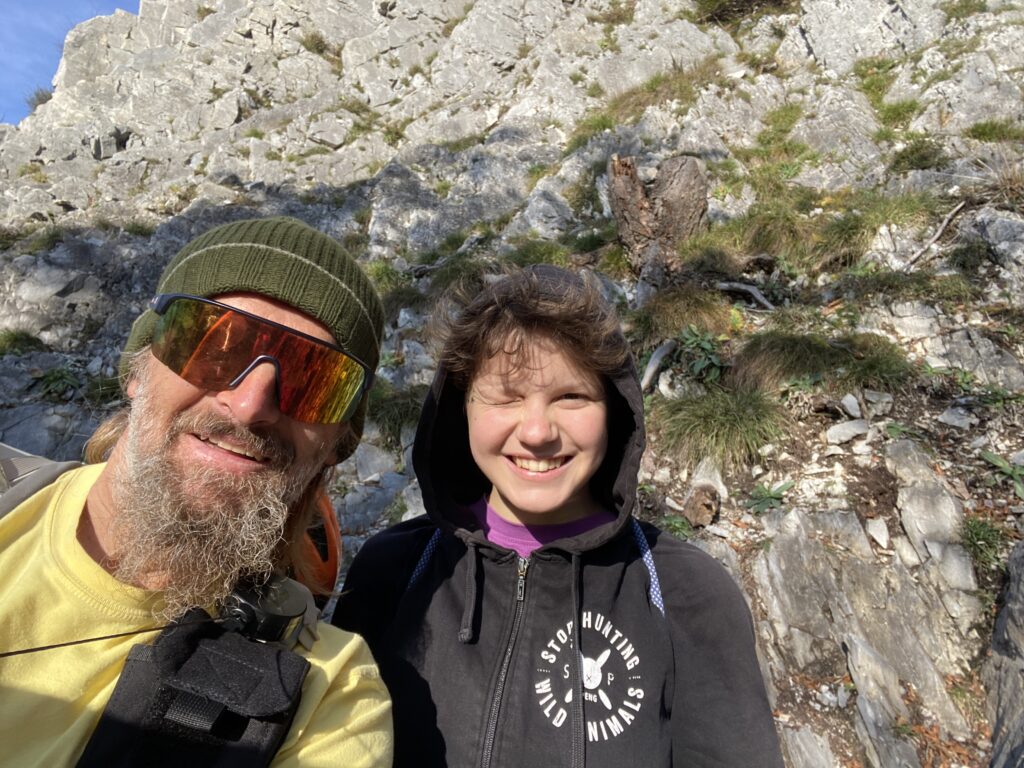 Das letzte Mal waren Leona und ich im Juni am Rablgrat unterwegs. Heute fährt sie uns schon in die Weizklamm und ich bin Beifahrer. Wie immer steigen wir zügig bergan. Das goldene Herbstlaub hängt noch in den Bäumen, das in allen dunklen Schattierungen von Rot bis Braun am Weg. Es ist einfach herrlich. Am Weg haben wir noch ein Plauscherl mit Wander*innen und von Leona erfahre ich, dass sie lieber zu Hause am Sofa sitzen würde, ich nach den fast 8000 Höhenmeter der Herbstferien auch. :-) Auf der Plattform angekommen gehen wir die Seiltechnik nochmal durch und dann geht es auf den Grat nach oben. Wir sind zügig unterwegs und nach einer halben Stunde sitzen wir beim Kreuz. Leona macht wieder einen Gipfelbucheintrag und eine Altherren-Kletter-Partie überholt uns. Wir seilen mit dem 60er-Doppelseil auf einen Schwung ab. Leona erklärt den erfahrenen Kletterern noch, dass sie das nicht zum ersten Mal macht, aber es sich immer wieder wie neu anfühlt. Dann geht es zurück nach Hause. Arian und Aron kommen zum Mountainbiken.