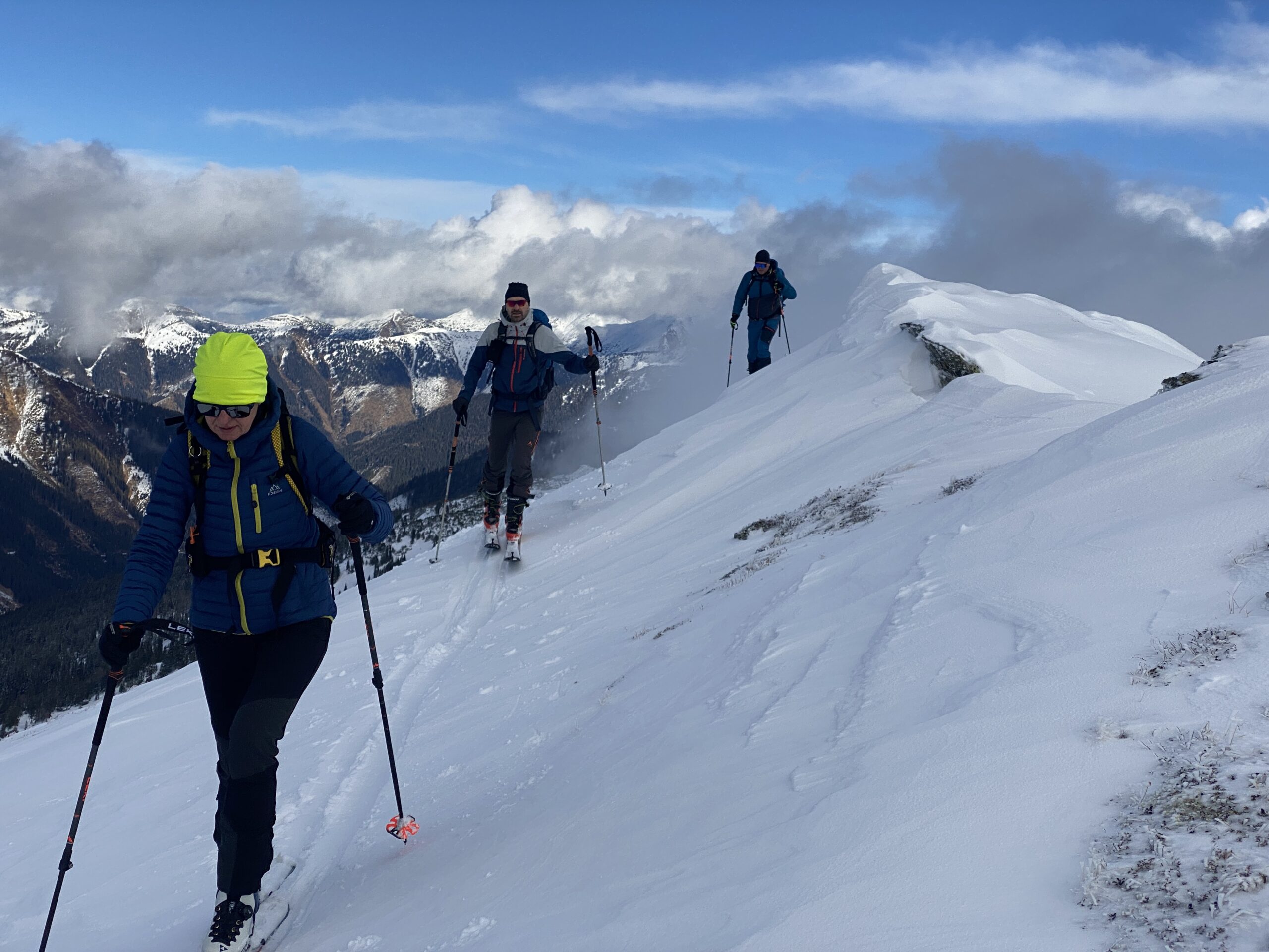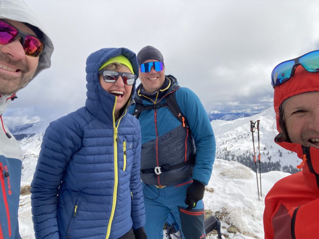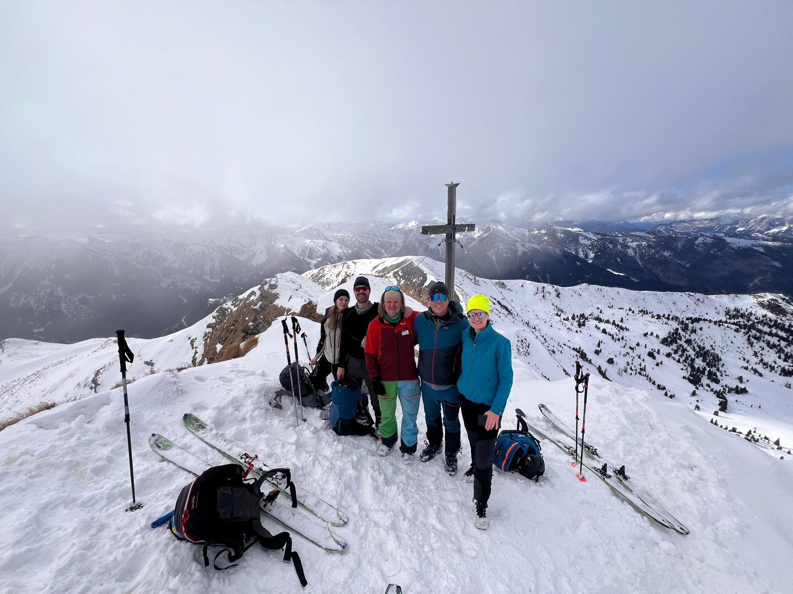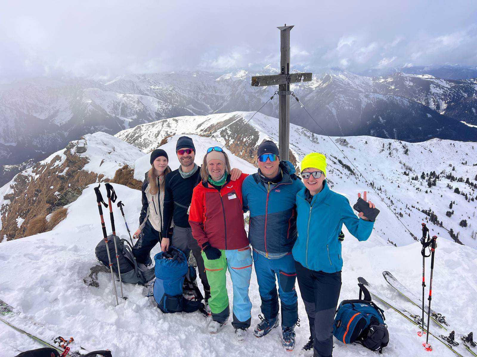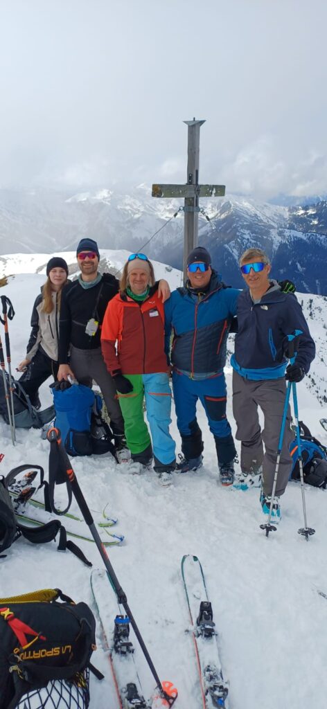 Der Skitourenkurs für Anfänger:innen und Aufsteiger:innen wird dieses Jahr nur von Aufsteiger:innen gebucht. So sind die drei Skitouren bei sehr feinen Wetterbedingungen und wenig Schnee von Anfang an auf hohem Niveau angesiedelt. Andrea hat heuer mit dem Skitouren angefangen und ist voll Motivation und mit ihrer ganzen Bergerfahrung eingestiegen. Karl und Martin sind schon erfahrene Skitourengeher, mit denen ich in den letzten Jahren schon einige Male sehr fein am Berg unterwegs war. Jana, die Tochter von Martin ist am Sonntag das erste mal mit dem Splitboard unterwegs und zeigt eine enorme Lernkurve auf der Tour, bringt aber sehr viel mit!