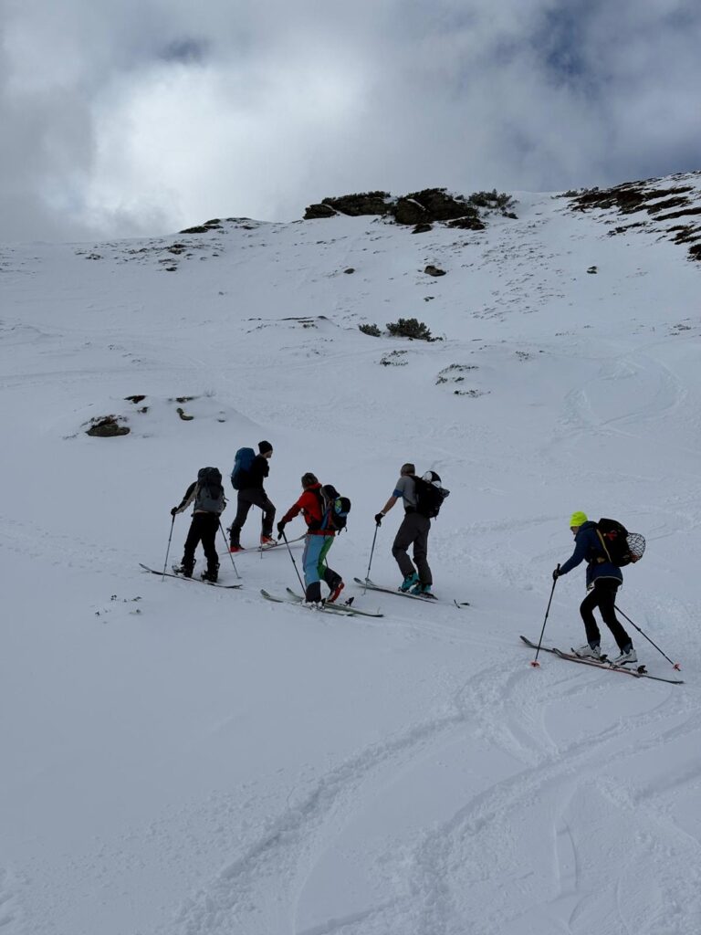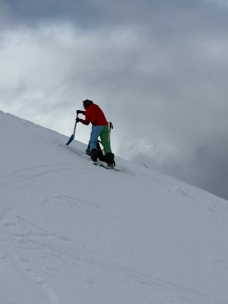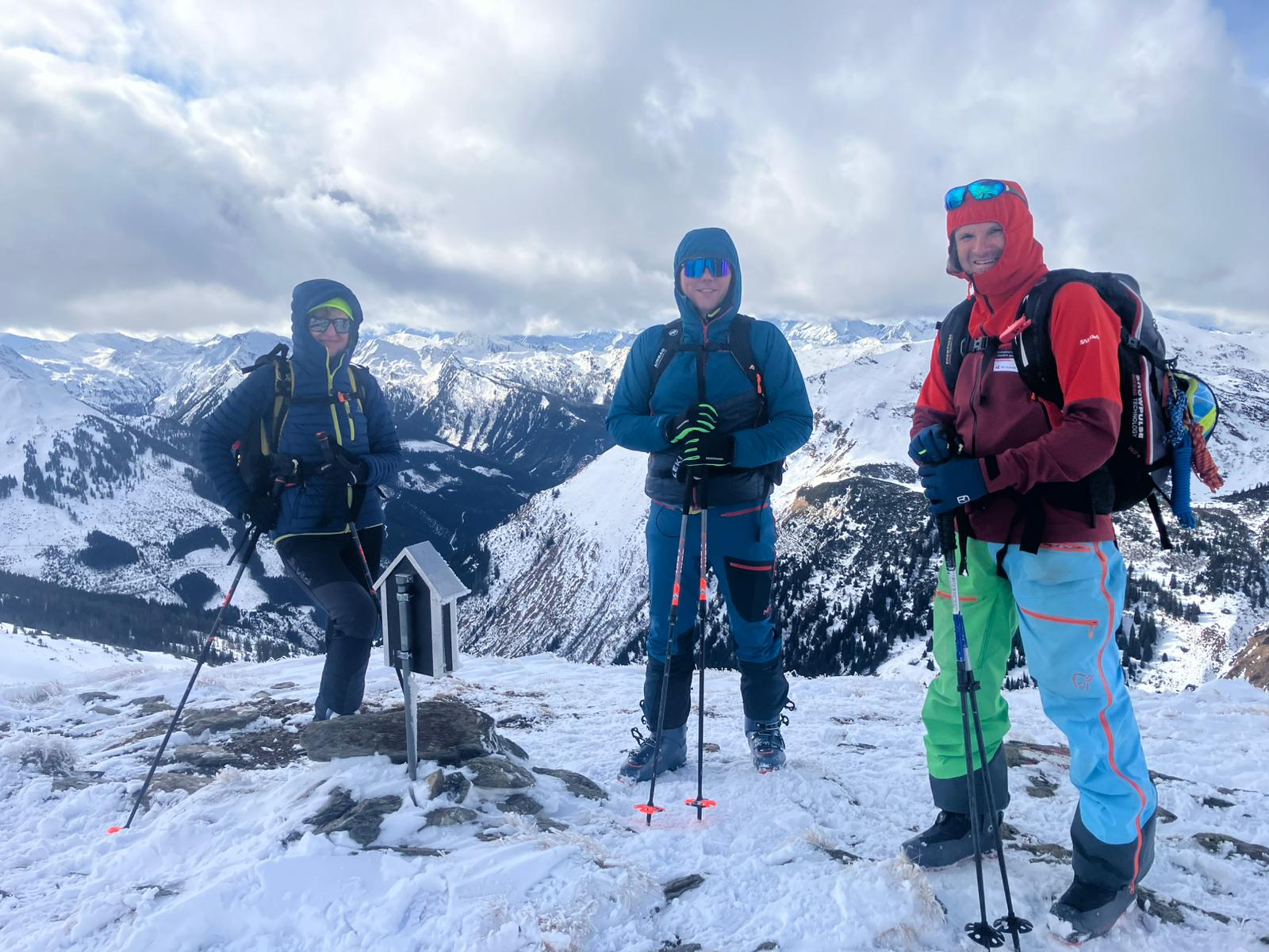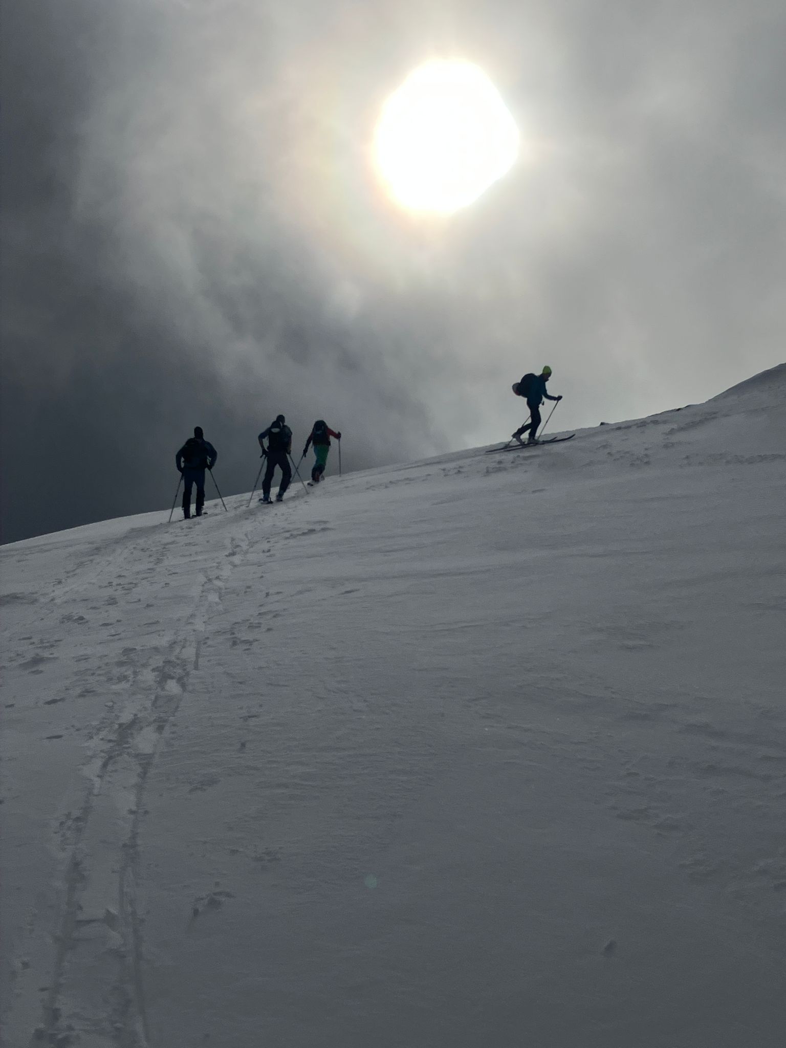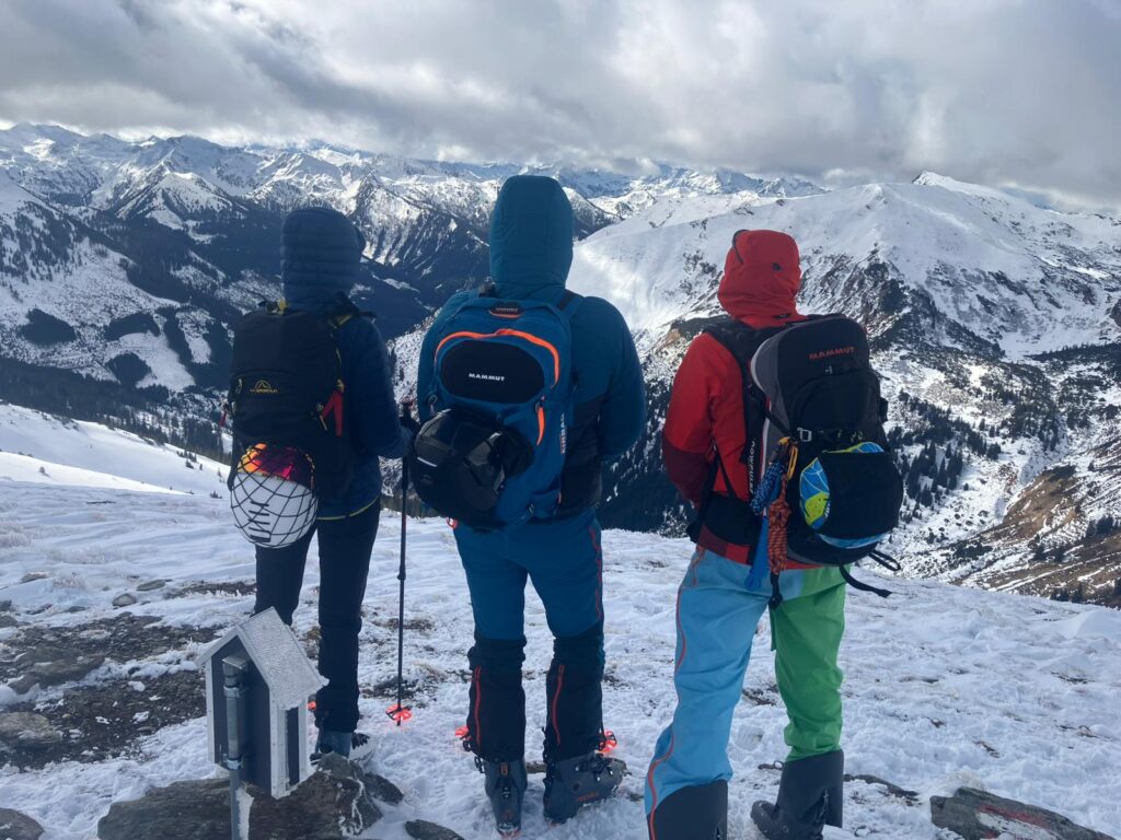 Der Skitourenkurs für Anfänger:innen und Aufsteiger:innen wird dieses Jahr nur von Aufsteiger:innen gebucht. So sind die drei Skitouren bei sehr feinen Wetterbedingungen und wenig Schnee von Anfang an auf hohem Niveau angesiedelt. Andrea hat heuer mit dem Skitouren angefangen und ist voll Motivation und mit ihrer ganzen Bergerfahrung eingestiegen. Karl und Martin sind schon erfahrene Skitourengeher, mit denen ich in den letzten Jahren schon einige Male sehr fein am Berg unterwegs war. Jana, die Tochter von Martin ist am Sonntag das erste mal mit dem Splitboard unterwegs und zeigt eine enorme Lernkurve auf der Tour, bringt aber sehr viel mit!