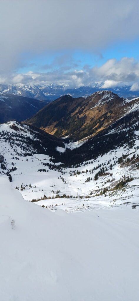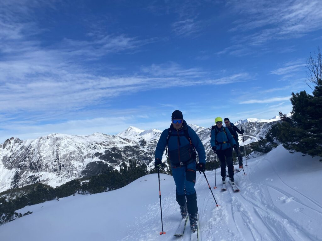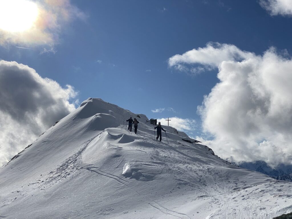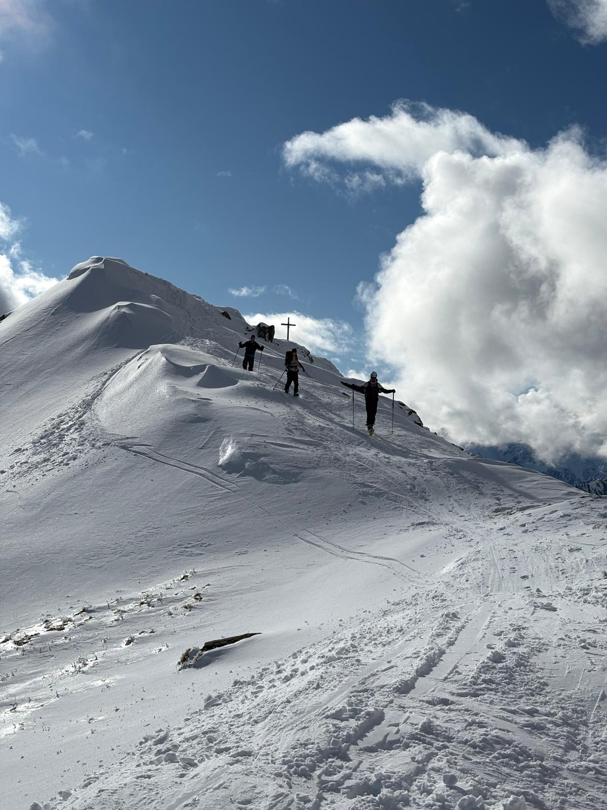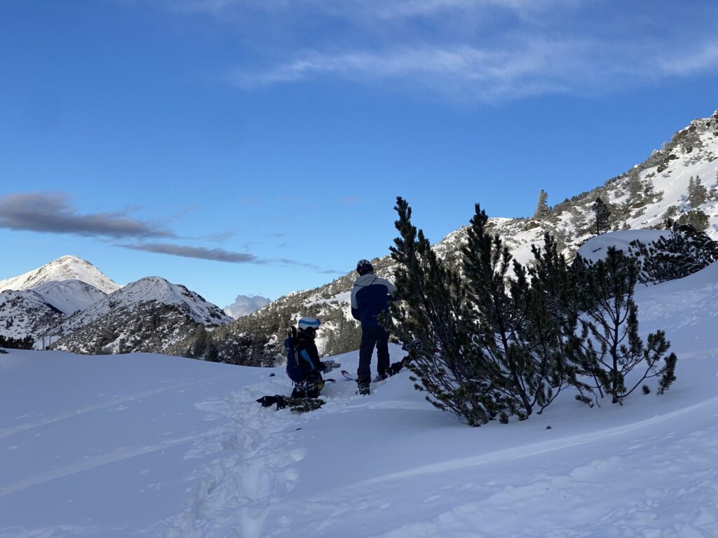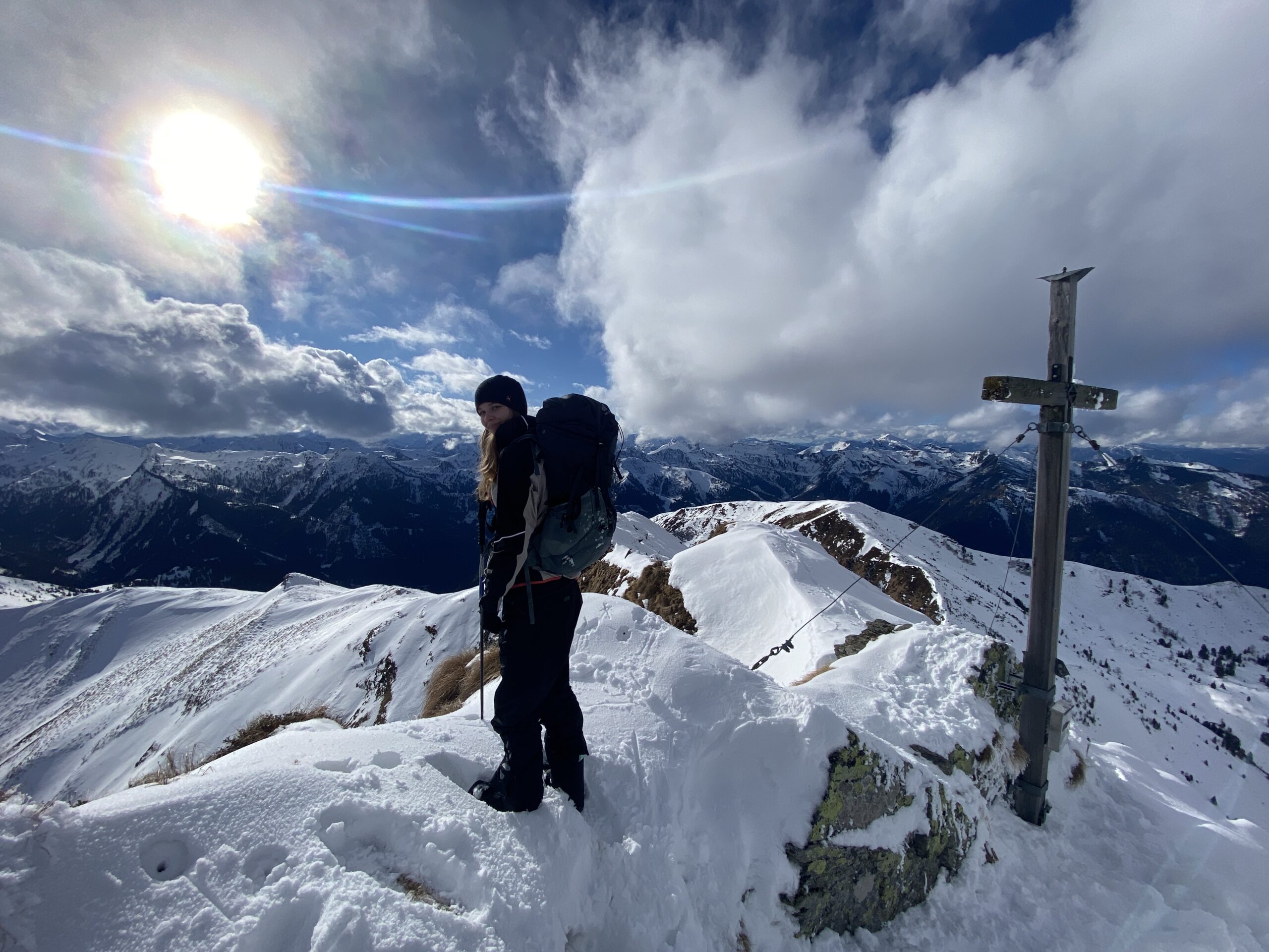 Der Skitourenkurs für Anfänger:innen und Aufsteiger:innen wird dieses Jahr nur von Aufsteiger:innen gebucht. So sind die drei Skitouren bei sehr feinen Wetterbedingungen und wenig Schnee von Anfang an auf hohem Niveau angesiedelt. Andrea hat heuer mit dem Skitouren angefangen und ist voll Motivation und mit ihrer ganzen Bergerfahrung eingestiegen. Karl und Martin sind schon erfahrene Skitourengeher, mit denen ich in den letzten Jahren schon einige Male sehr fein am Berg unterwegs war. Jana, die Tochter von Martin ist am Sonntag das erste mal mit dem Splitboard unterwegs und zeigt eine enorme Lernkurve auf der Tour, bringt aber sehr viel mit!