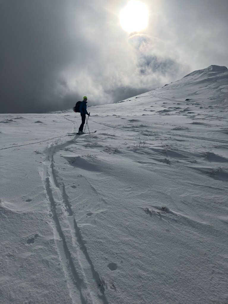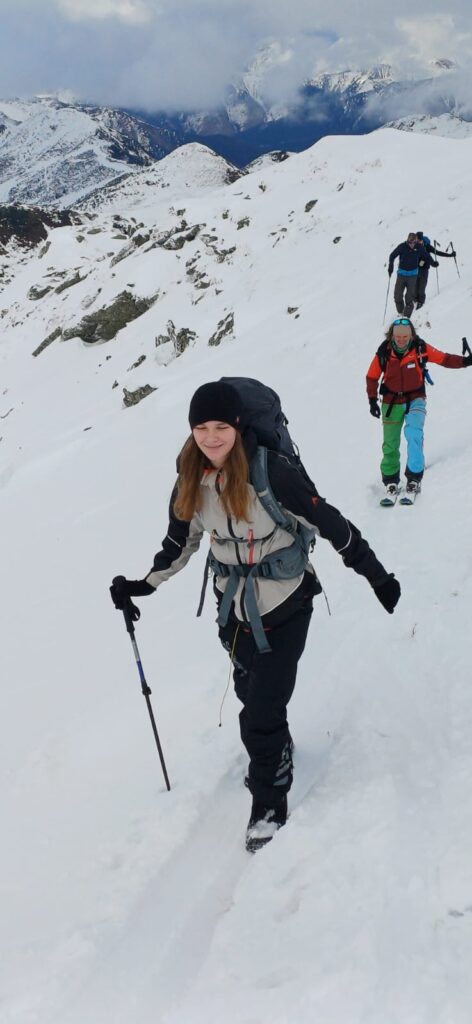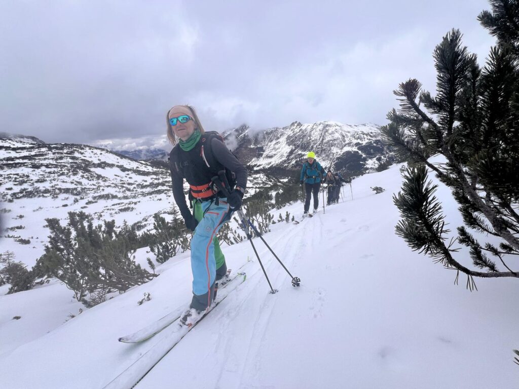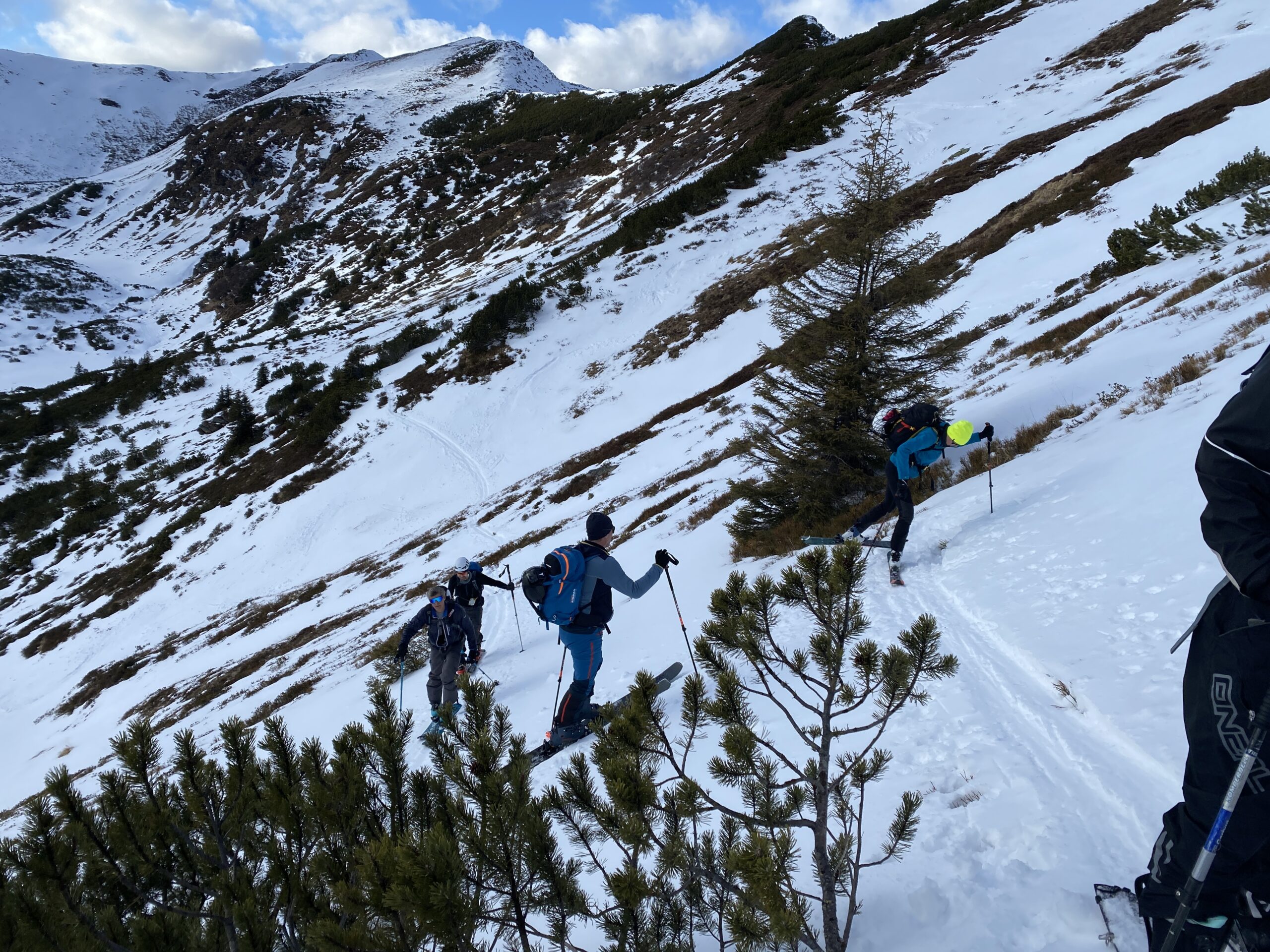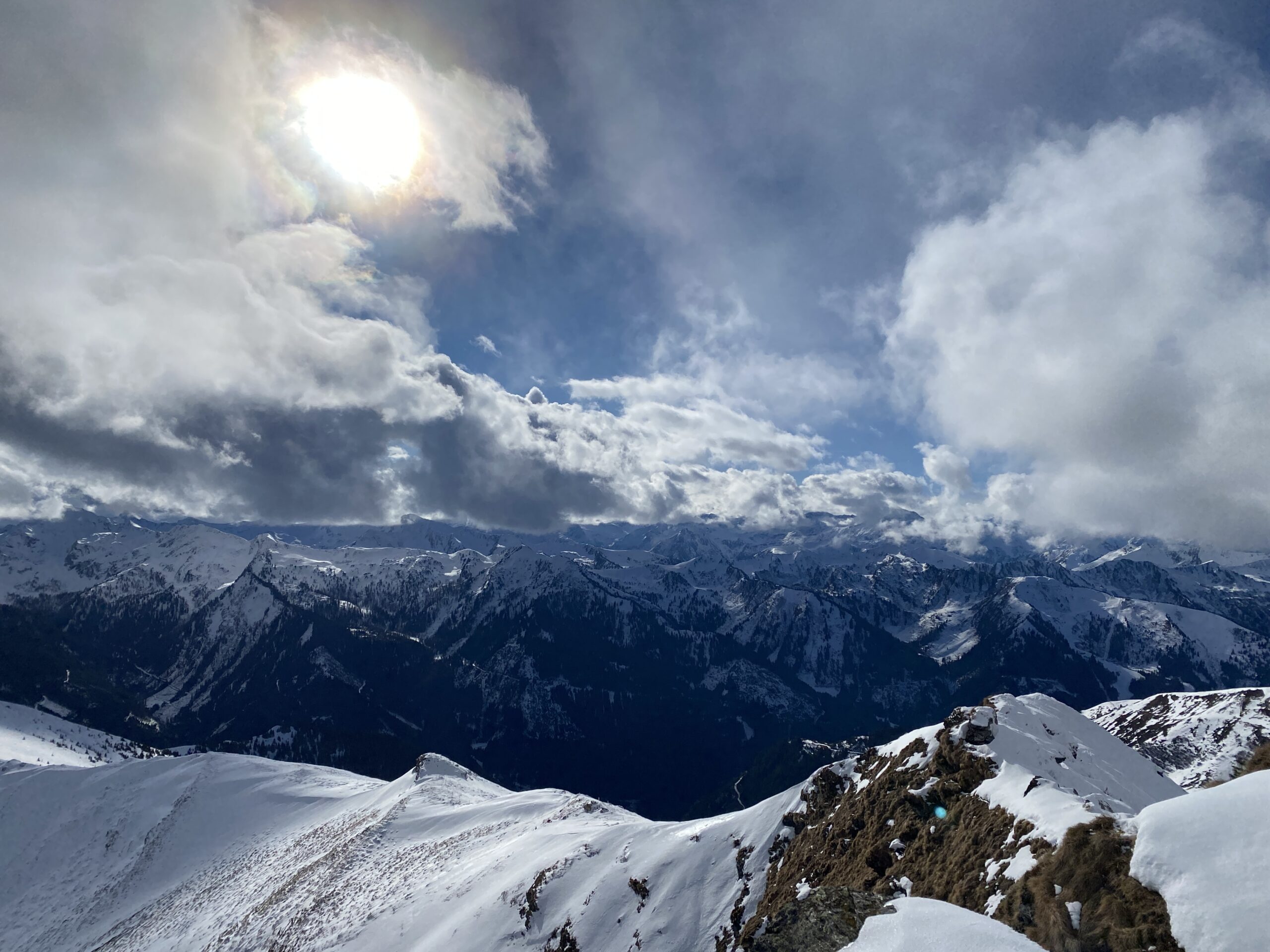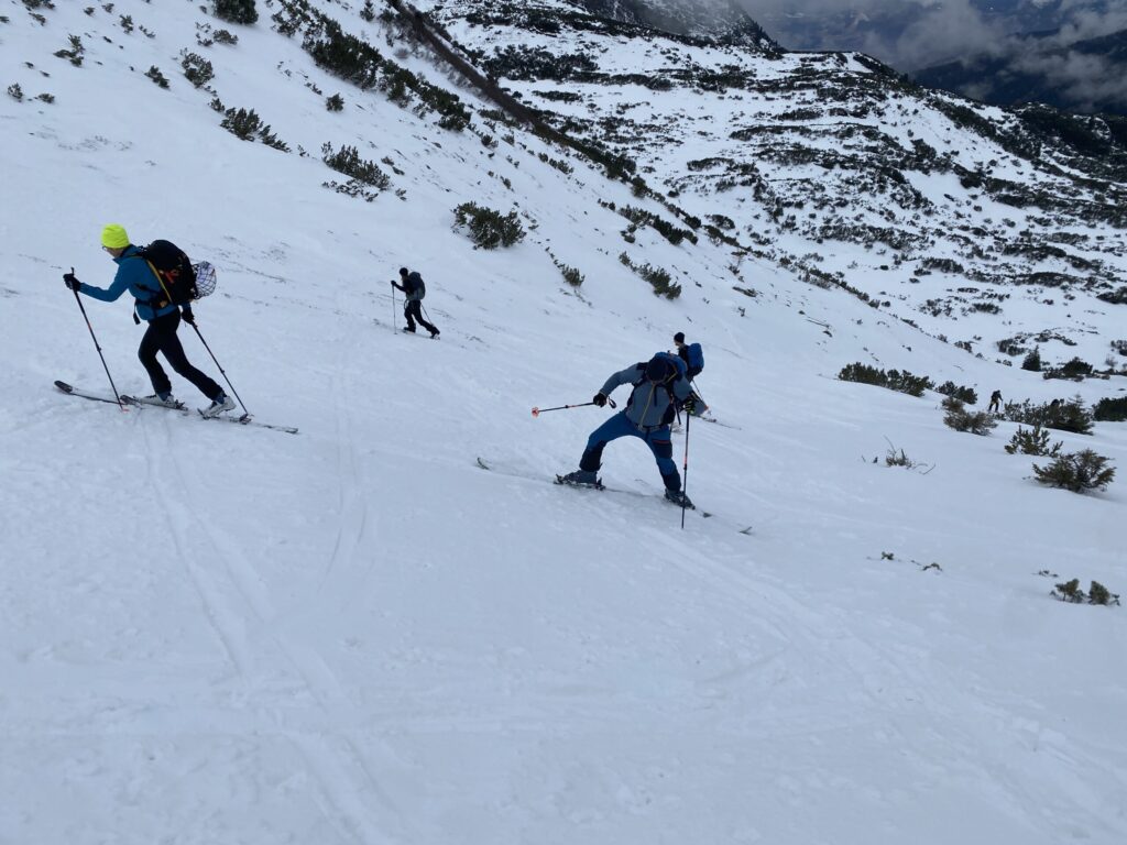 Der Skitourenkurs für Anfänger:innen und Aufsteiger:innen wird dieses Jahr nur von Aufsteiger:innen gebucht. So sind die drei Skitouren bei sehr feinen Wetterbedingungen und wenig Schnee von Anfang an auf hohem Niveau angesiedelt. Andrea hat heuer mit dem Skitouren angefangen und ist voll Motivation und mit ihrer ganzen Bergerfahrung eingestiegen. Karl und Martin sind schon erfahrene Skitourengeher, mit denen ich in den letzten Jahren schon einige Male sehr fein am Berg unterwegs war. Jana, die Tochter von Martin ist am Sonntag das erste mal mit dem Splitboard unterwegs und zeigt eine enorme Lernkurve auf der Tour, bringt aber sehr viel mit!