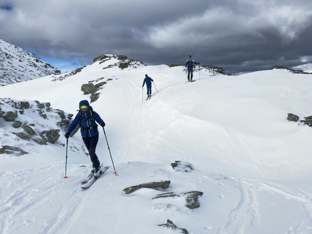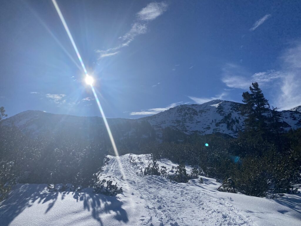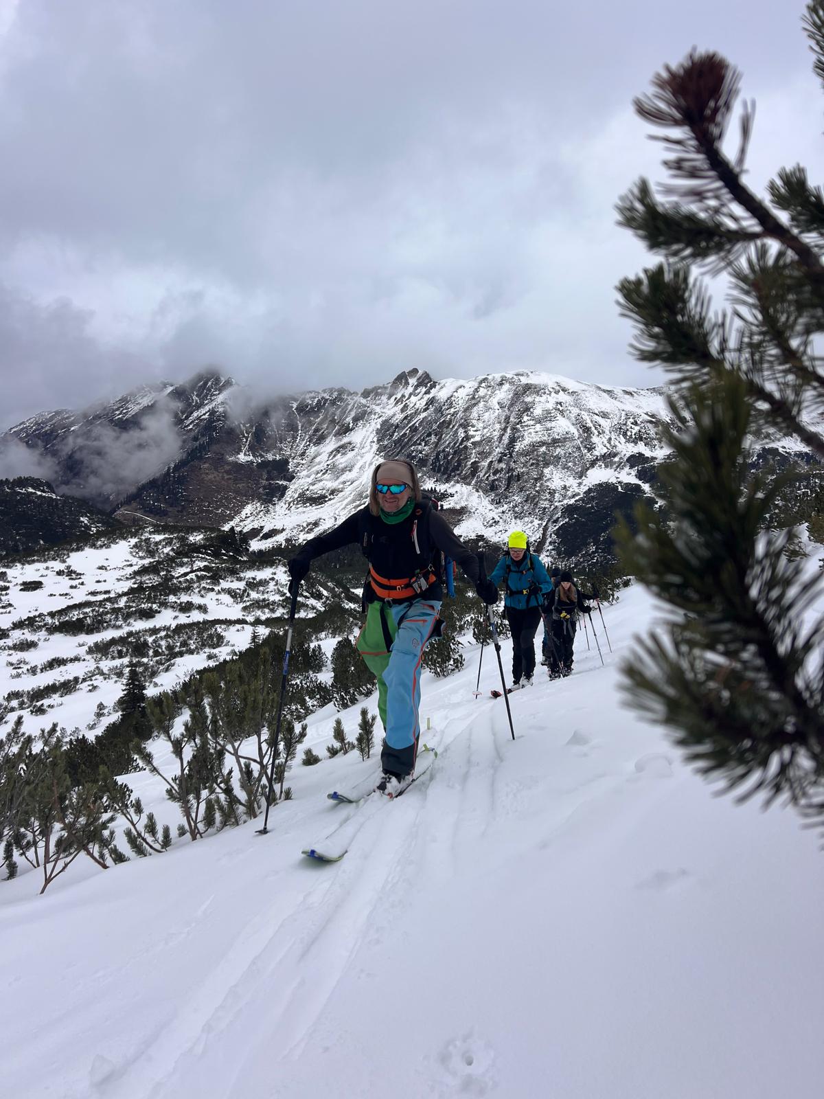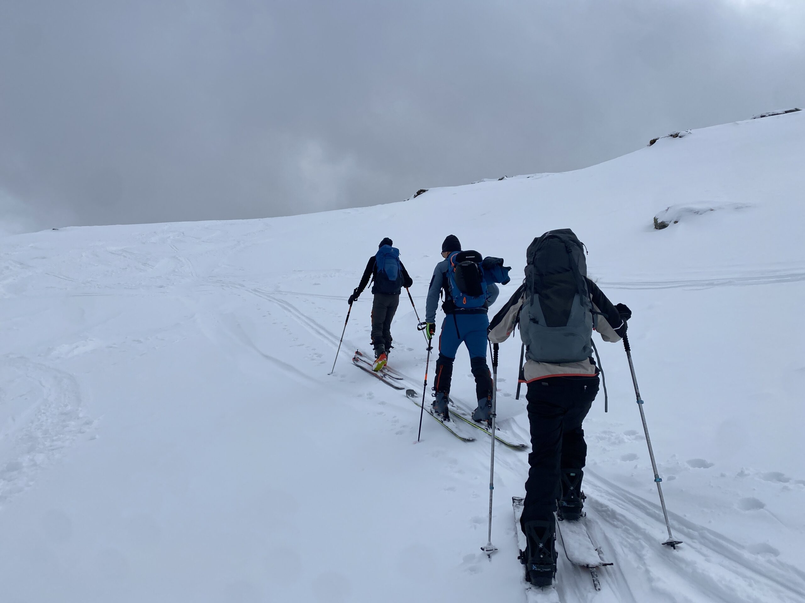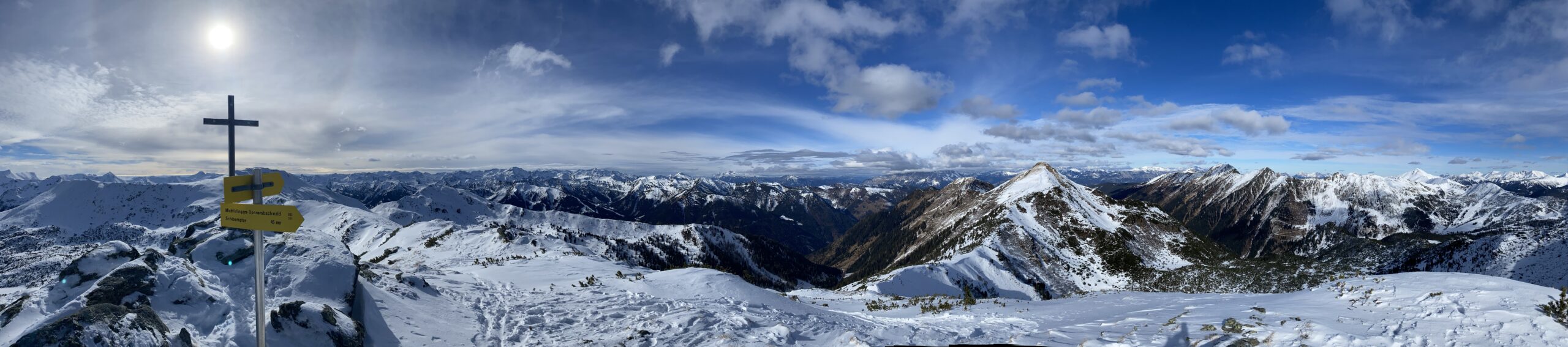 Der Skitourenkurs für Anfänger:innen und Aufsteiger:innen wird dieses Jahr nur von Aufsteiger:innen gebucht. So sind die drei Skitouren bei sehr feinen Wetterbedingungen und wenig Schnee von Anfang an auf hohem Niveau angesiedelt. Andrea hat heuer mit dem Skitouren angefangen und ist voll Motivation und mit ihrer ganzen Bergerfahrung eingestiegen. Karl und Martin sind schon erfahrene Skitourengeher, mit denen ich in den letzten Jahren schon einige Male sehr fein am Berg unterwegs war. Jana, die Tochter von Martin ist am Sonntag das erste mal mit dem Splitboard unterwegs und zeigt eine enorme Lernkurve auf der Tour, bringt aber sehr viel mit!