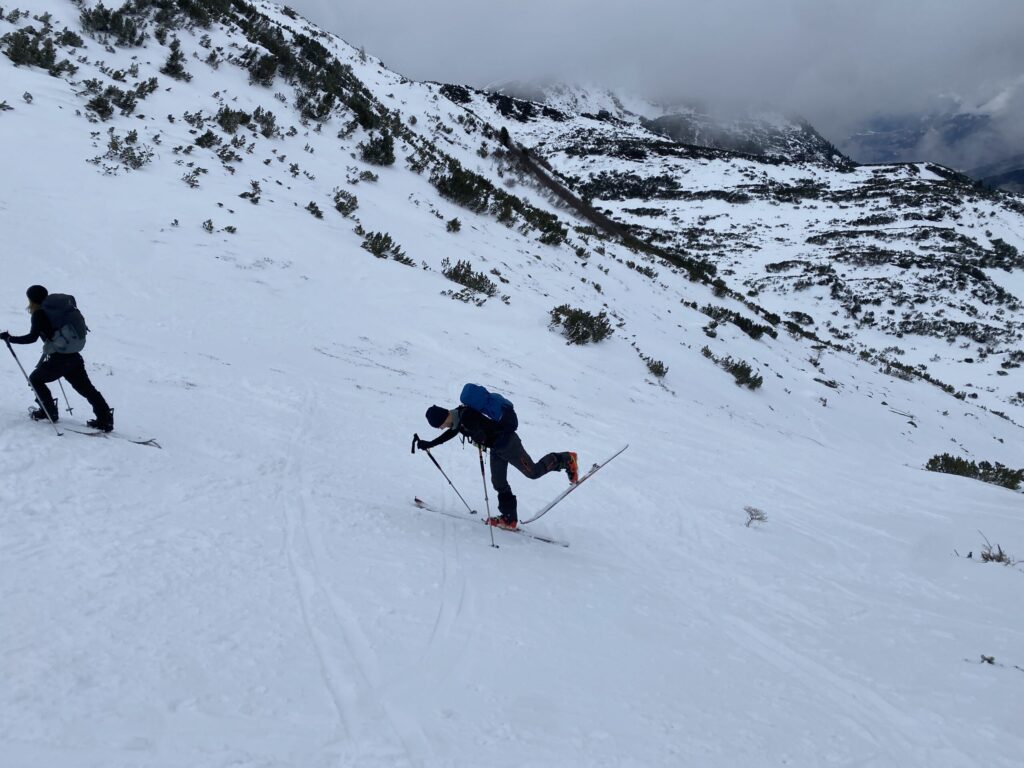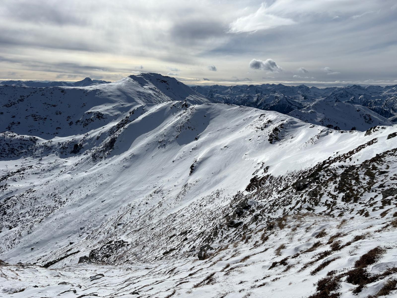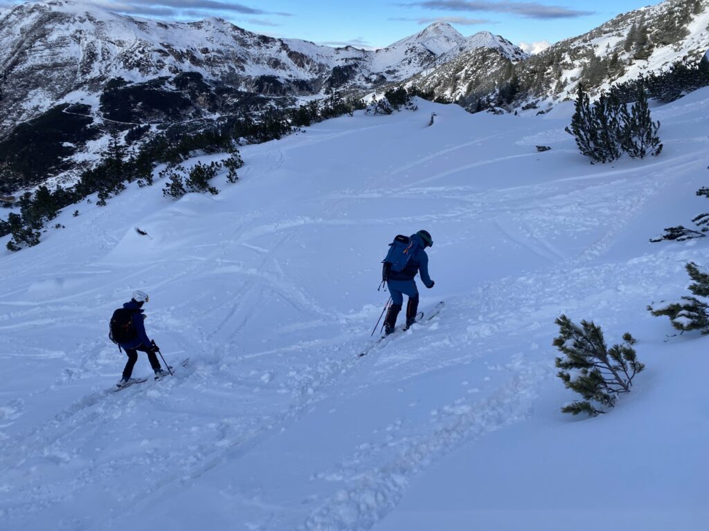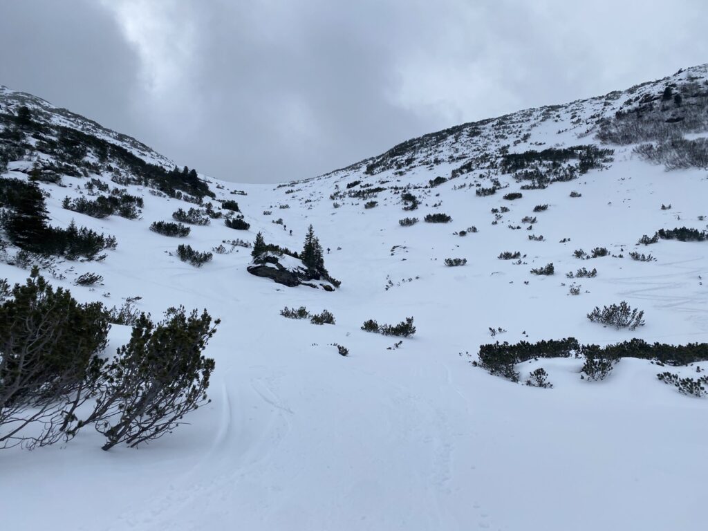 Die erste Tour am Freitag führt uns auf den Karlspitz. Dabei begleitet uns die Sonne und erst am Gipfel frischt der Wind auf. Er bringt auch die graue nordwestliche Zwischenfront herein. Wir Jausnen noch im Gipfe-Lee und machen uns dann an etwas herausfordernden Abfahrt über den Nordosthang vom östlichen Vorgipfel. Oben ist der Schnee deutlich gepresst, nach unten wird er besser zu fahren. Dann geht es mit Dr. Latschen zurück zum Plannerkessel und zum Quartier. Dort verbringen wir mehrere Stunden mit Karten, Lawinen, Schnee und Wetter bis sich das Gähnen mehrfach in die Dialoge schleicht und wir ins Bett gehen.
