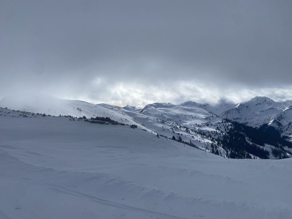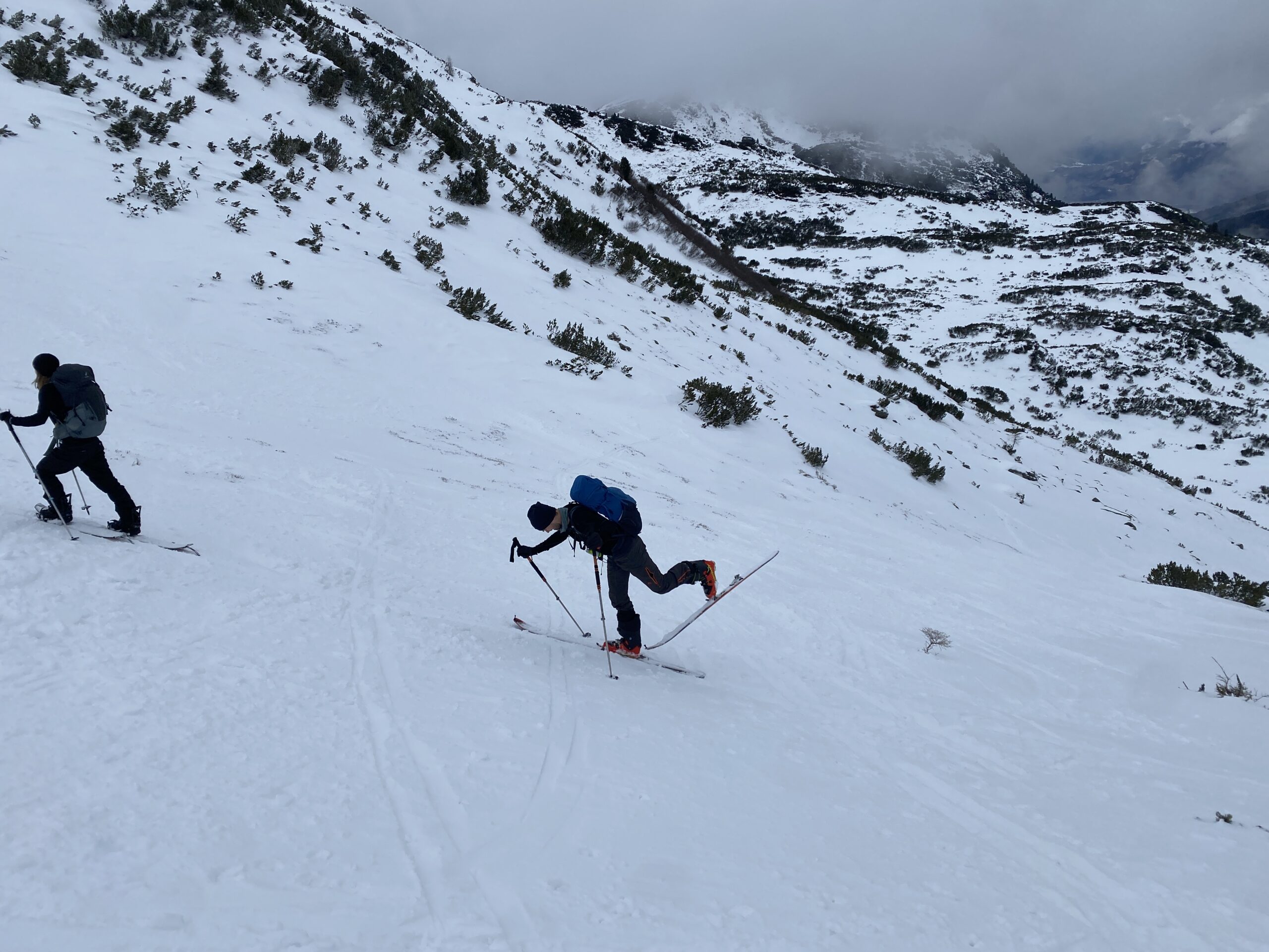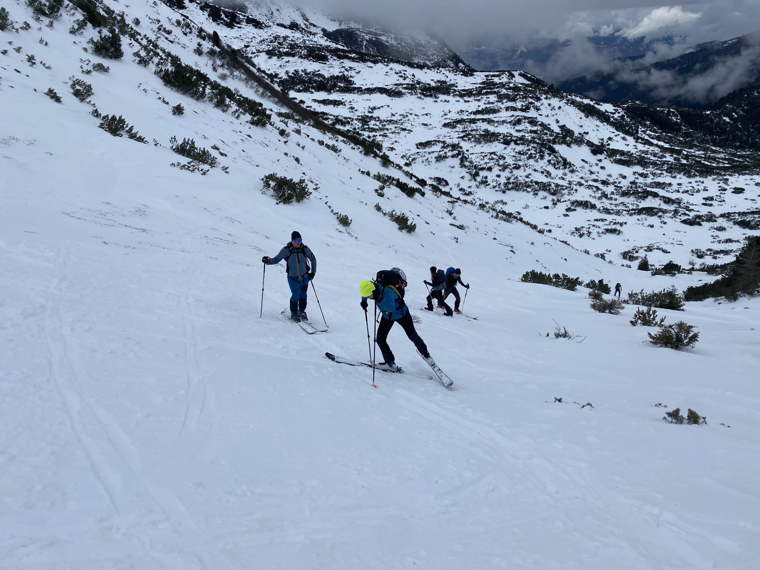 Die erste Tour am Freitag führt uns auf den Karlspitz. Dabei begleitet uns die Sonne und erst am Gipfel frischt der Wind auf. Er bringt auch die graue nordwestliche Zwischenfront herein. Wir Jausnen noch im Gipfe-Lee und machen uns dann an etwas herausfordernden Abfahrt über den Nordosthang vom östlichen Vorgipfel. Oben ist der Schnee deutlich gepresst, nach unten wird er besser zu fahren. Dann geht es mit Dr. Latschen zurück zum Plannerkessel und zum Quartier. Dort verbringen wir mehrere Stunden mit Karten, Lawinen, Schnee und Wetter bis sich das Gähnen mehrfach in die Dialoge schleicht und wir ins Bett gehen.