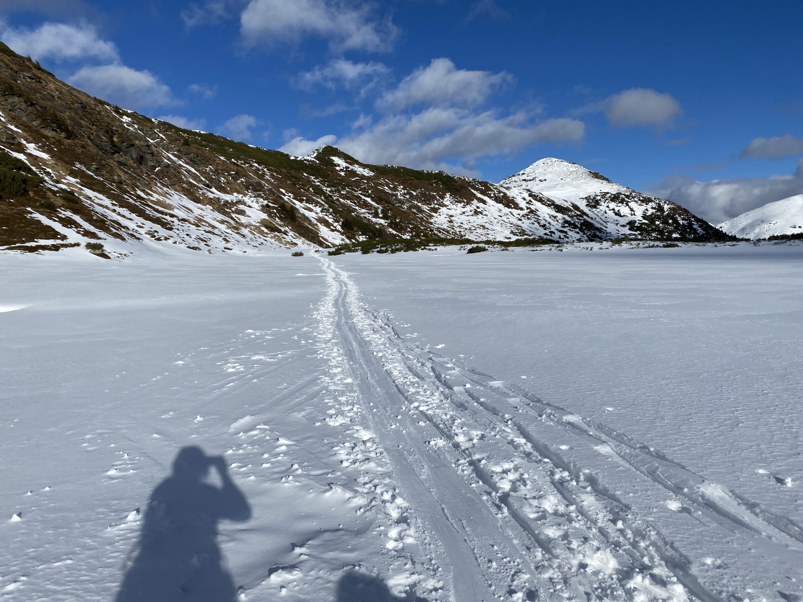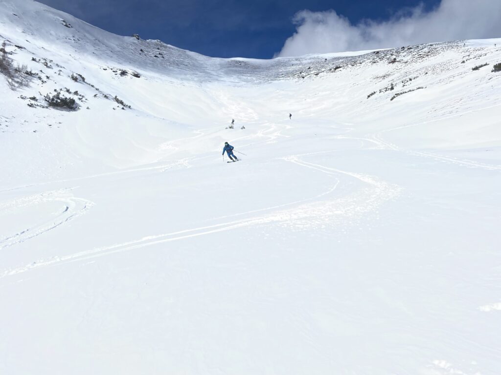 Die Abfahrt vom östlichen Vorgipfel vom Karlspitz ist wegen dem starken Windeinflusses nicht zu empfehlen. Die Goldbachscharte hat sehr wenig Schnee. Bei der Abfahrt zum Goldbachsee finden sich Bruchharschinseln zwischen schneefrei-Feldern. Der Gipfelhang des Hintergullingspitz und des Schreindls sind gefüllt mit Triebschneepulver gefüllt, der gut zu fahren ist. Südseitig sind wir den tragfähiger Deckel mit feiner frischer Auflage befahren. Ab 1800 HM wurde es wegen dem Sonneneintrag schnittig.