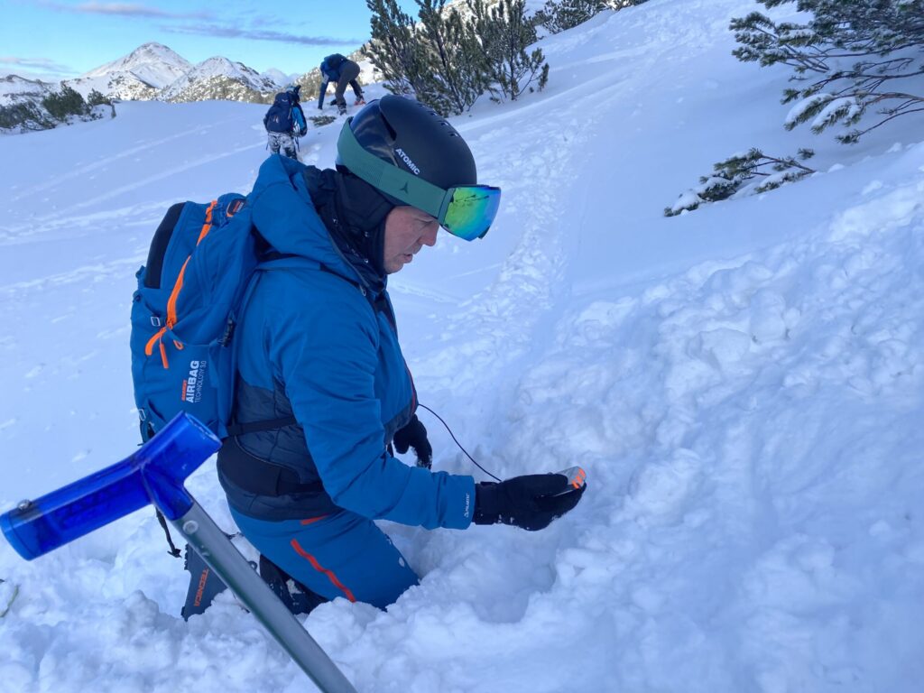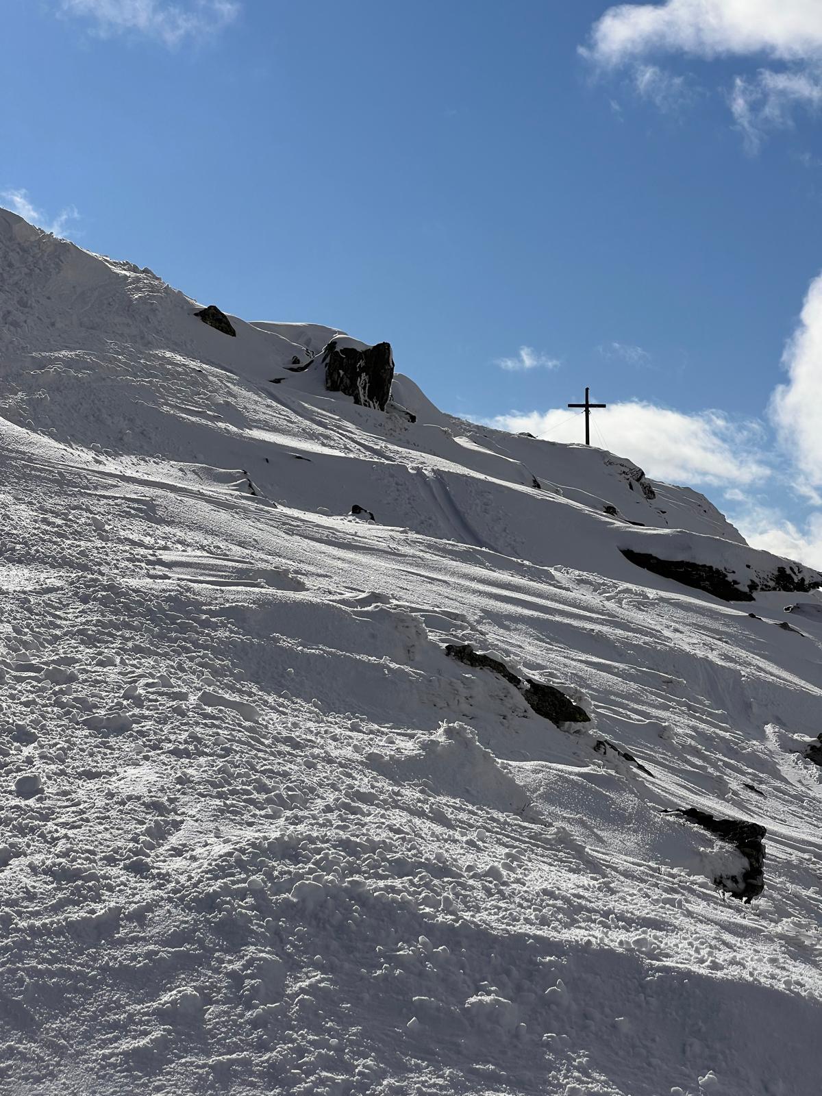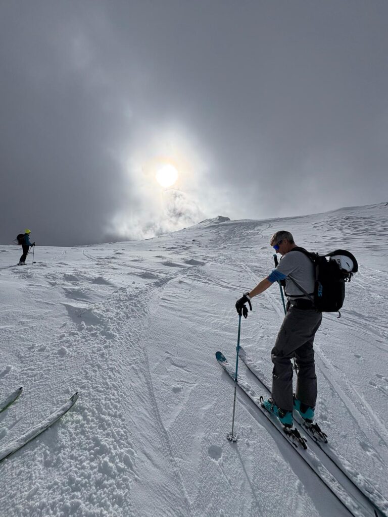 Am Samstag geht es mit dem Gläserbodenlift hinauf und etwas schneearm und deshalb teilweise rutschend hinunter zum Dientensattel und weiter in den Zwischentalboden vor der Hintergullingspitze. Den Aufstieg zum Gipfel begleitet uns die Sonne und taucht den Nordwesthang in herrliches Licht. Mit wechselnder Führung erreichen wir den Kamm und den Gipfel. Die Südwestseite lassen wir sein und fahren wie geplant die Südostseite ab. Dort ist eine feine Triebschneeauflage auf tragendem Untergrund gut zu fahren. Erst im Kessel sind einige Meter schnittiger Harschdeckel bevor es weich wird. Wir geniessen die Jause und Sonne und steigen dann wieder zum Hintergullingspitz auf und fahren die Nordwestseite in lässige zu fahrenden Triebschnee ab. Im Hang testen wir die Schneedecke und der ECT24 ist ganz ok. Aber schon ein paar Meter weiter schaut es nicht mehr so gut aus. Wir bleiben also vorsichtig und defensiv. Im Skigebiet treffen wir Jana und machen eine Lawinenübung. Ich versinke schon beim Vergraben soweit im Schnee, dass ich nur mit Mühe wieder herauskomme und die weitern Vorbereitungen auf Skiern mache.