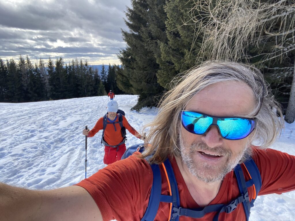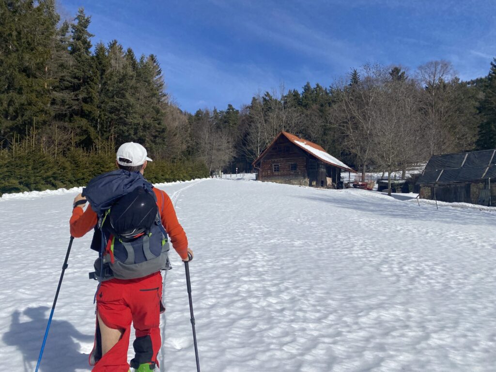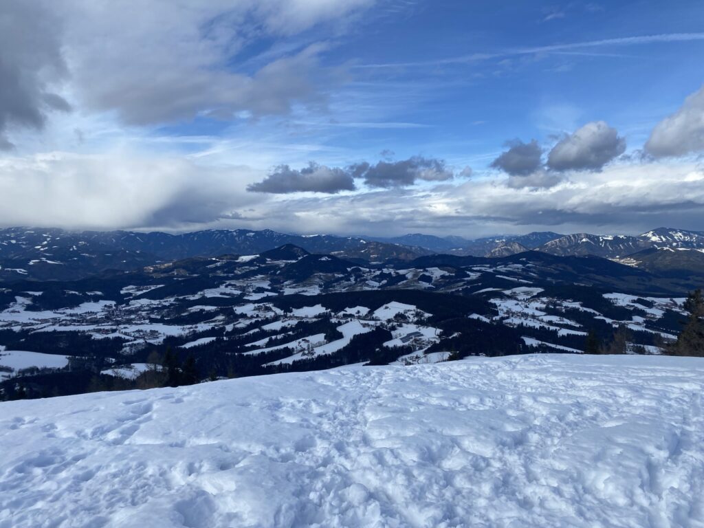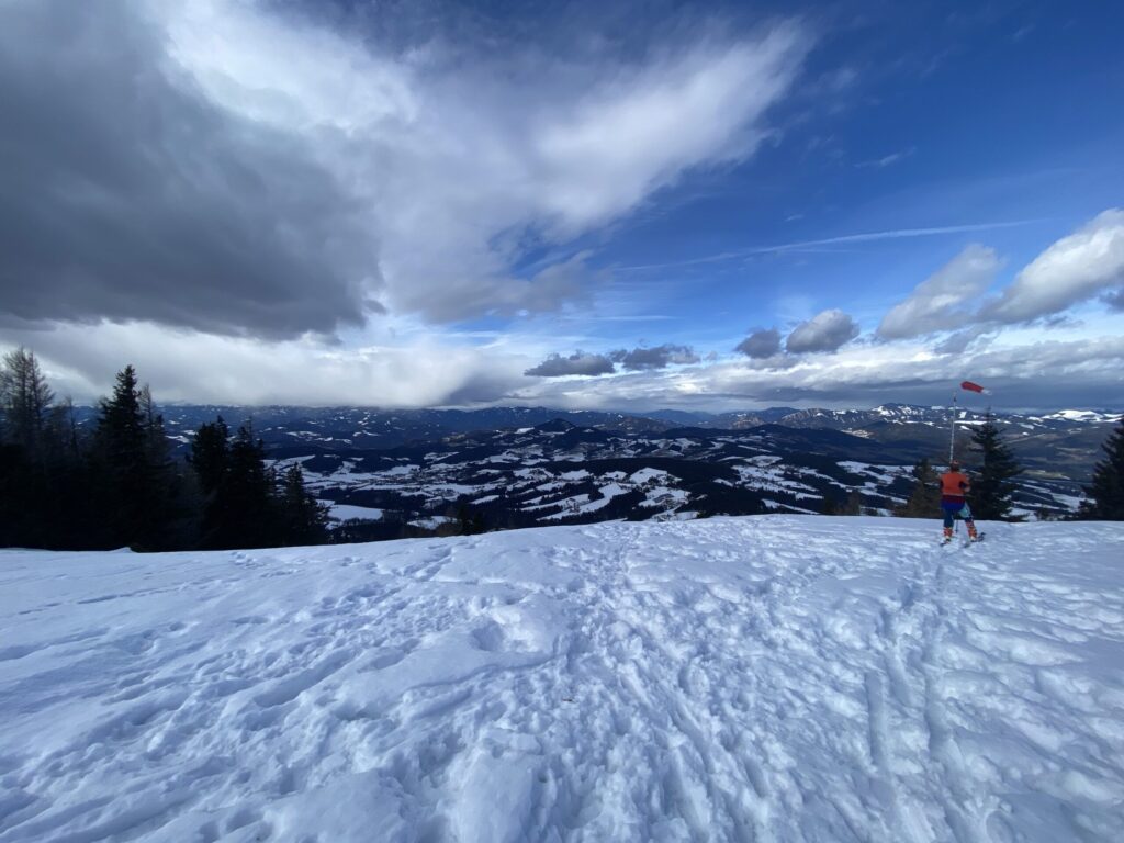 Spontan geht es heute zu Mittag aus dem Steingraben auf den Schöckl. Es ist warm und viel Schnee ist Wasser. Trotzdem gehen wir direkt vom Auto los und steigen in der warmen Sonne auf. Zügig geht es hinauf und etwas besorgt sehen wir einige Steine am Weg. Immer wieder ziehen Wolken durch und die Wärme weicht dem frischen Wind. Auf der Schneid wird er Wind dann deutlich mehr, aber im Leiberl geht es bis zum Gipfel. Erst ganz oben flüchten wir nach einem Gipfelfoto in den Windschatten. Das Wolkenspiel ist herrlich. Aus dem Nordwesten stauen die Wolken an die Gleinalm und den Hochschab und wir nutzen die letzten Sonnenstrahlen für die Abfahrt, nach zumindest ich alle Riegel aufgegessen habe. Runter geht es dann viel besser als erwartet. Die freie Fläche mit Sonneneinstrahlung bremsen recht, aber im Wald geht es gut. Steine können wir mit achtsamer Fahrweise gut vermeiden. Und mit einer einzigen Strassenquerung fahren wir bis zum Auto. Lässig wars. So könnte es im Winter immer wieder sein. 30 Minuten Anfahrt, dann zwei Stunden Tour mit 700 Höhenmeter so passt das sehr gut.