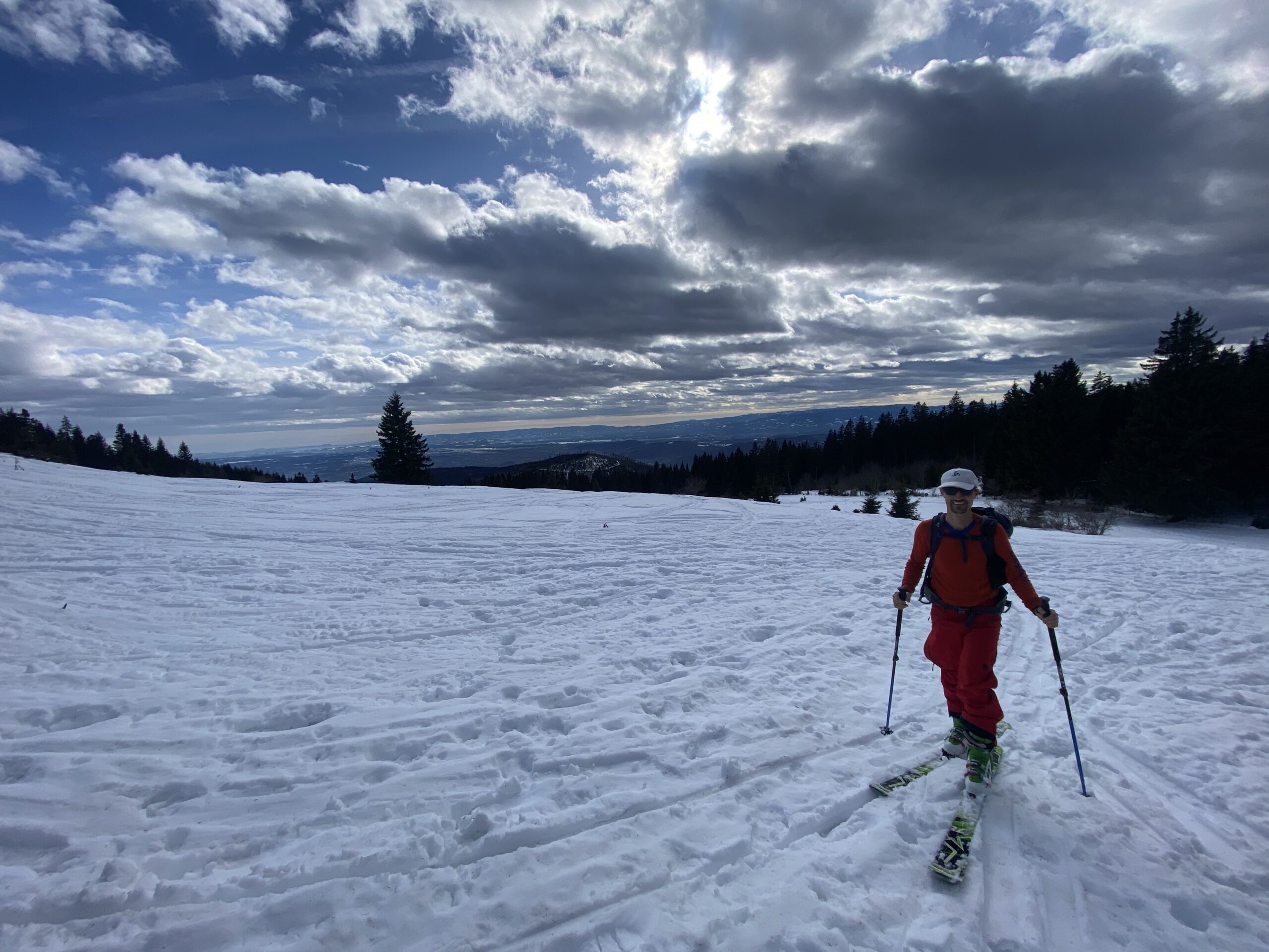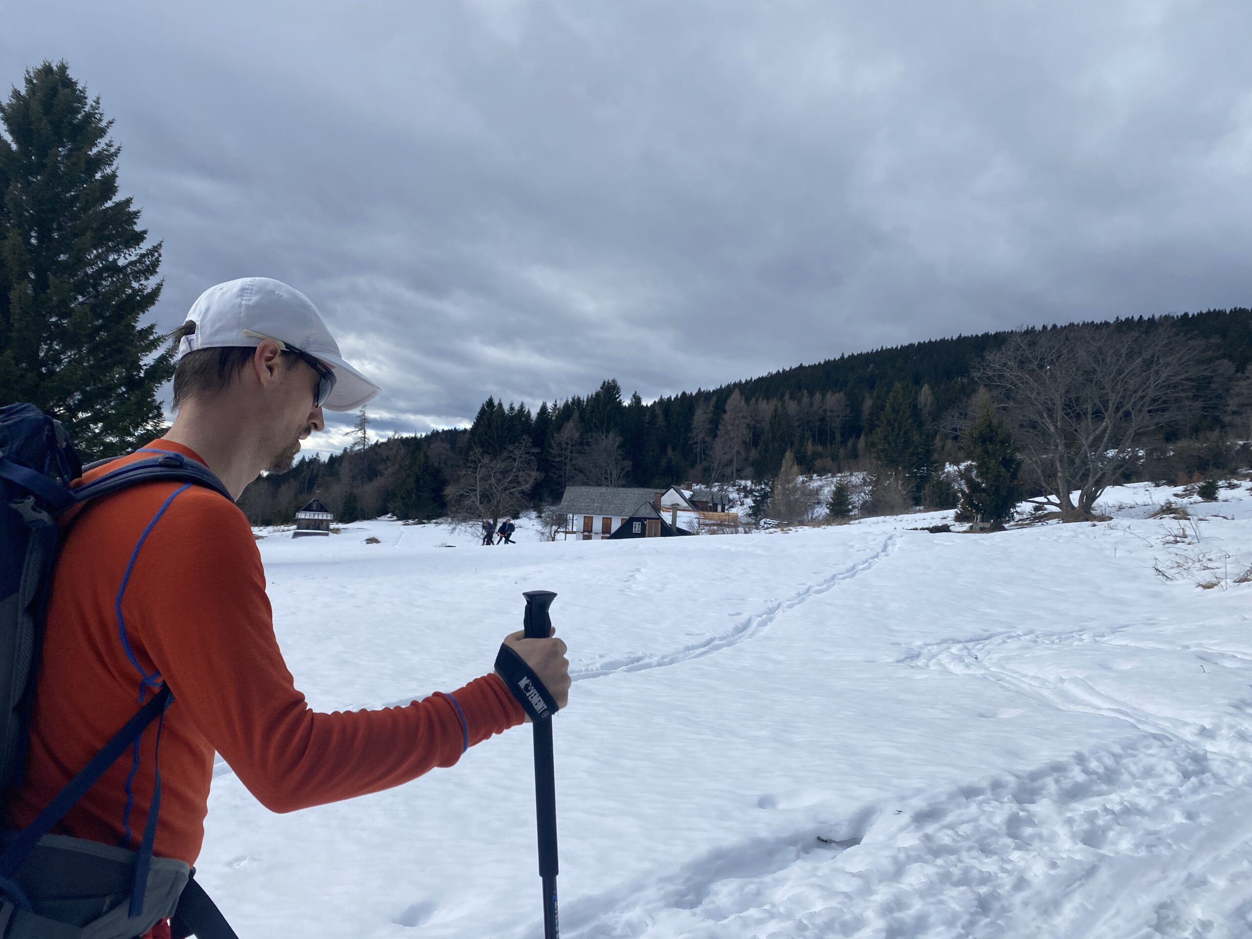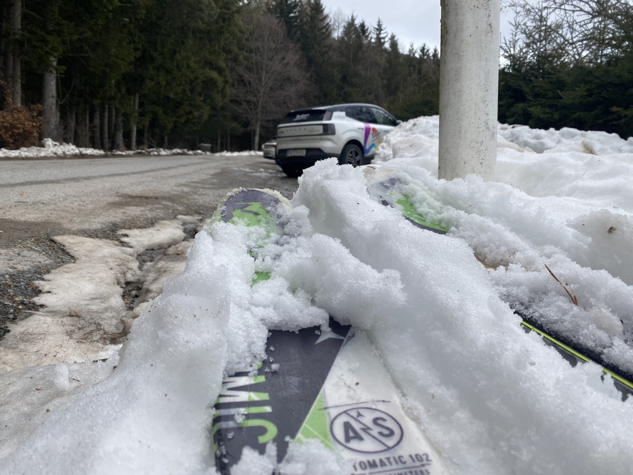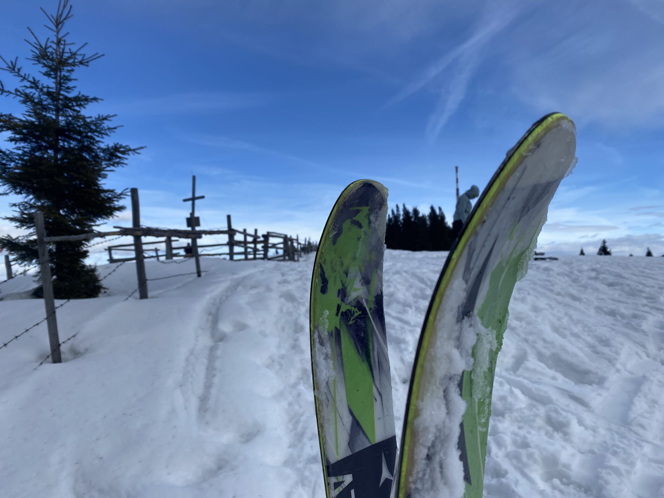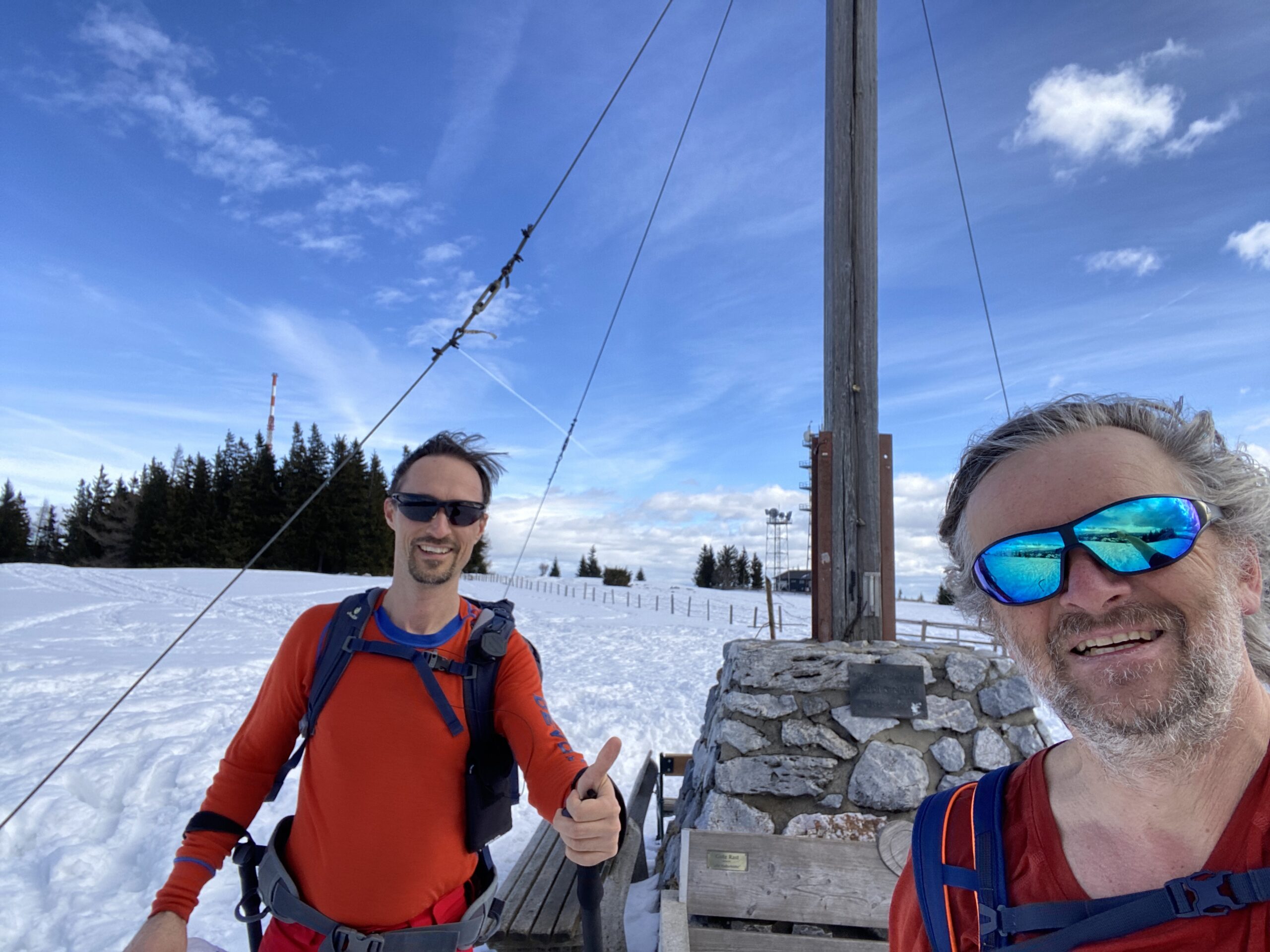 Spontan geht es heute zu Mittag aus dem Steingraben auf den Schöckl. Es ist warm und viel Schnee ist Wasser. Trotzdem gehen wir direkt vom Auto los und steigen in der warmen Sonne auf. Zügig geht es hinauf und etwas besorgt sehen wir einige Steine am Weg. Immer wieder ziehen Wolken durch und die Wärme weicht dem frischen Wind. Auf der Schneid wird er Wind dann deutlich mehr, aber im Leiberl geht es bis zum Gipfel. Erst ganz oben flüchten wir nach einem Gipfelfoto in den Windschatten. Das Wolkenspiel ist herrlich. Aus dem Nordwesten stauen die Wolken an die Gleinalm und den Hochschab und wir nutzen die letzten Sonnenstrahlen für die Abfahrt, nach zumindest ich alle Riegel aufgegessen habe. Runter geht es dann viel besser als erwartet. Die freie Fläche mit Sonneneinstrahlung bremsen recht, aber im Wald geht es gut. Steine können wir mit achtsamer Fahrweise gut vermeiden. Und mit einer einzigen Strassenquerung fahren wir bis zum Auto. Lässig wars. So könnte es im Winter immer wieder sein. 30 Minuten Anfahrt, dann zwei Stunden Tour mit 700 Höhenmeter so passt das sehr gut.