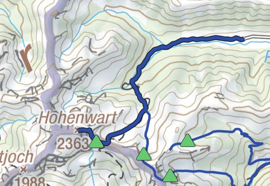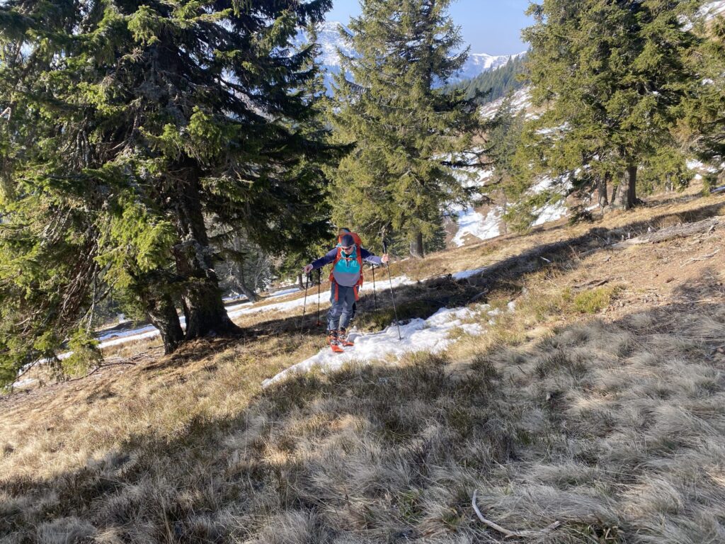 Einmal, beim Hohenwart nordöstlich, mit einer wunderbaren östlichen Flanke für die Abfahrt und im Falle des Bösensteins wäre sogar eine nordöstliche Abfahrt über den Gipfelhang des Kleinen Bösensteins möglich. Die Rote Rinne wäre ebenfalls östliche Ausrichtung. Es braucht als auf jeden Fall eine möglichst einfache Abfahrtsvariante, weil ohne Firn in allen Expositionen Bruchharsch oder ein tragender Harschdeckel zu erwarten ist.