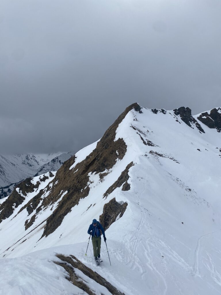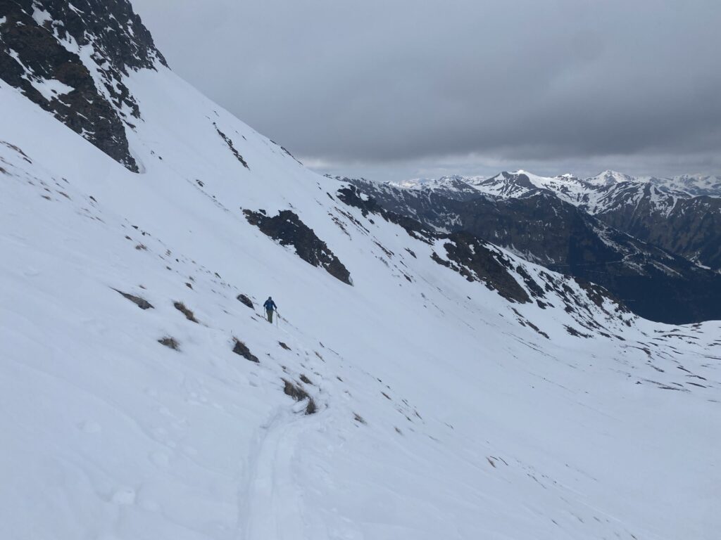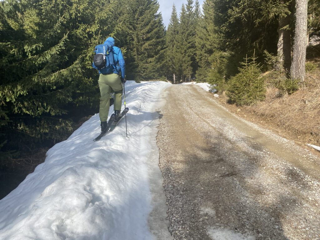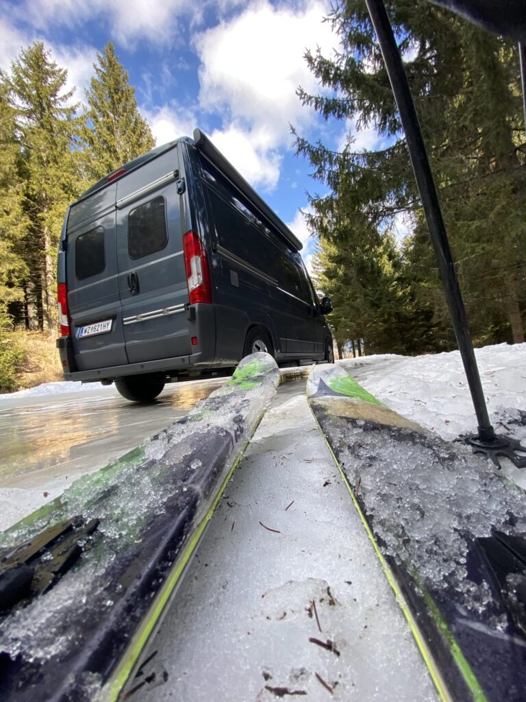 Gemeinsam mit Wolfgang geht es vor der SV-Weiz-Skitour im Wohnmobil nach Hinterwinkle bei Pusterwald. Wir starten um neun vom Parkplatz, auf dem nur ein einziges Auto steht, und steigen die eisige Forststrasse bis zur Pölsenalm hinauf. Nach einer guten Stunde erreichen ihr die Alm. Von dort wenden wir uns nach Süden und nehmen den etwas steilen Weg durch eine enge Rinne hinauf zum Kar bei den Hansln. Der Wind pfeift durch das Kar und immer wieder wechseln dunkle Wolken mit ein paar Sonnenstrahlen. Wir steigen in den gut 30 Grad steilen Hang ein und zur Sicherheit, immerhin sind wir im Nordsektor unterwegs graben wir einen Blocktest. Dieser ist nicht auszulösen. Also steigen wir bis zur Scharte und noch einige Meter hinauf zum Gipfel. Aber der Wind auf der Südseite und die rutschige Schneeauflage auf der Nordseite zeigen uns unsere Grenzen. Wir suchen also einen Platz im Lee und machen eine Pause, bauen dann für die Abfahrt um. Dann überrascht uns der frische Triebschnee und wir genießen die Abfahrt ins Kar. Weil es so schön war und die Sonne immer mehr herauskommt steigen wir ein weiteres Mal auf. Bei der zweiten Abfahrt geht es dann zurück zur Pölsenalm und von dort über die Forststrasse bis zum Parkpatz auf Skiern zurück zum WoMo von Wolfgang. Nach einem Sonnenspaziergang und einem herrlichen Abendessen (von AlextoGo) verbringen wir eine dunkle und berauschte (durch den Bach) Nacht am hintersten Parkplatz von Hinterwinkel.