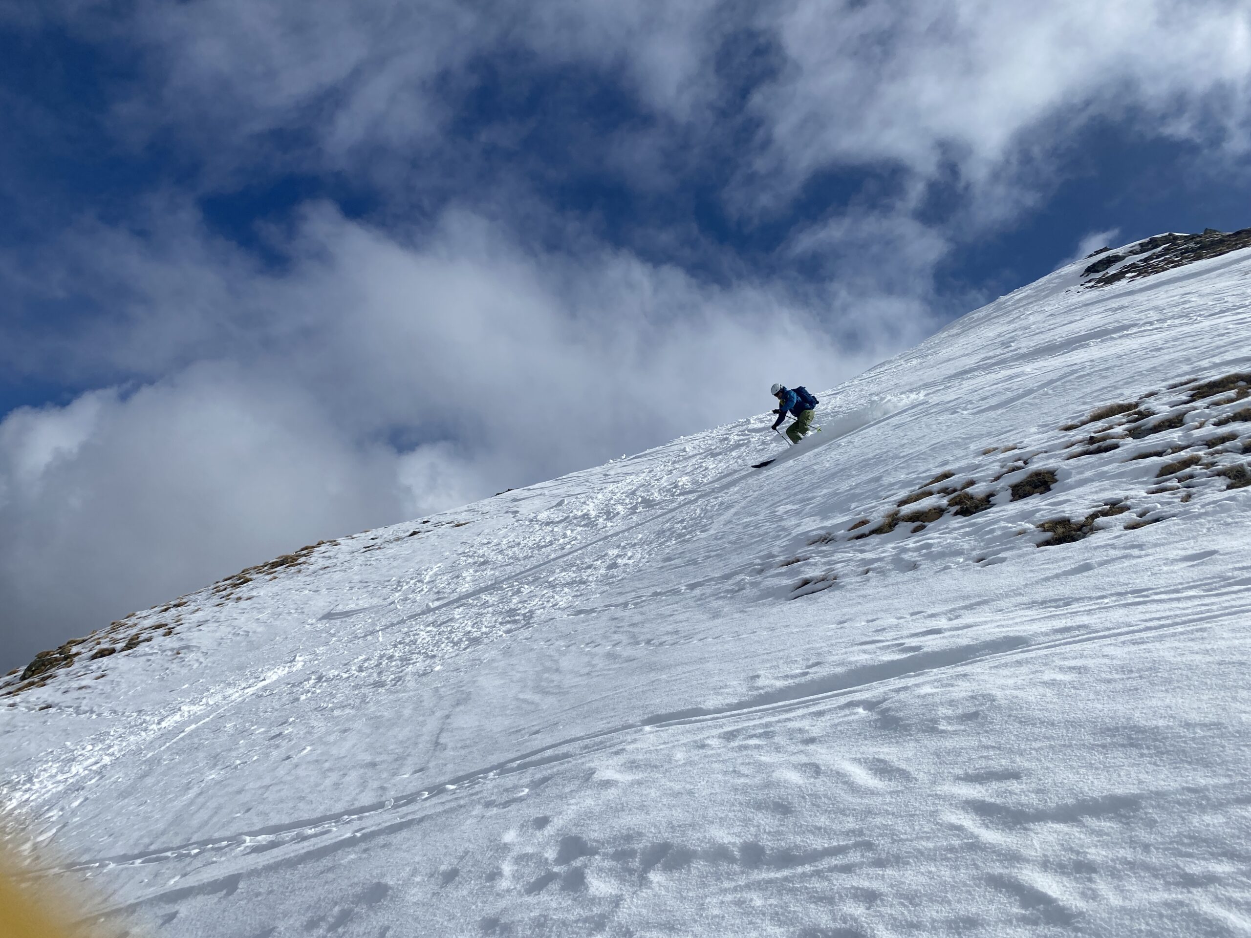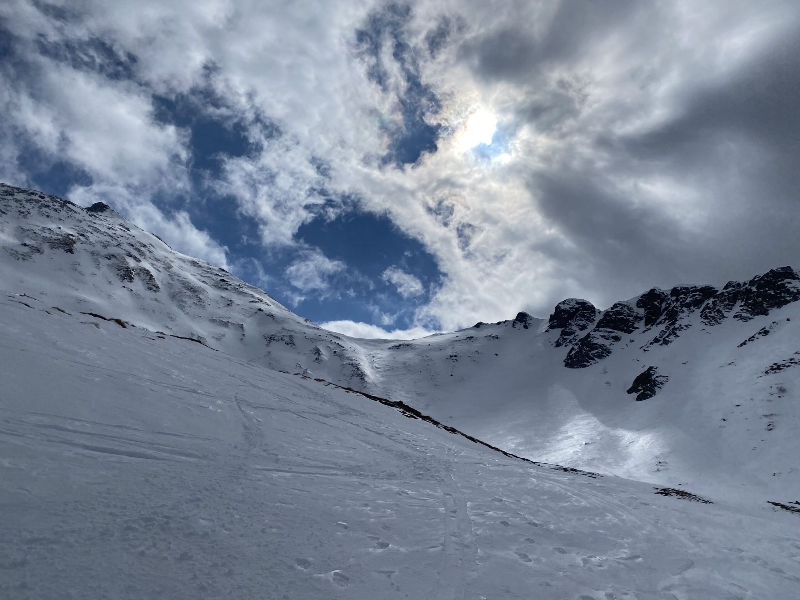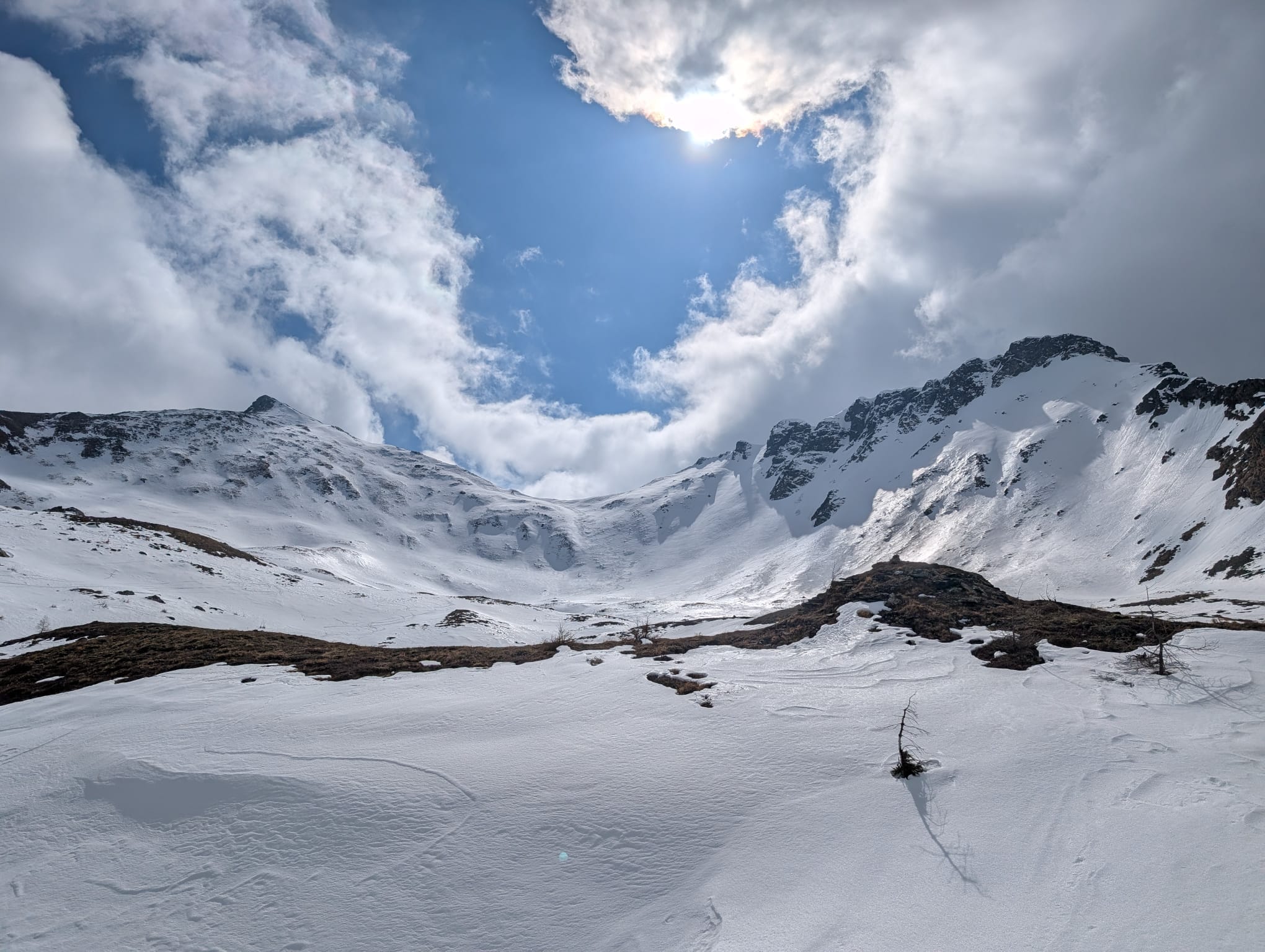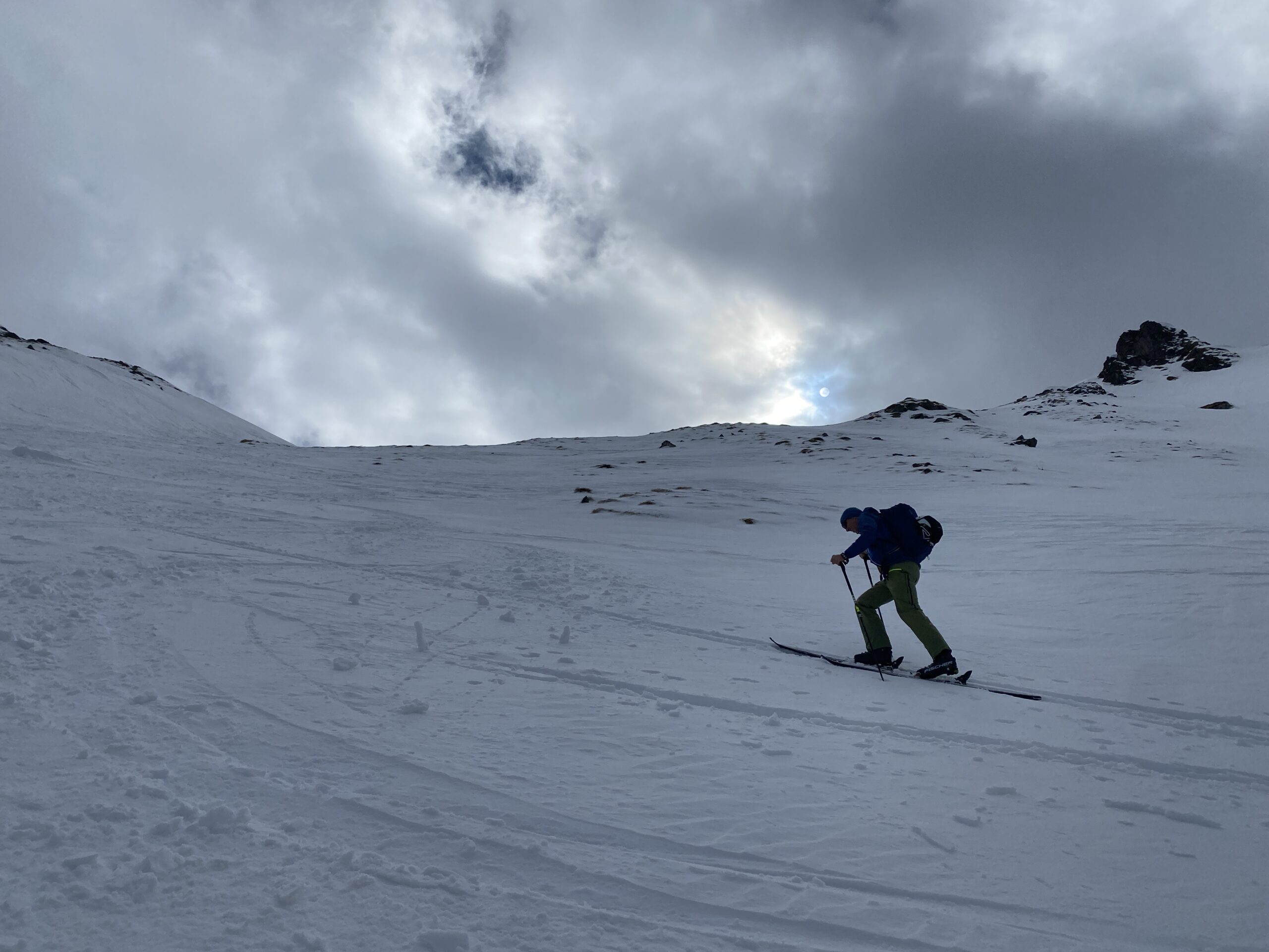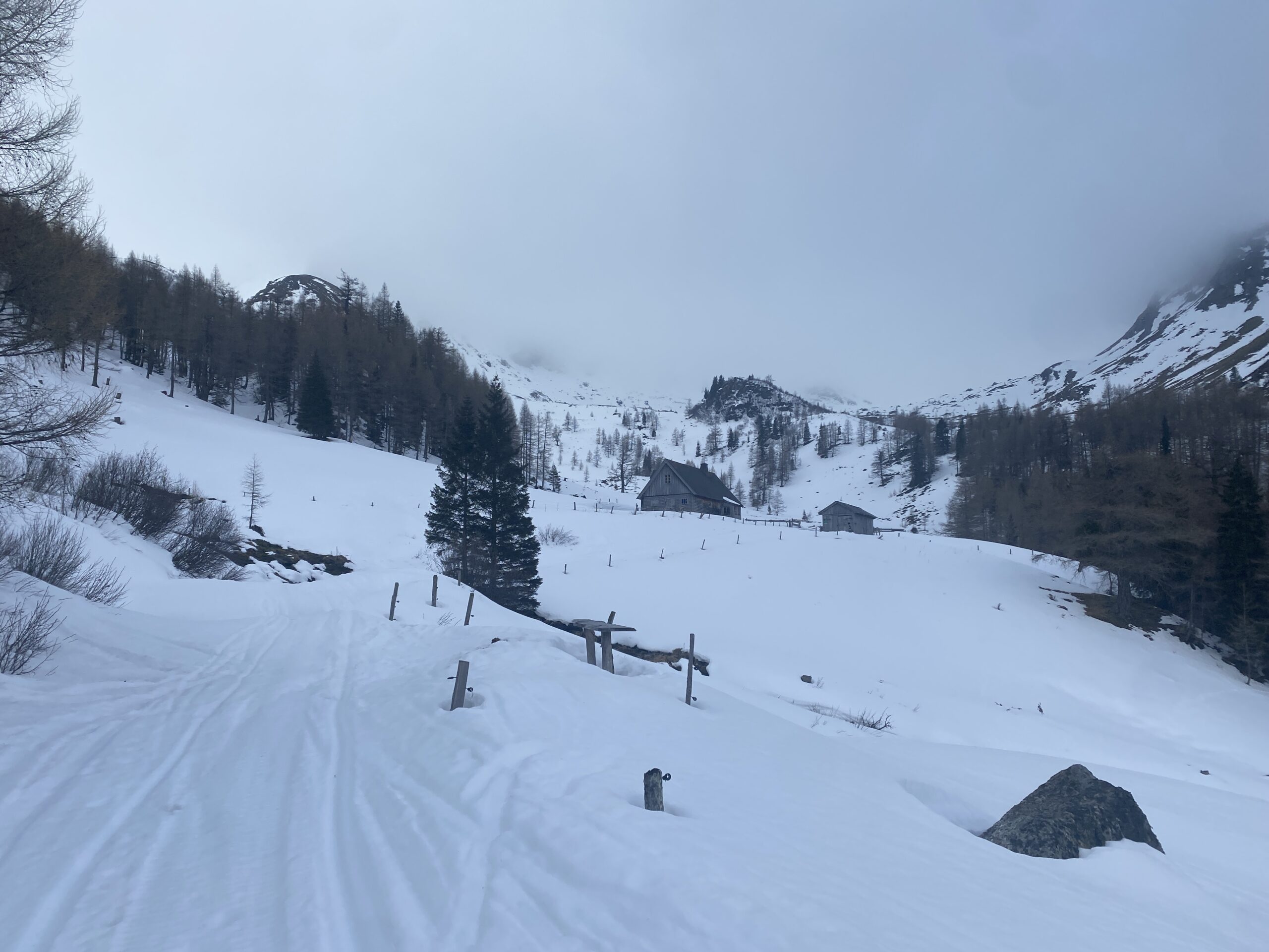 Gemeinsam mit Wolfgang geht es vor der SV-Weiz-Skitour im Wohnmobil nach Hinterwinkle bei Pusterwald. Wir starten um neun vom Parkplatz, auf dem nur ein einziges Auto steht, und steigen die eisige Forststrasse bis zur Pölsenalm hinauf. Nach einer guten Stunde erreichen ihr die Alm. Von dort wenden wir uns nach Süden und nehmen den etwas steilen Weg durch eine enge Rinne hinauf zum Kar bei den Hansln. Der Wind pfeift durch das Kar und immer wieder wechseln dunkle Wolken mit ein paar Sonnenstrahlen. Wir steigen in den gut 30 Grad steilen Hang ein und zur Sicherheit, immerhin sind wir im Nordsektor unterwegs graben wir einen Blocktest. Dieser ist nicht auszulösen. Also steigen wir bis zur Scharte und noch einige Meter hinauf zum Gipfel. Aber der Wind auf der Südseite und die rutschige Schneeauflage auf der Nordseite zeigen uns unsere Grenzen. Wir suchen also einen Platz im Lee und machen eine Pause, bauen dann für die Abfahrt um. Dann überrascht uns der frische Triebschnee und wir genießen die Abfahrt ins Kar. Weil es so schön war und die Sonne immer mehr herauskommt steigen wir ein weiteres Mal auf. Bei der zweiten Abfahrt geht es dann zurück zur Pölsenalm und von dort über die Forststrasse bis zum Parkpatz auf Skiern zurück zum WoMo von Wolfgang. Nach einem Sonnenspaziergang und einem herrlichen Abendessen (von AlextoGo) verbringen wir eine dunkle und berauschte (durch den Bach) Nacht am hintersten Parkplatz von Hinterwinkel.