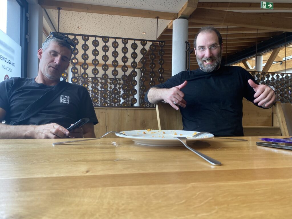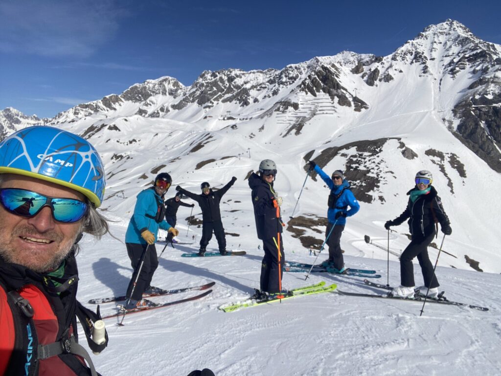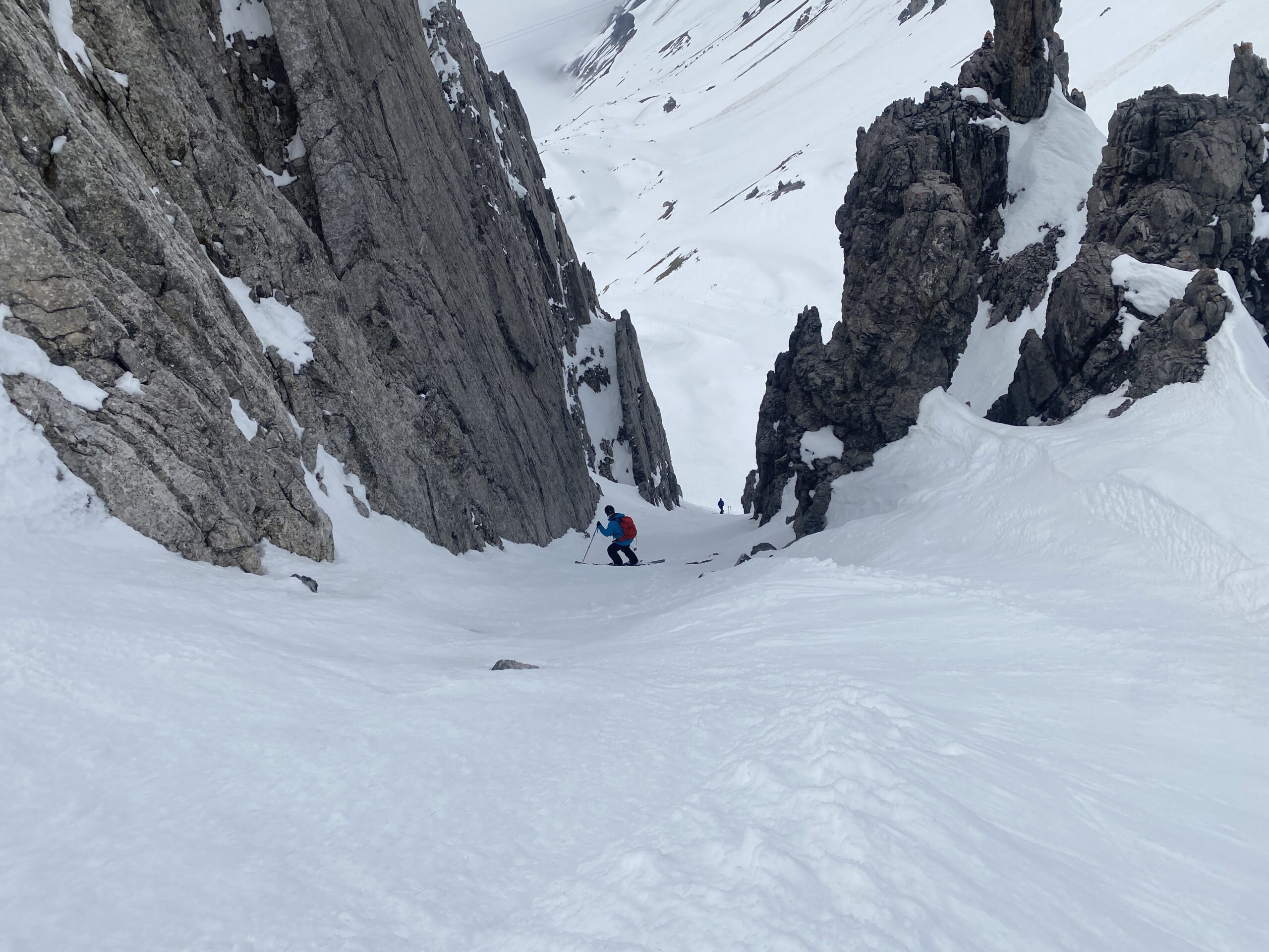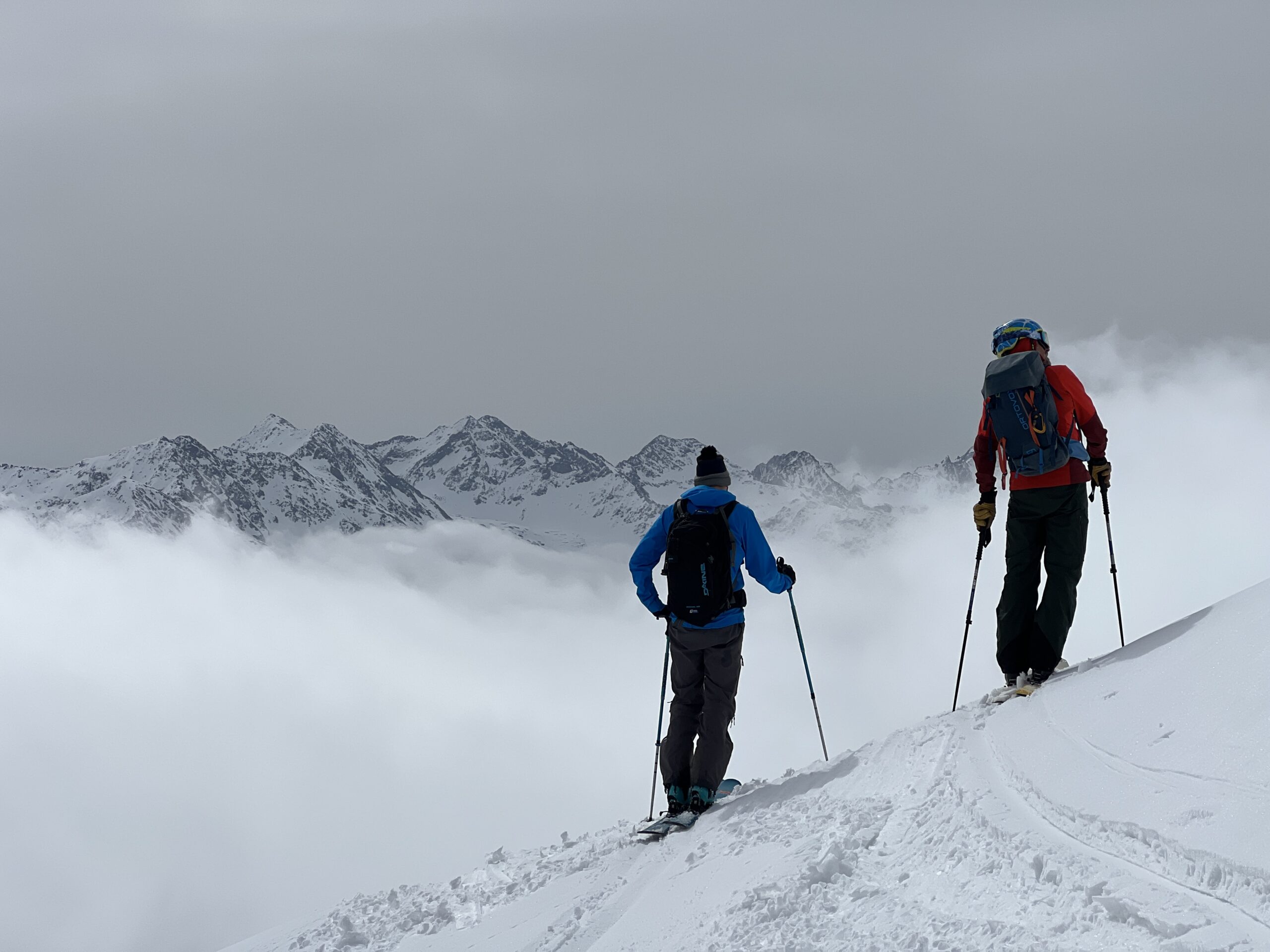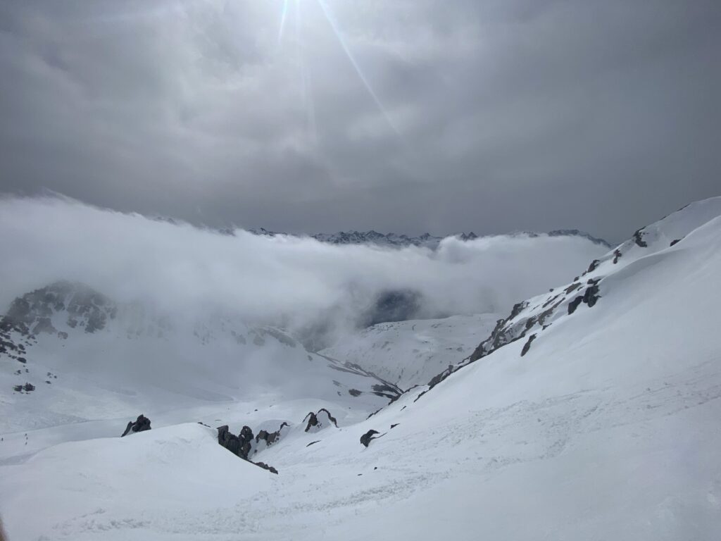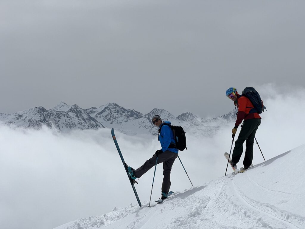 Zumindest am Sonntag geht es dann für Chris, den Organisator und mich auf die Piste und daneben. Ich habe zwar meine Hochtourenski mit, aber für die engen und steilen Schindlerrinnen ist der genau richtig. Wir probieren einiges aus, aber im Tal ist es von Anfang an gatschig und teilweise extrem dichter Nebel. Also bleiben wir oben in der Höhe und als Abschluss nehmen wir noch die Gondel auf die Valuga und geniessen den spektakurlären Ausblick. Mit dem nächsten Zug nach Liftschluss geht es in Ländle für die Skihochtourentage in die Silvretta.