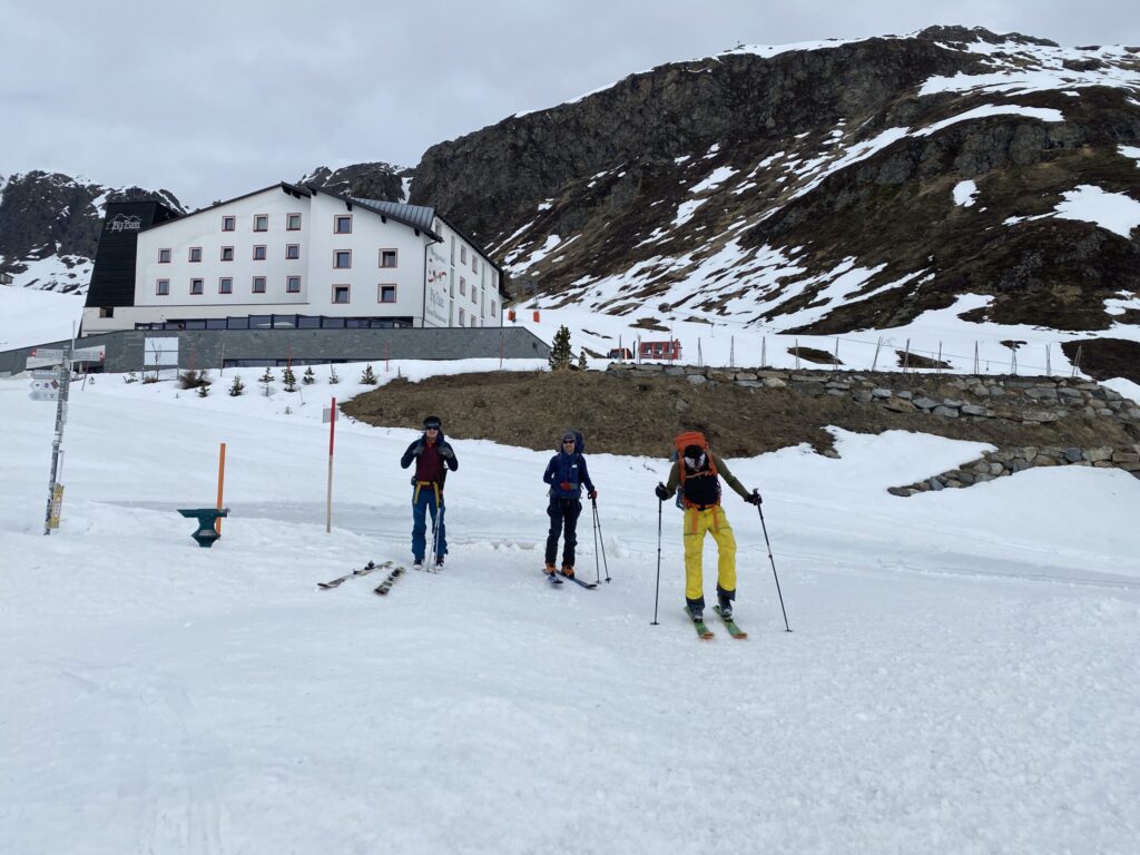 Die Abfahrt zur Bielerhöhe machen wir aus Sicherheitsgründen über das Bielertal, auch wenn das einiges an Weg und Höhenmeter mehr sind. Den Wunsch von Oliver den Piz Buin noch am letzte Drücker zu machen ist uns doch zu viel. Aber die Haagerspitze liegt am Weg und so kommt noch ein 3000er (für Fabian) unter unsere Füße. Auch diese nordseitige Anstieg ist wieder sehr steil und wir machen auf 2850 Meter Skidepot. Andere Tourengehende sind mit den Skiern bis auf den Gipfel, aber für uns ist es zu unangenehm durch das extrem steile Geländer mit Skiern zu gehen. Die Harscheisen geben zwar Sicherheit, aber das Gelände unter uns ist deutlich absturzgefährdet und da wollen wir auf „Nummer sicher“ gehen. So stapfen wir mit Steigeisen die 200 Höhenmeter hinauf und genießen ein letztes Mal die herrliche Aussicht über die Silvretta. Die steile und etwas harte Abfahrt geht nach einigen Metern in feines kupiertes Gelände über und an den südöstlichen Stellen ist es bereits leicht aufgefirnt. Am Weg hinunter rasten wir noch einmal in der Sonne, bevor wir zurück zu Bielerhöhe fahren und die letzten 70 Höhenmeter zum Silvrettahaus aufsteigen, wo wir duschen und uns für die Heimfahrt fertigmachen. Dann geht es mit dem Tunnelbus, der Seilbahn, dem Bus und dem Zug komplikationslos zurück nach Bludenz wo wir in der altbewährten Pizzeria den Abend bis zum Zug ausklingen lassen und schließlich von Feldkirch nach Graz gondeln und im Nightjet ganz gut schlafen.