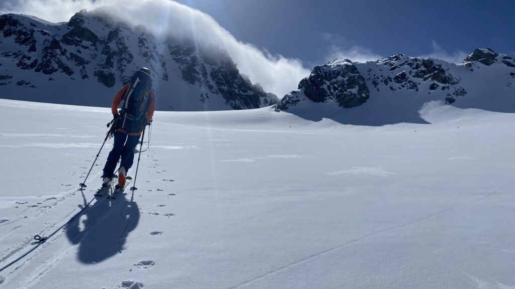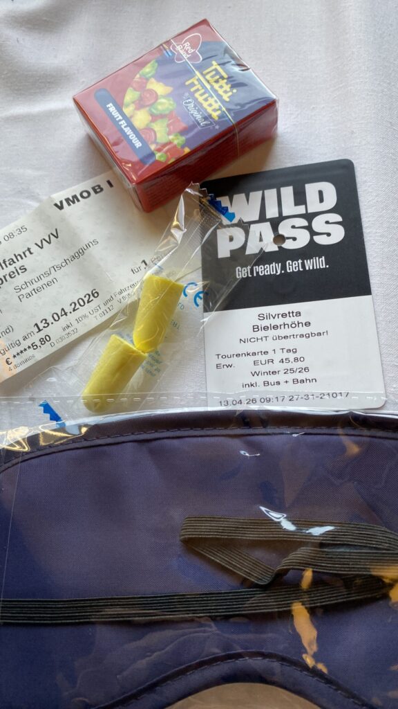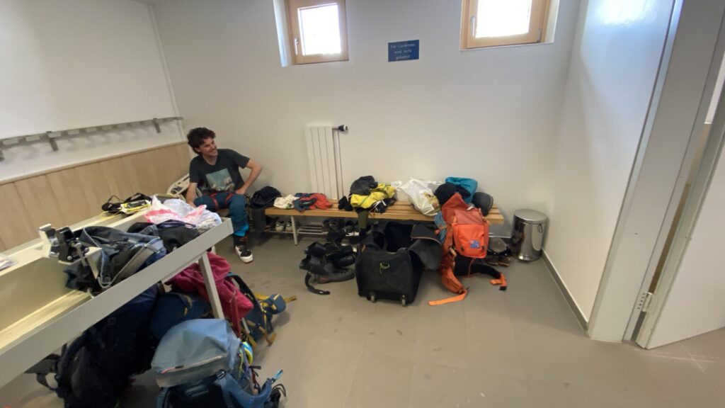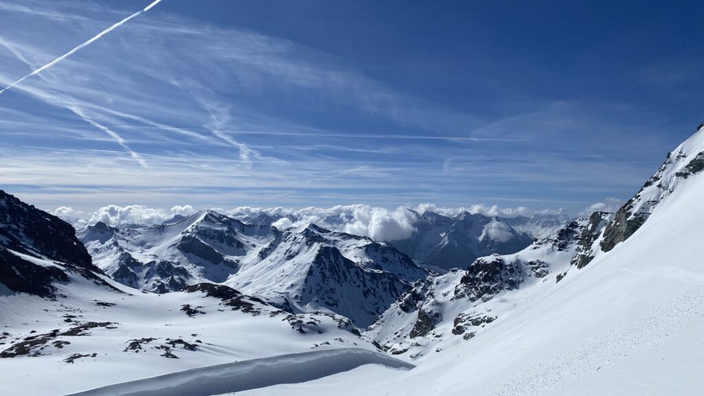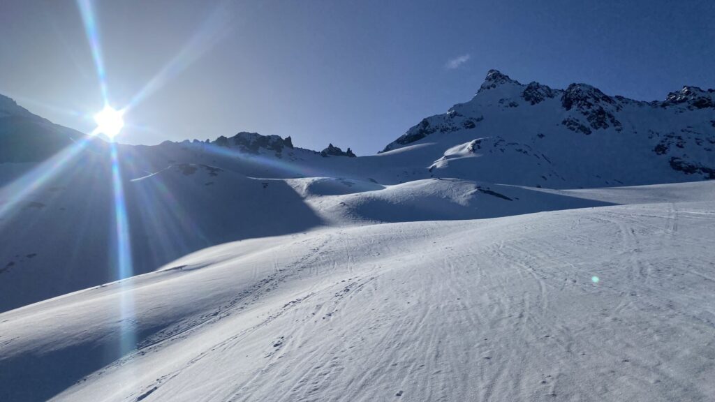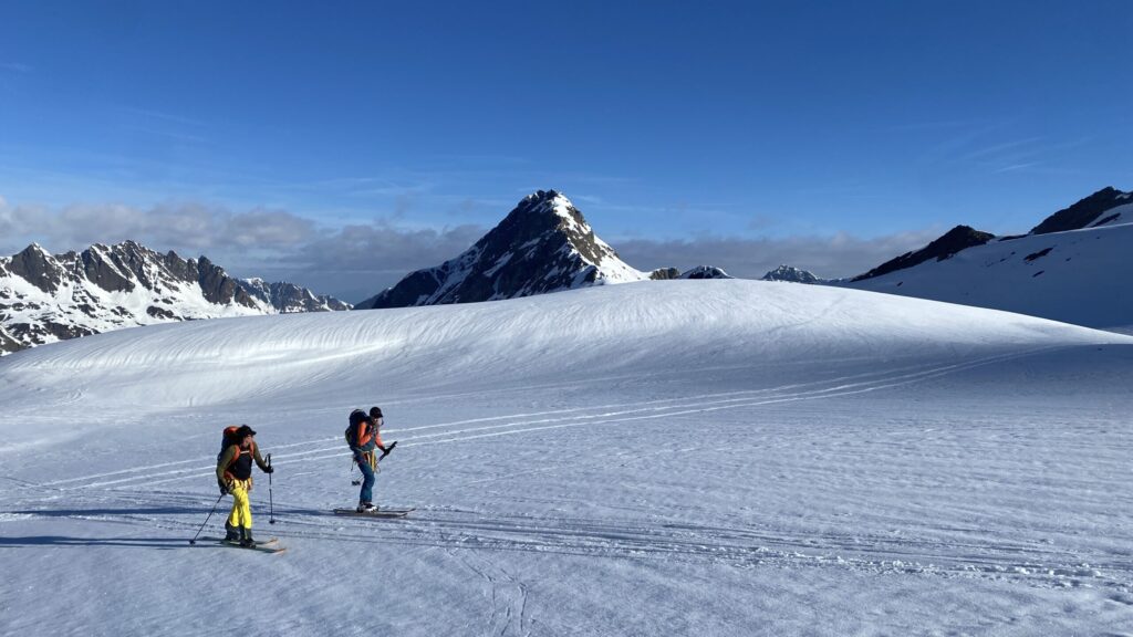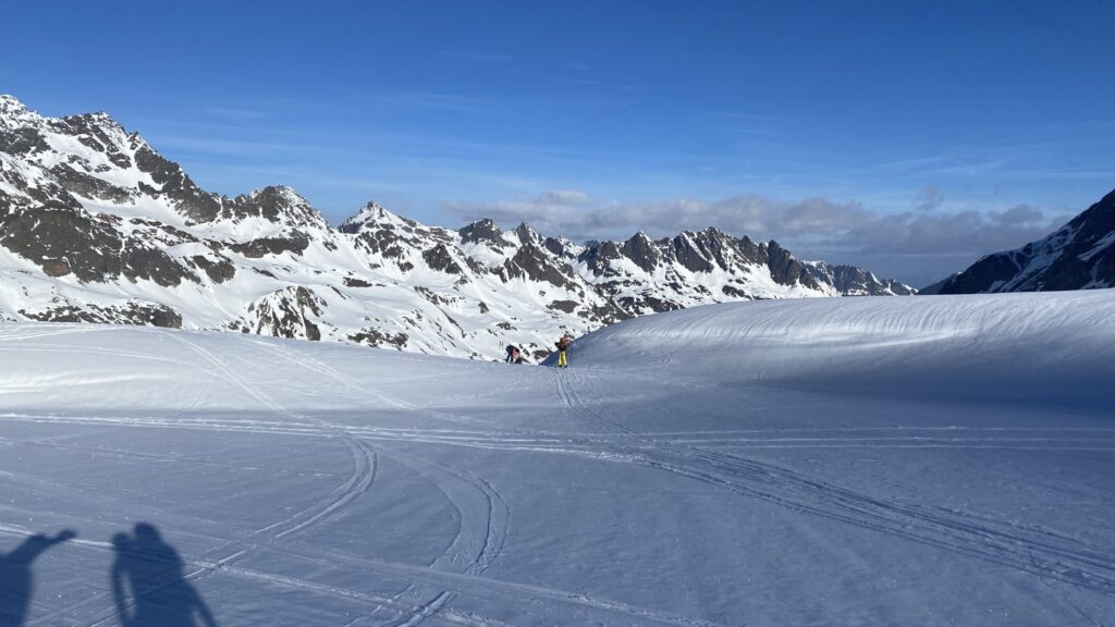 Am dritten Tag geht es wieder zur Ochsenscharte, diesmal ist der Himmel blau und die Welt voller Berge. Von Westen stauen noch Quellwolken an die Gipfel. Wir fahren auf der dünnen Pulverauflage etwa 400 Höhenmeter herrlich den Ochsentaler Gletscher ab. Und während wir zwischen die beiden Jamtalspitzen wieder hochwandern, tauchen wir in diese Wolkendecke. Deshalb besteigen wir „nur“ die hintere Jamtalspitze. Die Vordere ist deutlich steiler und alpinistisch herausfordernder und nachdem die Sicht so schlecht ist, lassen wir es bleiben. Als es dann etwas aufhellt fahren wir nocheinmal rund 400 Höhenmeter ab. Dort machen wir eine Pause und steigen weiter östlich in einem langen Bogen zur Gemspitze auf, die bis zum Gipfel mit Ski begehbar ist. Die Wolken haben sich mittlerweile deutlich weiter nach Süden zurückgezogen und so genießen wir die volle Aussicht. Die 1500 Höhenmeter Aufstieg reichen für heute und wir fahren südöstlich vom Rußkopf zur Jamtalhütte ab die wir nach fast neun Stunden erreichen. Das Klima auf der Hütte ist freundlich aber sehr voll. Das zahlreiche Personal wirkt motiviert und organisiert die gut 200 Skitourengehenden perfekt. Einziges Manko ist, dass es keine Hüttenpatschen mehr gibt, aber damit können wir leben. Oliver krallt sich welche vom Trockner, Fabi und Gerald nehmen die aus dem Nightjet und ich bleibe barfuß.