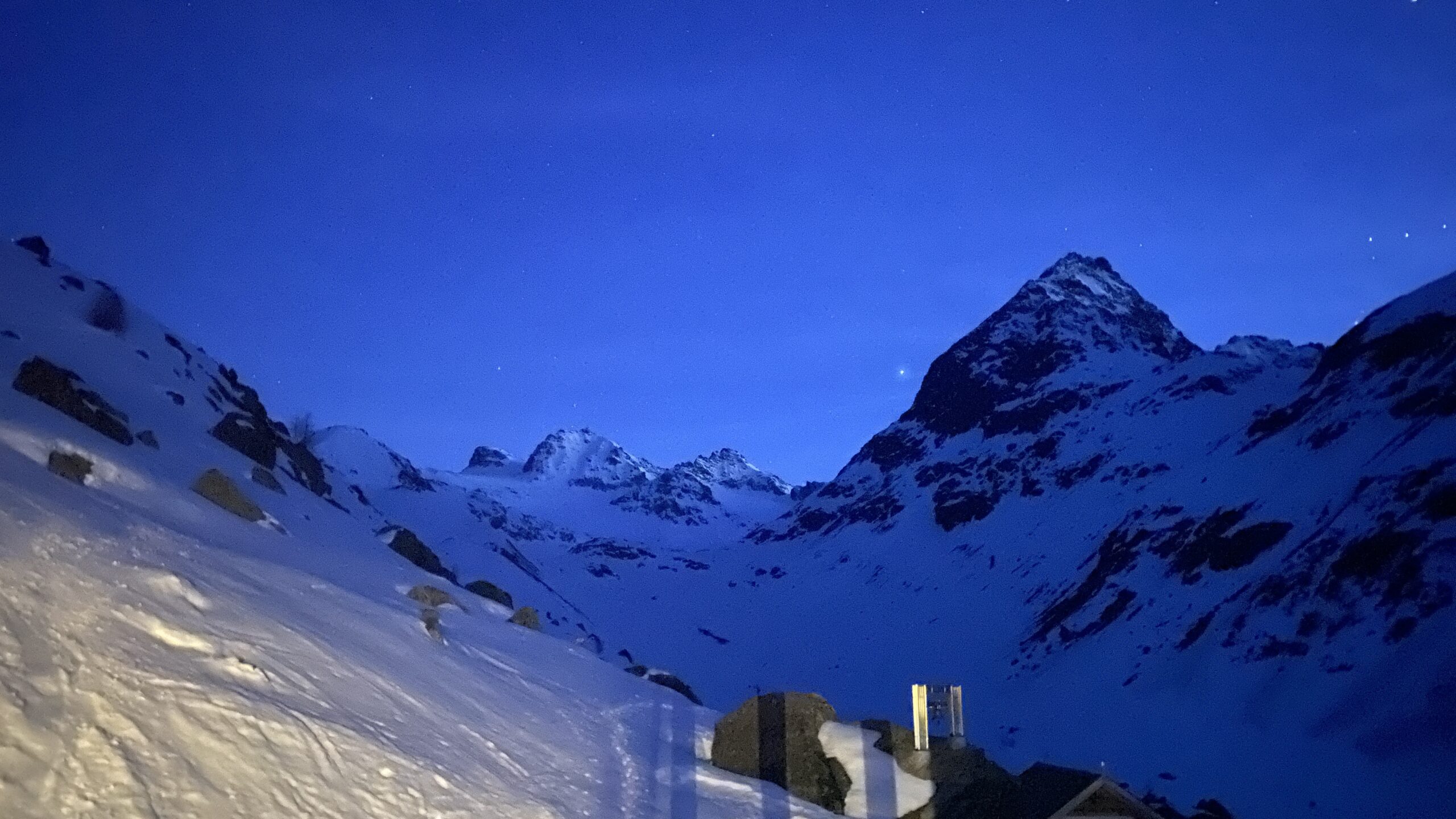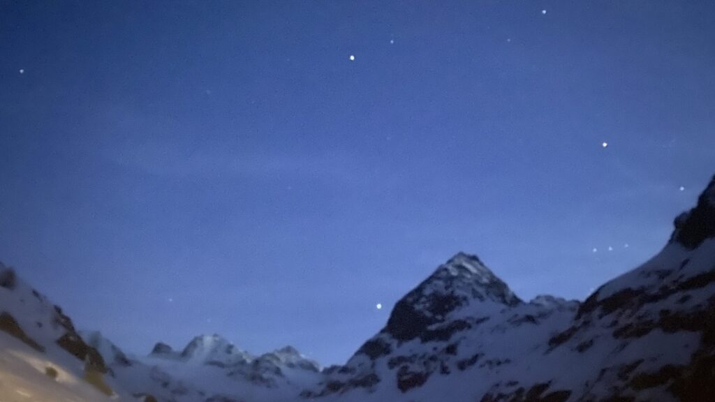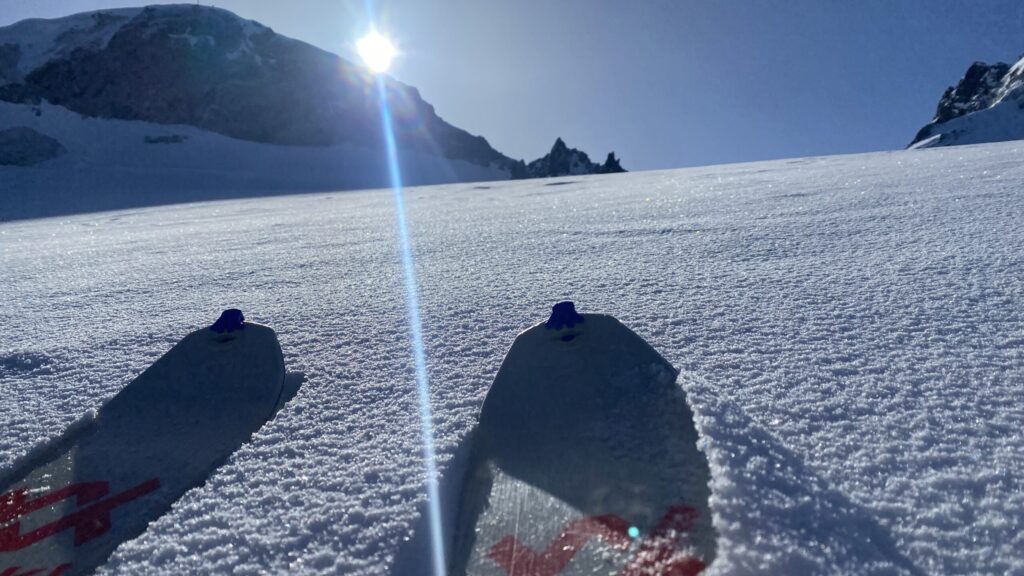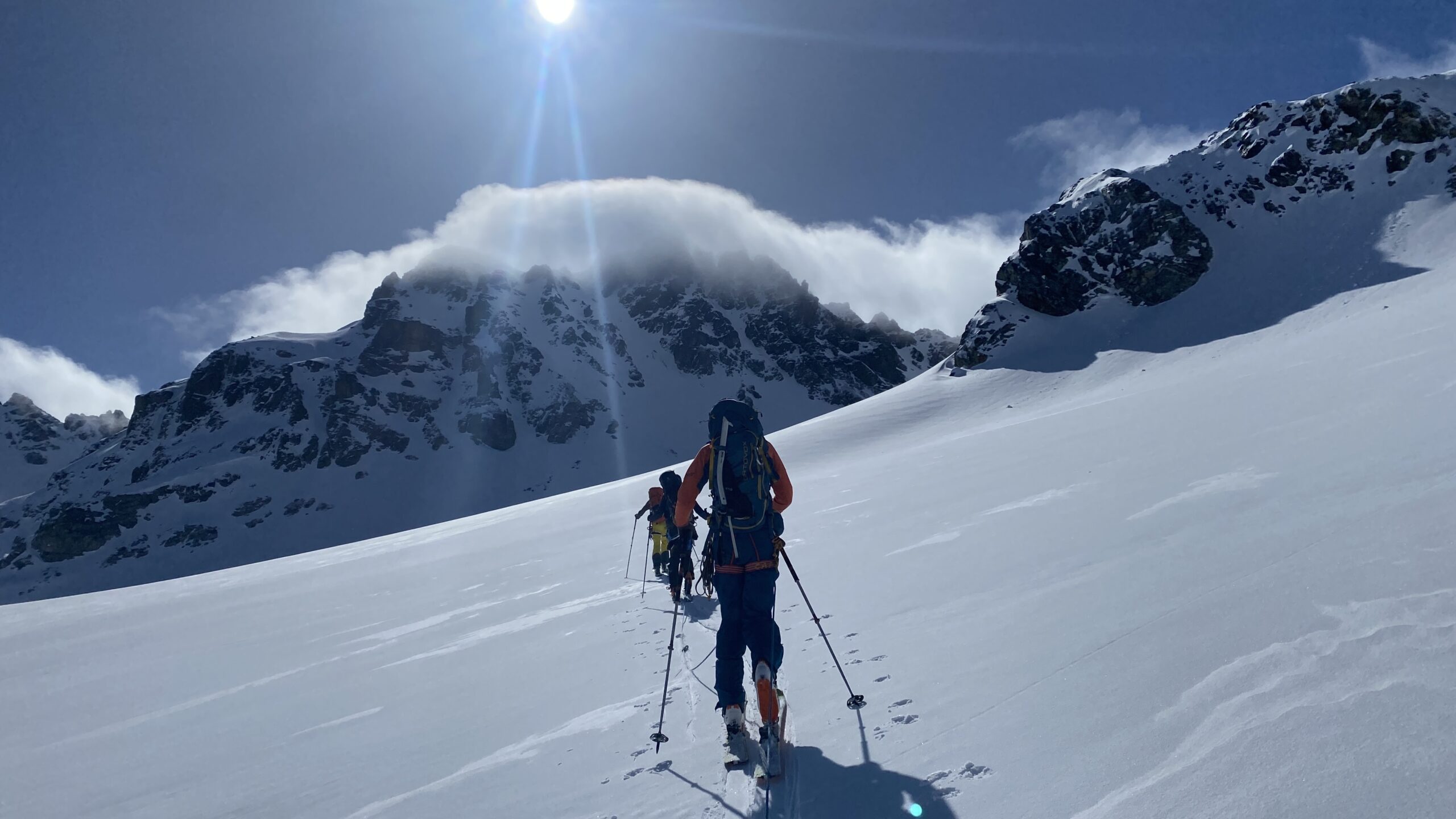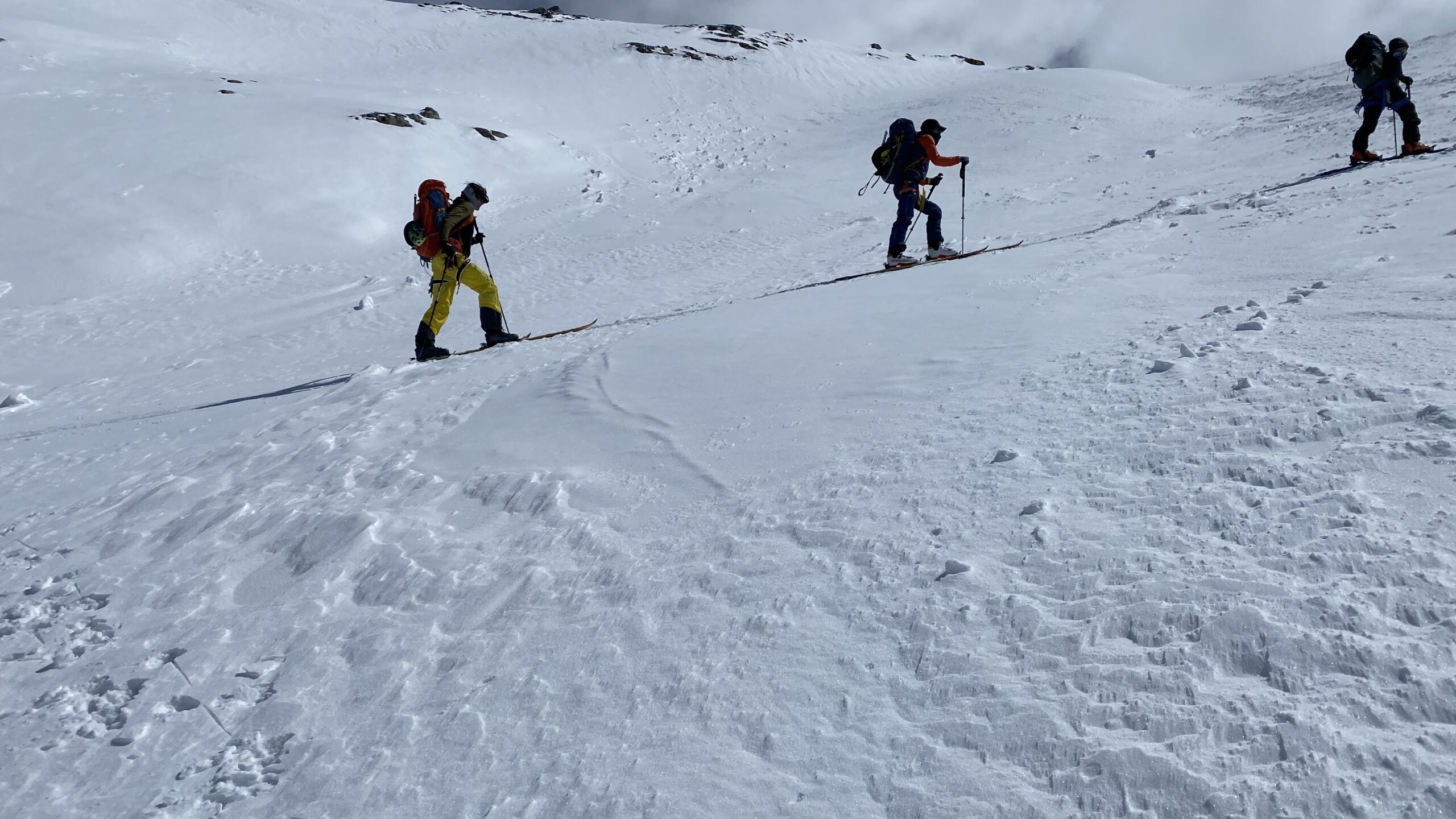 Am dritten Tag geht es wieder zur Ochsenscharte, diesmal ist der Himmel blau und die Welt voller Berge. Von Westen stauen noch Quellwolken an die Gipfel. Wir fahren auf der dünnen Pulverauflage etwa 400 Höhenmeter herrlich den Ochsentaler Gletscher ab. Und während wir zwischen die beiden Jamtalspitzen wieder hochwandern, tauchen wir in diese Wolkendecke. Deshalb besteigen wir „nur“ die hintere Jamtalspitze. Die Vordere ist deutlich steiler und alpinistisch herausfordernder und nachdem die Sicht so schlecht ist, lassen wir es bleiben. Als es dann etwas aufhellt fahren wir nocheinmal rund 400 Höhenmeter ab. Dort machen wir eine Pause und steigen weiter östlich in einem langen Bogen zur Gemspitze auf, die bis zum Gipfel mit Ski begehbar ist. Die Wolken haben sich mittlerweile deutlich weiter nach Süden zurückgezogen und so genießen wir die volle Aussicht. Die 1500 Höhenmeter Aufstieg reichen für heute und wir fahren südöstlich vom Rußkopf zur Jamtalhütte ab die wir nach fast neun Stunden erreichen. Das Klima auf der Hütte ist freundlich aber sehr voll. Das zahlreiche Personal wirkt motiviert und organisiert die gut 200 Skitourengehenden perfekt. Einziges Manko ist, dass es keine Hüttenpatschen mehr gibt, aber damit können wir leben. Oliver krallt sich welche vom Trockner, Fabi und Gerald nehmen die aus dem Nightjet und ich bleibe barfuß.