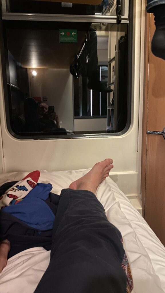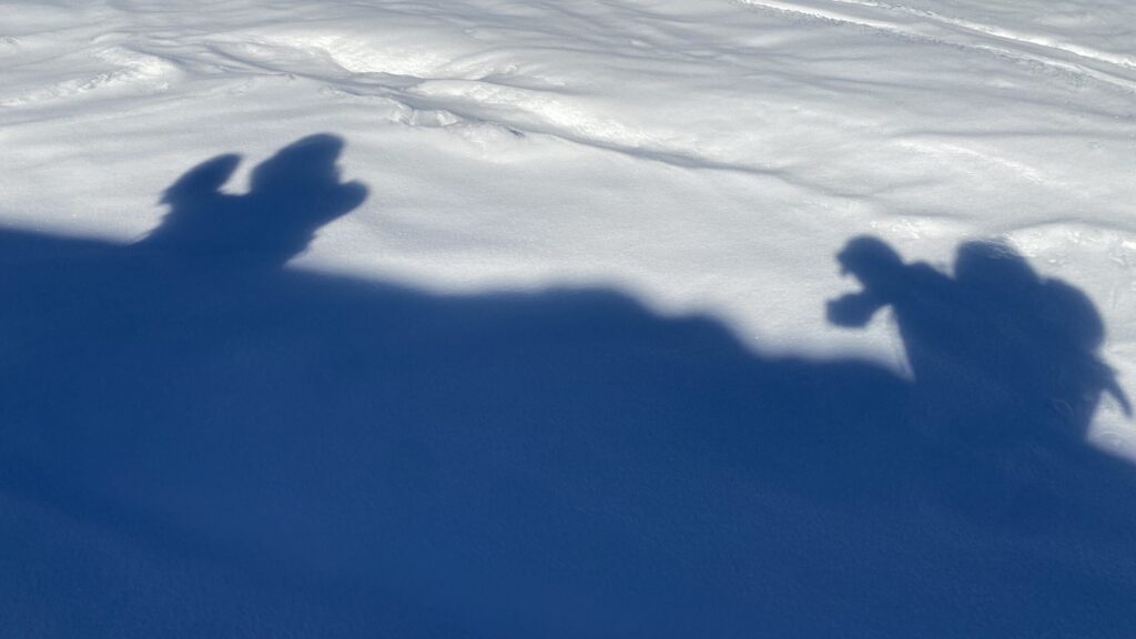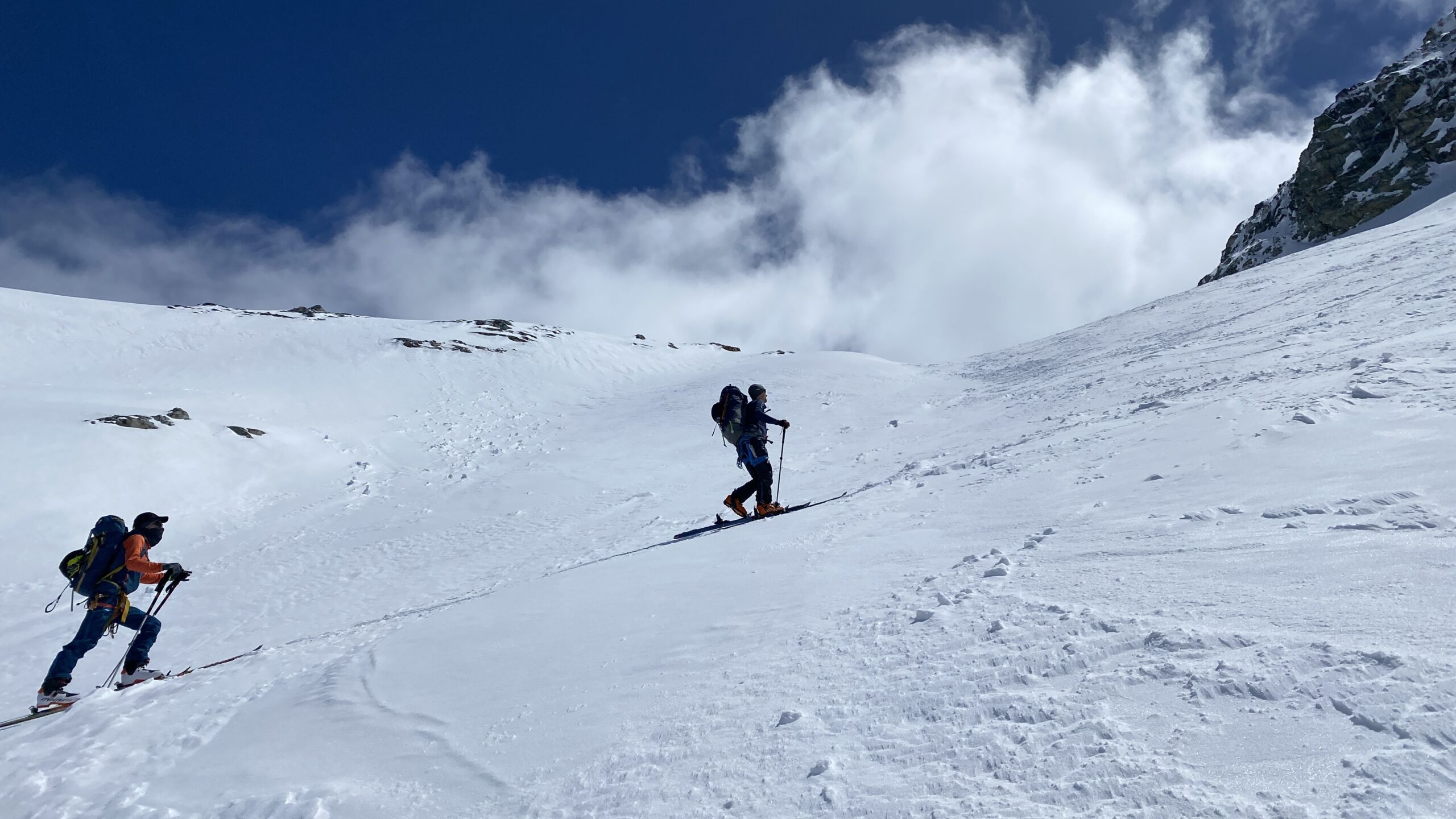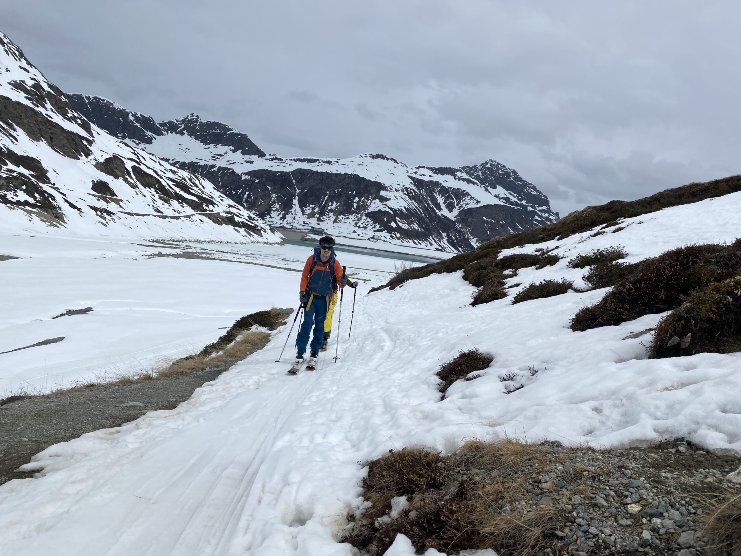 Am dritten Tag geht es wieder zur Ochsenscharte, diesmal ist der Himmel blau und die Welt voller Berge. Von Westen stauen noch Quellwolken an die Gipfel. Wir fahren auf der dünnen Pulverauflage etwa 400 Höhenmeter herrlich den Ochsentaler Gletscher ab. Und während wir zwischen die beiden Jamtalspitzen wieder hochwandern, tauchen wir in diese Wolkendecke. Deshalb besteigen wir „nur“ die hintere Jamtalspitze. Die Vordere ist deutlich steiler und alpinistisch herausfordernder und nachdem die Sicht so schlecht ist, lassen wir es bleiben. Als es dann etwas aufhellt fahren wir nocheinmal rund 400 Höhenmeter ab. Dort machen wir eine Pause und steigen weiter östlich in einem langen Bogen zur Gemspitze auf, die bis zum Gipfel mit Ski begehbar ist. Die Wolken haben sich mittlerweile deutlich weiter nach Süden zurückgezogen und so genießen wir die volle Aussicht. Die 1500 Höhenmeter Aufstieg reichen für heute und wir fahren südöstlich vom Rußkopf zur Jamtalhütte ab die wir nach fast neun Stunden erreichen. Das Klima auf der Hütte ist freundlich aber sehr voll. Das zahlreiche Personal wirkt motiviert und organisiert die gut 200 Skitourengehenden perfekt. Einziges Manko ist, dass es keine Hüttenpatschen mehr gibt, aber damit können wir leben. Oliver krallt sich welche vom Trockner, Fabi und Gerald nehmen die aus dem Nightjet und ich bleibe barfuß.