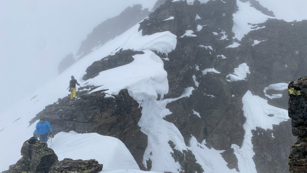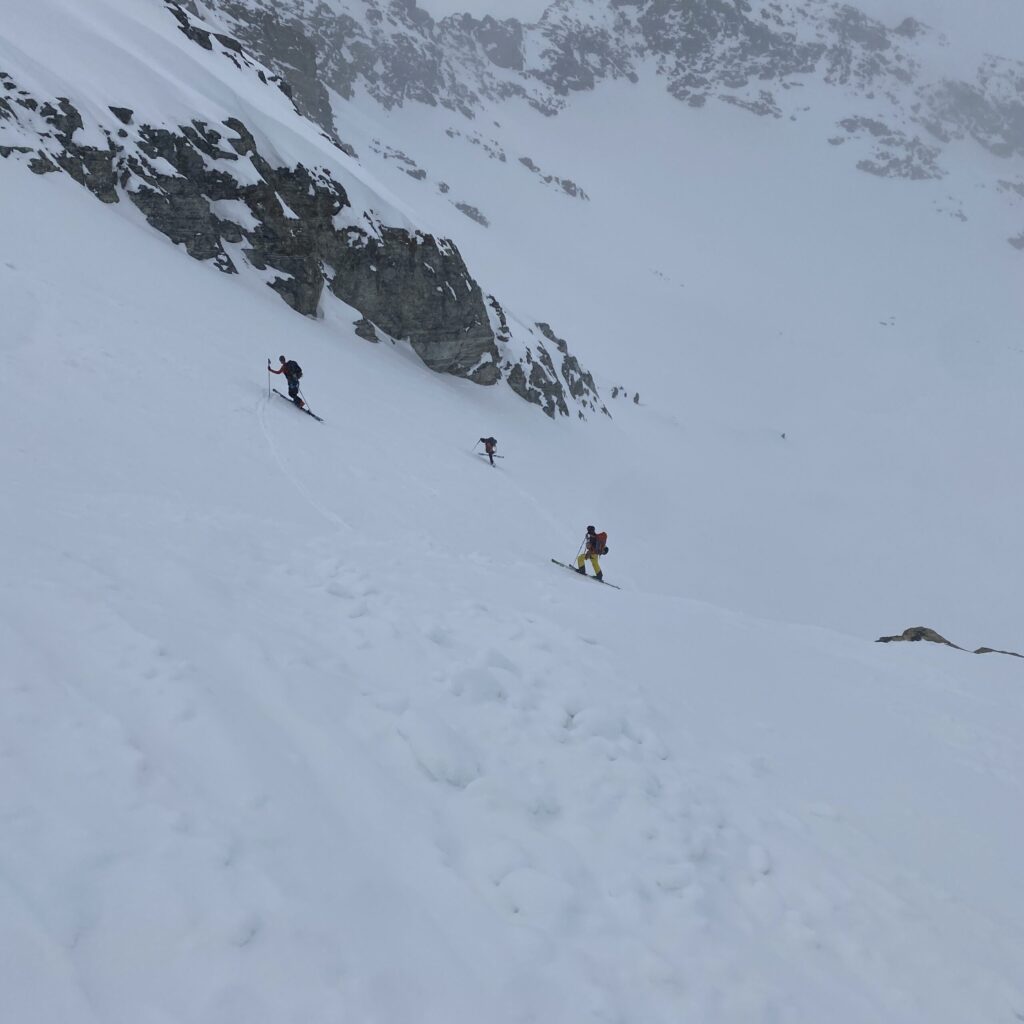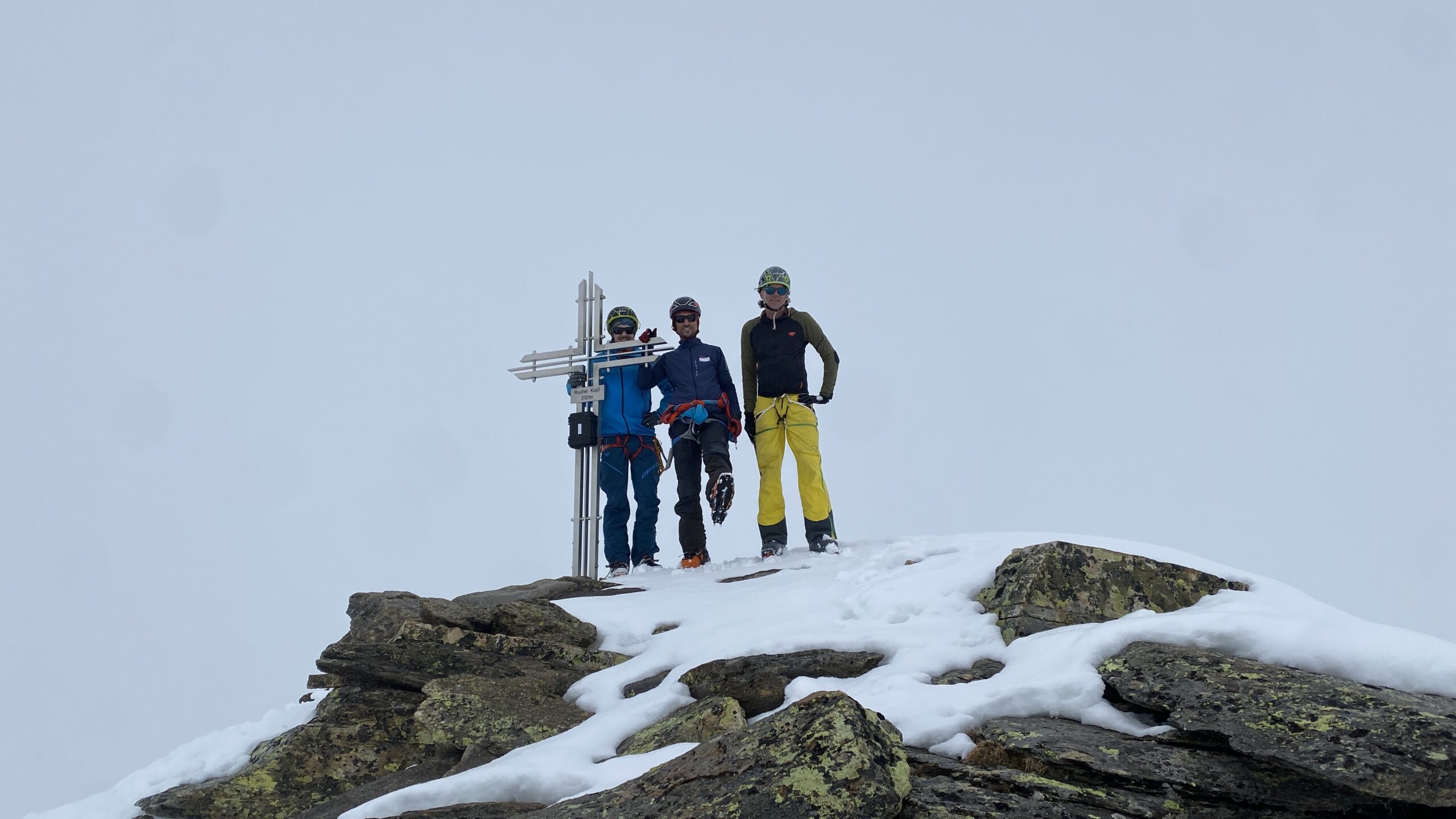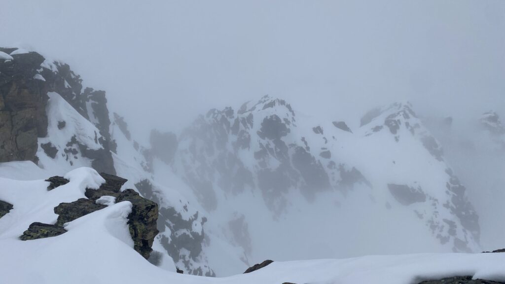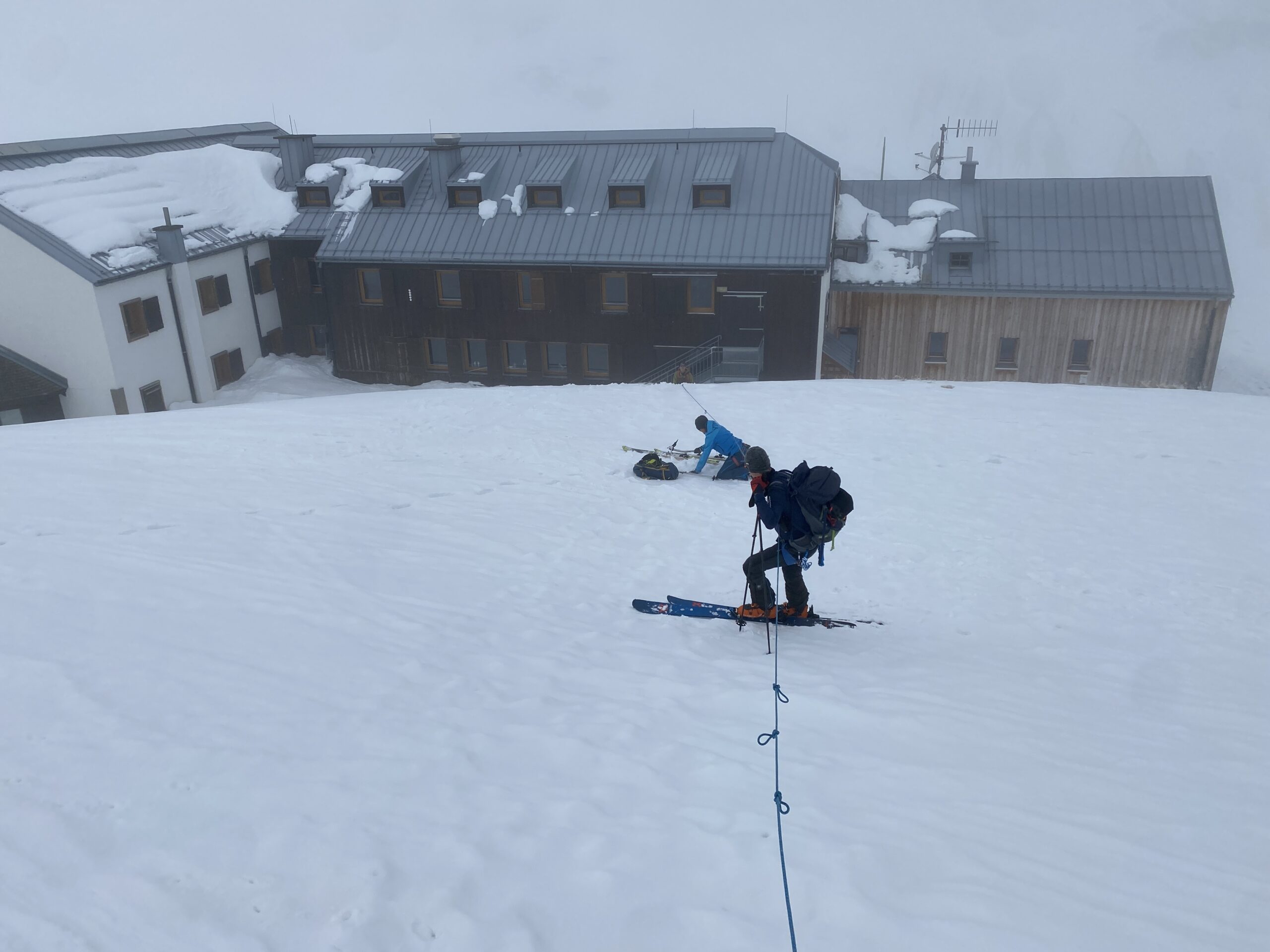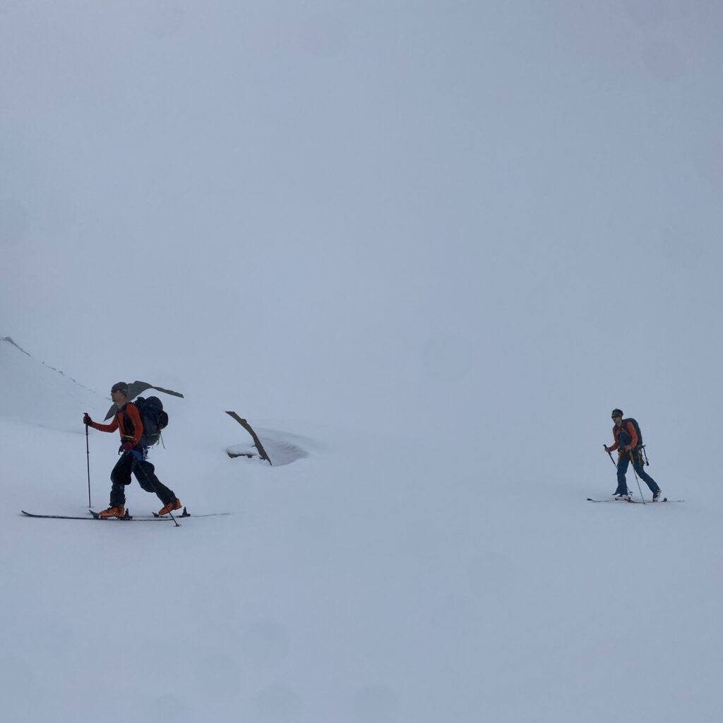 Am Dienstag ist das Wetter nicht besser. Eigentlich wäre heute der beste Tag für den Piz Buin. Ab bei diesem Wetter ist das keine Option. Also starten wir mit Seiltechnik und Spaltenbergung. Zuerst am Tisch und dann draußen hinter der Hütte. Um halb zwölf geht es dann auf die gemeinsame Tour zum Rauen Kopf. Wieder wird der Nebel mit den Höhenmetern dichter und teilweise sehen die Füße mehr als die Augen. Es ist warm, den die Strahlungswärme dringt gefühlt ungefiltert durch die Wolken. Mit regelmäßiger Kontrolle der Postion am Handy erreichen wir nach zwei Stunden die Scharte und legen Steigeisen an und beginnen mit dem Gipfelanstieg. Der Aufstieg führt über eine steilere Rinne und dann über den Grat meist am Schnee. Eine einzige Kletterstelle um einen Felsen ist unschwer. Nach zwanzig Minuten stehen wir am ersten 3000er, dem ersten für Fabian. Wir sehen nicht viel von der Gegend. Deshalb unternehmen wir von der Scharte aus noch eine kurze Erkundung den Grat entlang zu einer weiten Scharte nordwestlich. Diese ist aber überwechtet und unfahrbar, zumindest ist das unser Eindruck. Dann nutzen wir ein kurzes Aufklären und die damit bessere Sicht für die Abfahrt über den gut 30 Grad steilen Gipfelhang. Der weitere Rückweg über das kupierte Gelände ist fein. Erst die letzten Meter zu Hütte wird der Schnee durchweicht. Kulinarisch ist die Wiesbadnerhütte ganz ok, außer das Jausenbrot (sehr trocken) und das Frühstück (lieblos). Dafür ist sie praktisch und bietet im Mehrbettzimmer ideal Platz für uns vier. Geruchlich fällt der Skischuhraum und die Qualität der Hauspatschen sehr eindrücklich negativ auf.