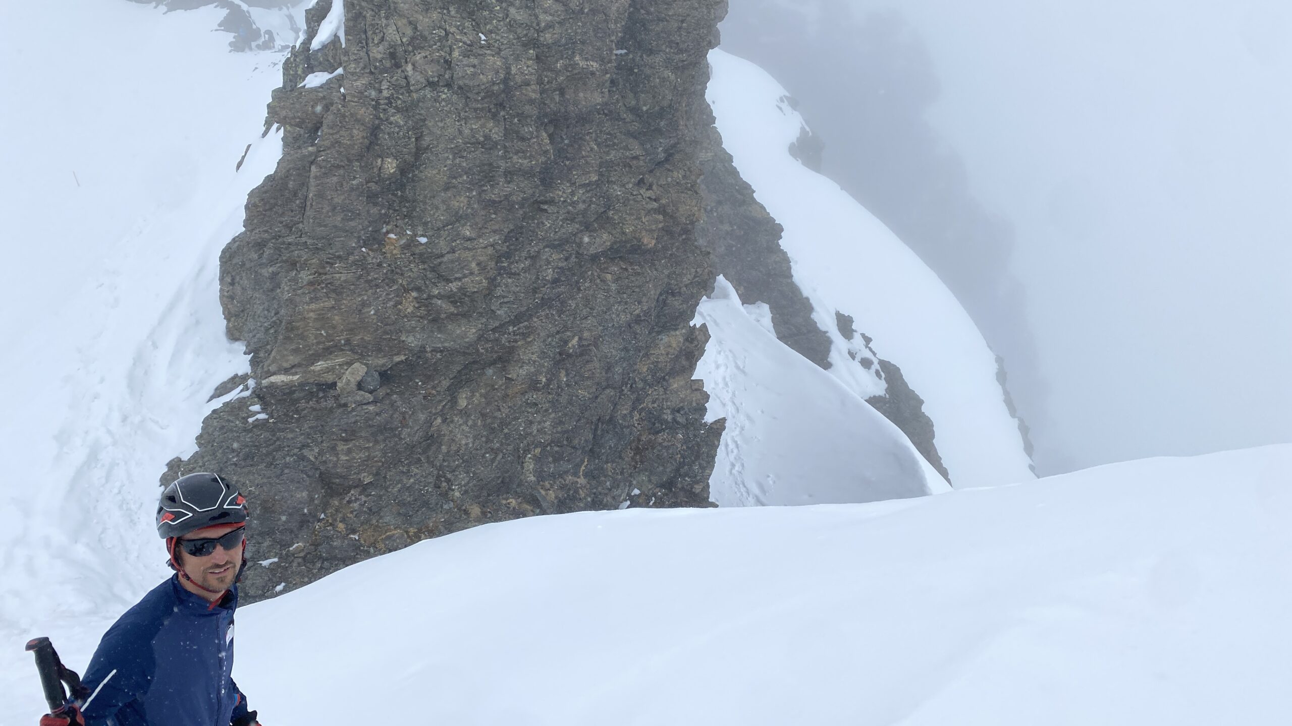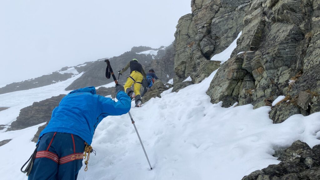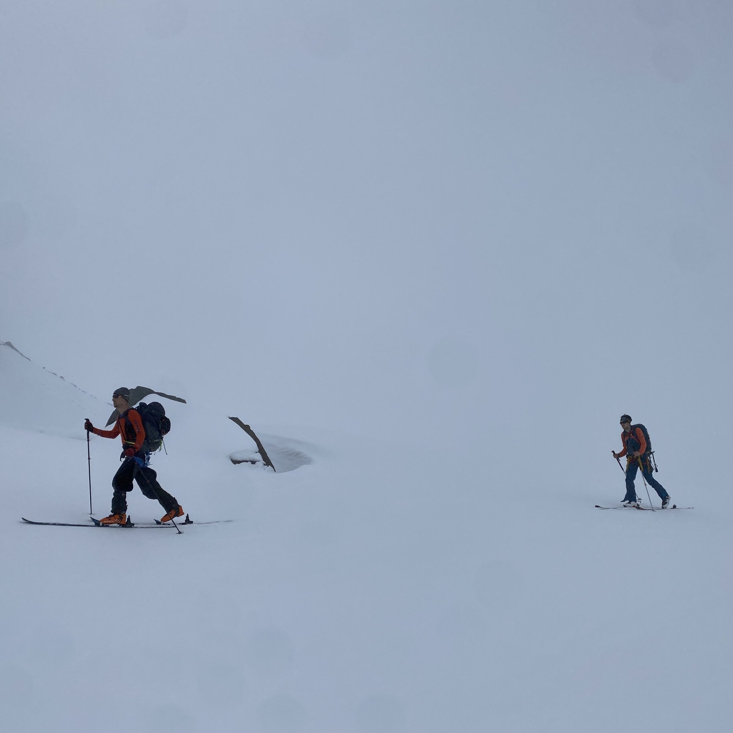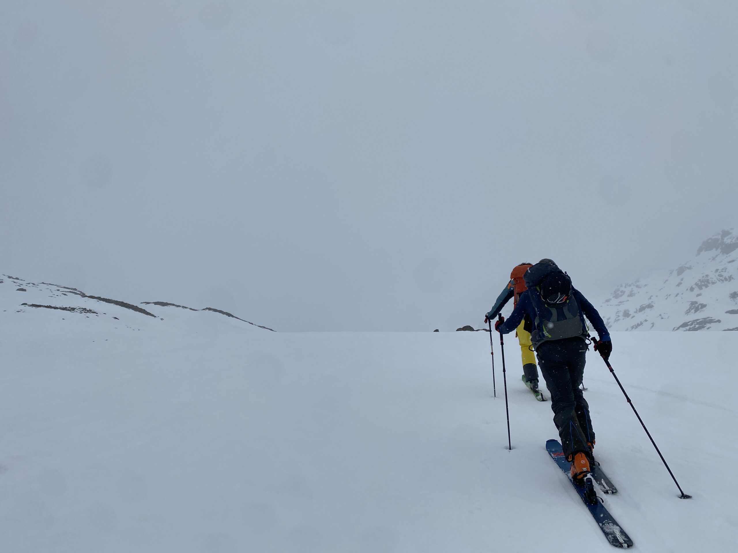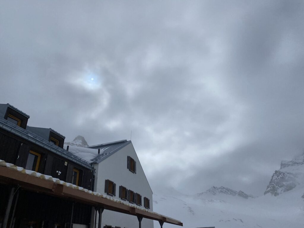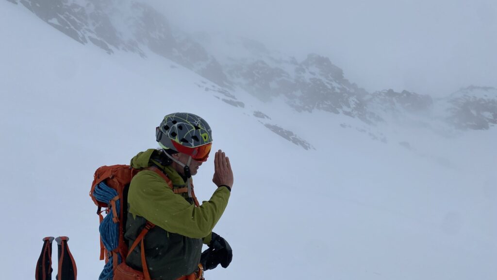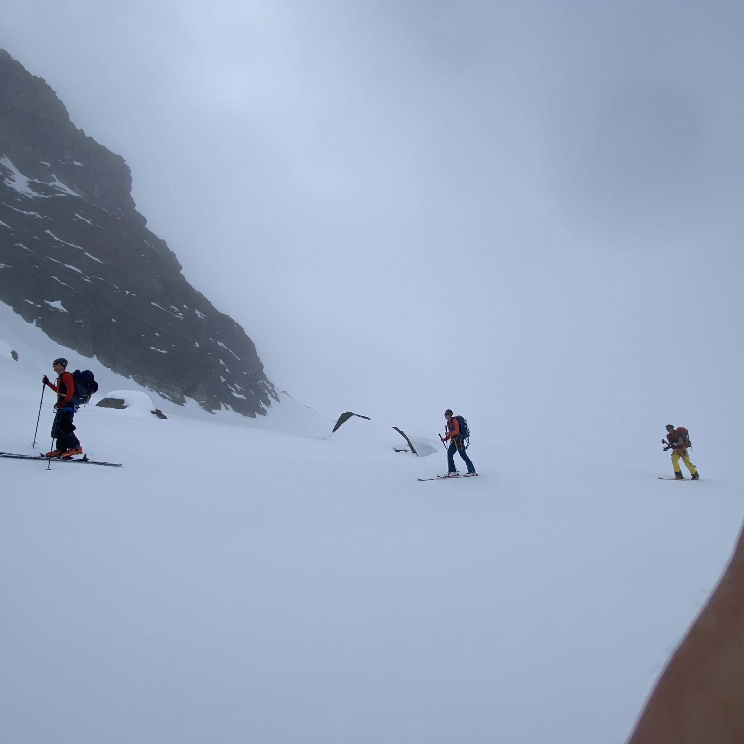 Am Dienstag ist das Wetter nicht besser. Eigentlich wäre heute der beste Tag für den Piz Buin. Ab bei diesem Wetter ist das keine Option. Also starten wir mit Seiltechnik und Spaltenbergung. Zuerst am Tisch und dann draußen hinter der Hütte. Um halb zwölf geht es dann auf die gemeinsame Tour zum Rauen Kopf. Wieder wird der Nebel mit den Höhenmetern dichter und teilweise sehen die Füße mehr als die Augen. Es ist warm, den die Strahlungswärme dringt gefühlt ungefiltert durch die Wolken. Mit regelmäßiger Kontrolle der Postion am Handy erreichen wir nach zwei Stunden die Scharte und legen Steigeisen an und beginnen mit dem Gipfelanstieg. Der Aufstieg führt über eine steilere Rinne und dann über den Grat meist am Schnee. Eine einzige Kletterstelle um einen Felsen ist unschwer. Nach zwanzig Minuten stehen wir am ersten 3000er, dem ersten für Fabian. Wir sehen nicht viel von der Gegend. Deshalb unternehmen wir von der Scharte aus noch eine kurze Erkundung den Grat entlang zu einer weiten Scharte nordwestlich. Diese ist aber überwechtet und unfahrbar, zumindest ist das unser Eindruck. Dann nutzen wir ein kurzes Aufklären und die damit bessere Sicht für die Abfahrt über den gut 30 Grad steilen Gipfelhang. Der weitere Rückweg über das kupierte Gelände ist fein. Erst die letzten Meter zu Hütte wird der Schnee durchweicht. Kulinarisch ist die Wiesbadnerhütte ganz ok, außer das Jausenbrot (sehr trocken) und das Frühstück (lieblos). Dafür ist sie praktisch und bietet im Mehrbettzimmer ideal Platz für uns vier. Geruchlich fällt der Skischuhraum und die Qualität der Hauspatschen sehr eindrücklich negativ auf.