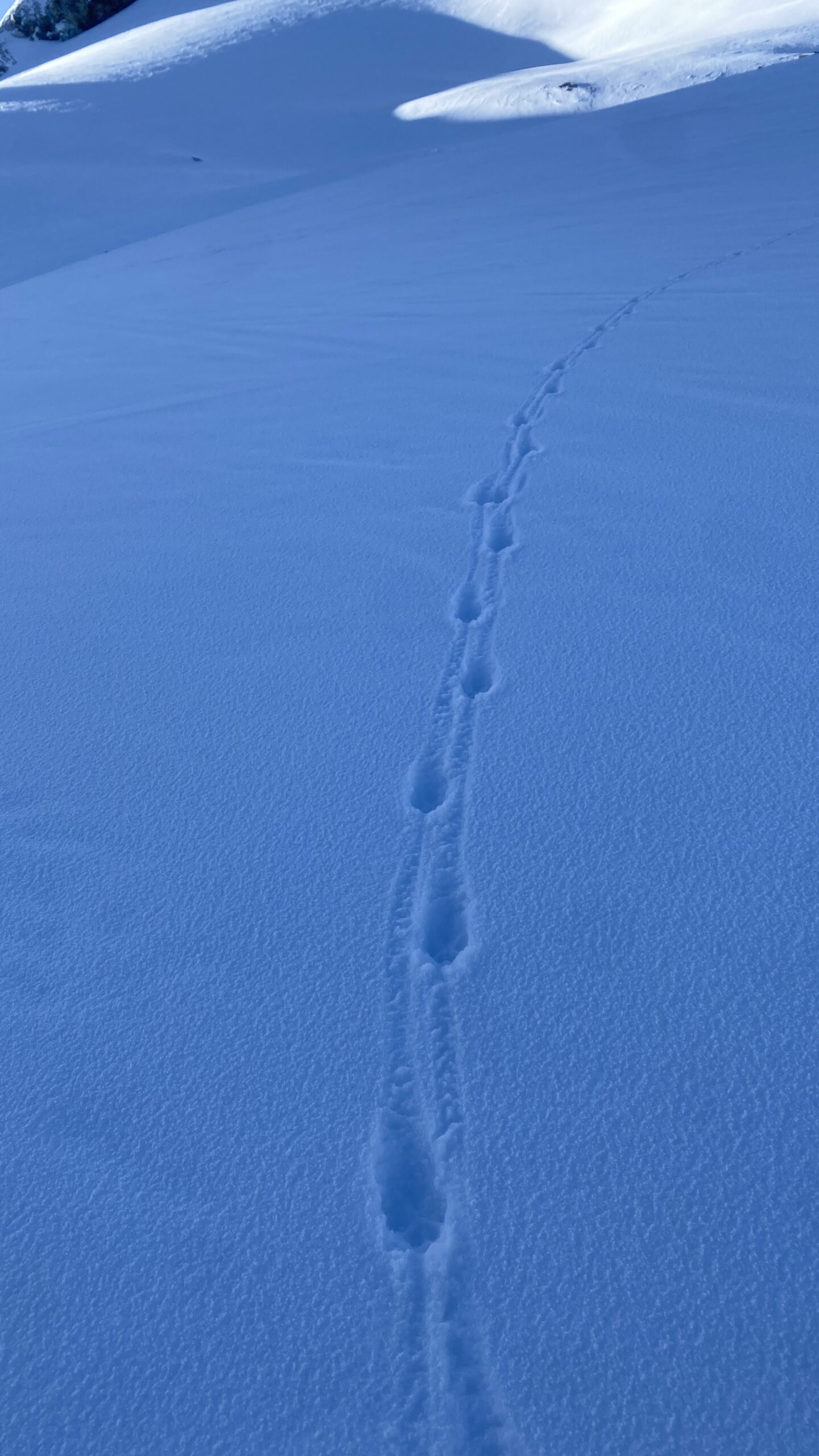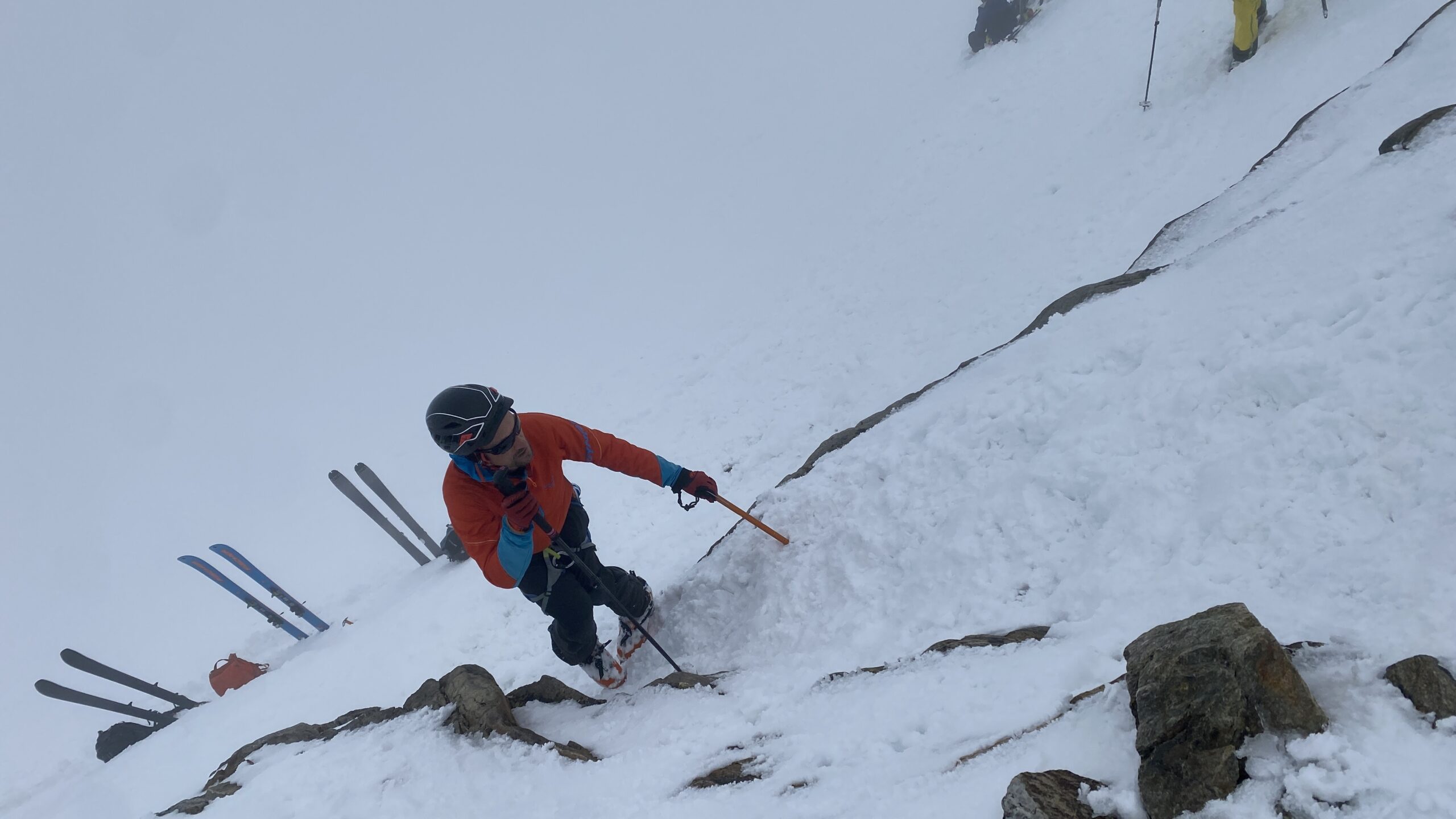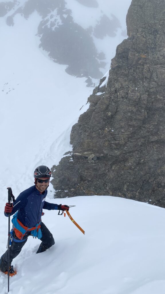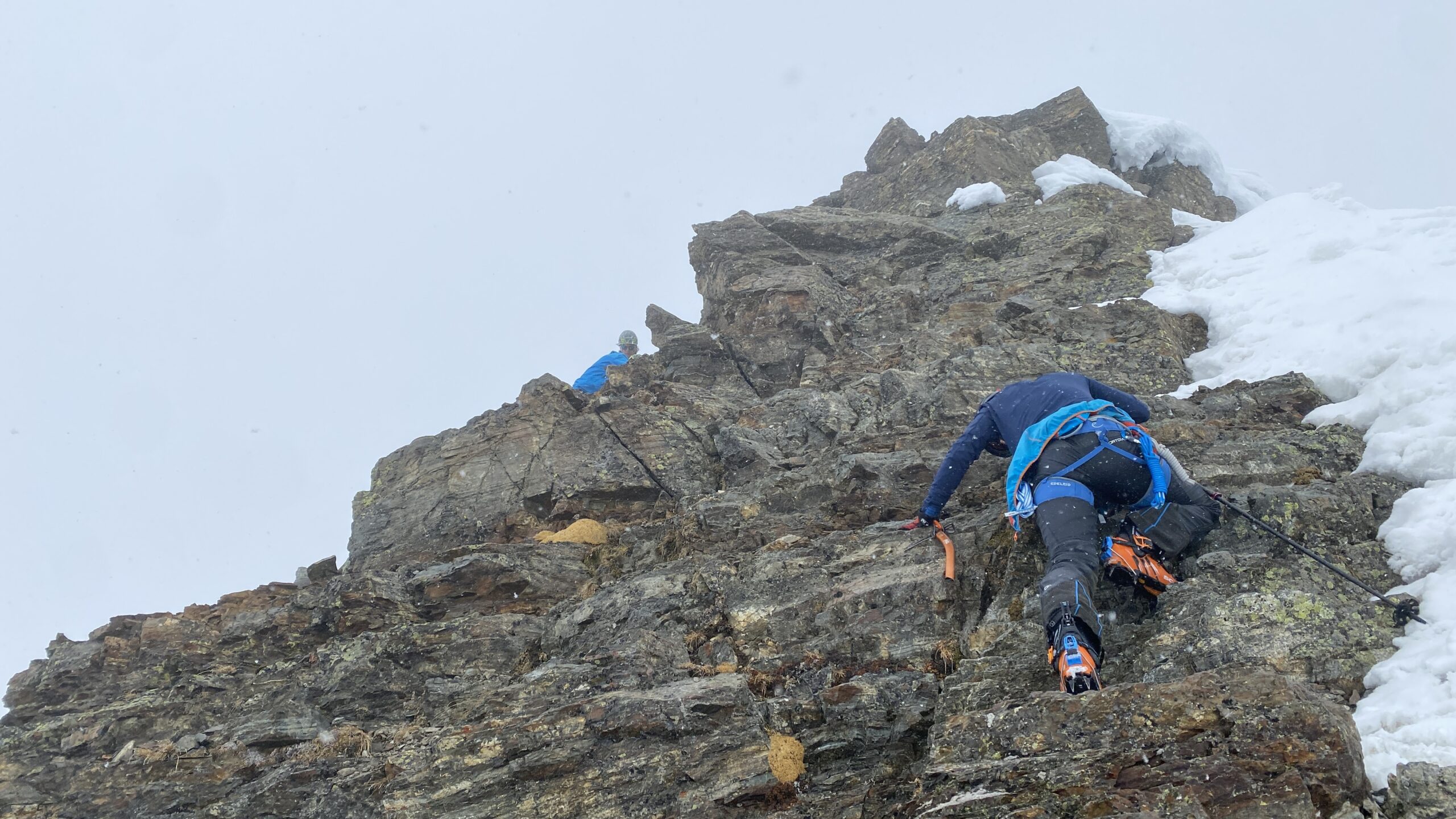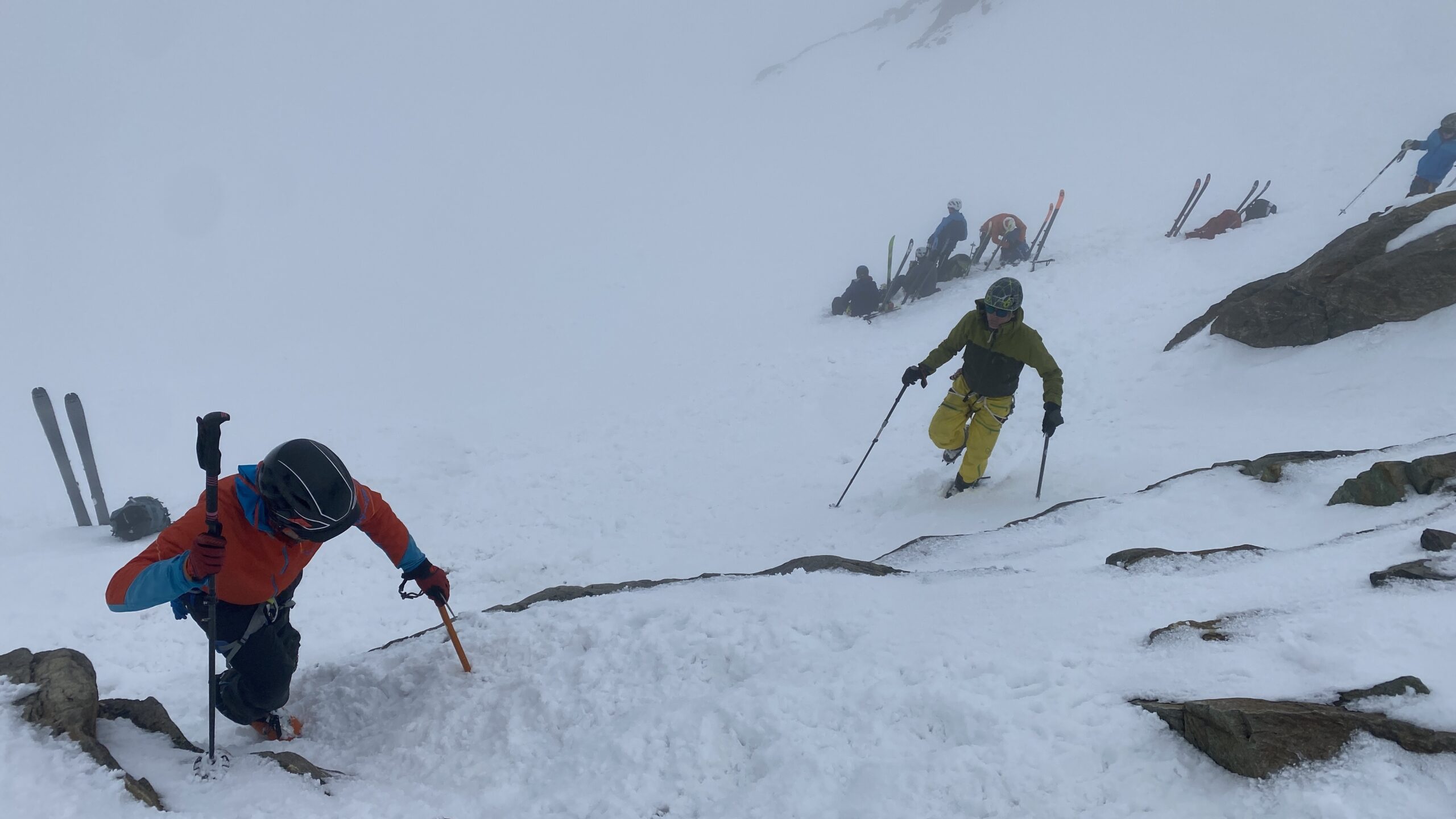 Am Dienstag ist das Wetter nicht besser. Eigentlich wäre heute der beste Tag für den Piz Buin. Ab bei diesem Wetter ist das keine Option. Also starten wir mit Seiltechnik und Spaltenbergung. Zuerst am Tisch und dann draußen hinter der Hütte. Um halb zwölf geht es dann auf die gemeinsame Tour zum Rauen Kopf. Wieder wird der Nebel mit den Höhenmetern dichter und teilweise sehen die Füße mehr als die Augen. Es ist warm, den die Strahlungswärme dringt gefühlt ungefiltert durch die Wolken. Mit regelmäßiger Kontrolle der Postion am Handy erreichen wir nach zwei Stunden die Scharte und legen Steigeisen an und beginnen mit dem Gipfelanstieg. Der Aufstieg führt über eine steilere Rinne und dann über den Grat meist am Schnee. Eine einzige Kletterstelle um einen Felsen ist unschwer. Nach zwanzig Minuten stehen wir am ersten 3000er, dem ersten für Fabian. Wir sehen nicht viel von der Gegend. Deshalb unternehmen wir von der Scharte aus noch eine kurze Erkundung den Grat entlang zu einer weiten Scharte nordwestlich. Diese ist aber überwechtet und unfahrbar, zumindest ist das unser Eindruck. Dann nutzen wir ein kurzes Aufklären und die damit bessere Sicht für die Abfahrt über den gut 30 Grad steilen Gipfelhang. Der weitere Rückweg über das kupierte Gelände ist fein. Erst die letzten Meter zu Hütte wird der Schnee durchweicht. Kulinarisch ist die Wiesbadnerhütte ganz ok, außer das Jausenbrot (sehr trocken) und das Frühstück (lieblos). Dafür ist sie praktisch und bietet im Mehrbettzimmer ideal Platz für uns vier. Geruchlich fällt der Skischuhraum und die Qualität der Hauspatschen sehr eindrücklich negativ auf.
