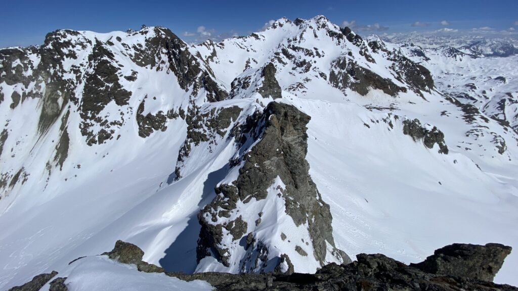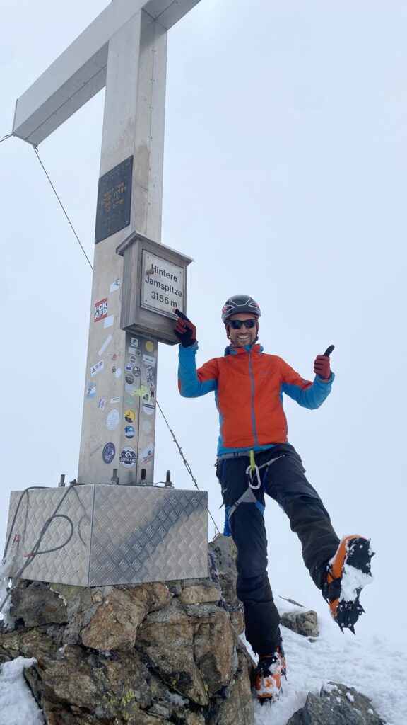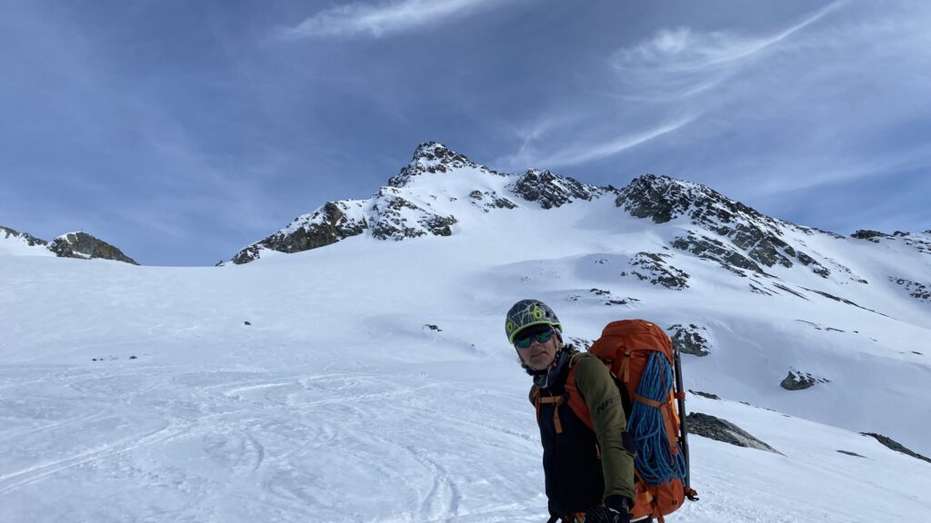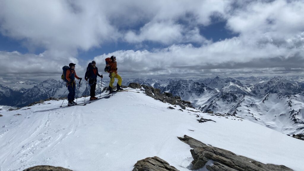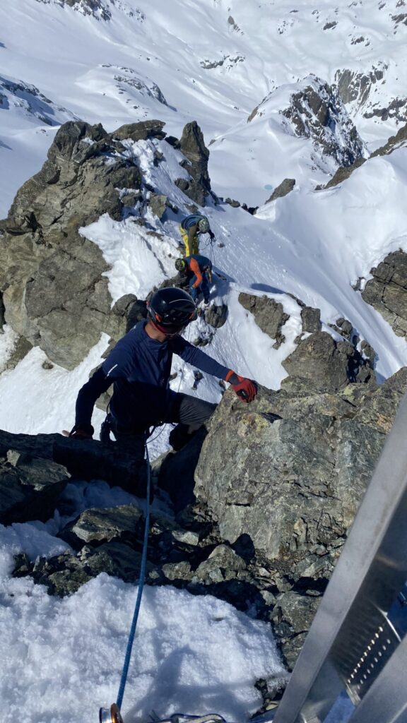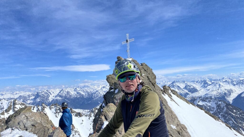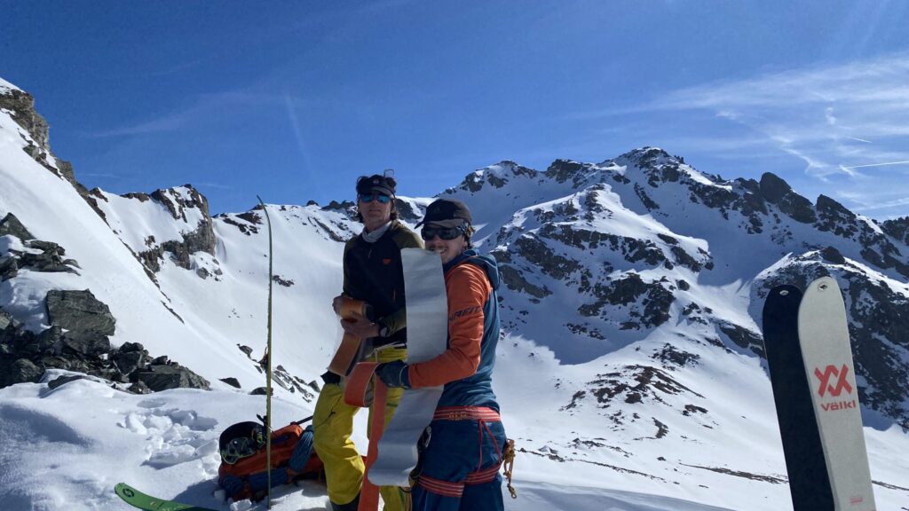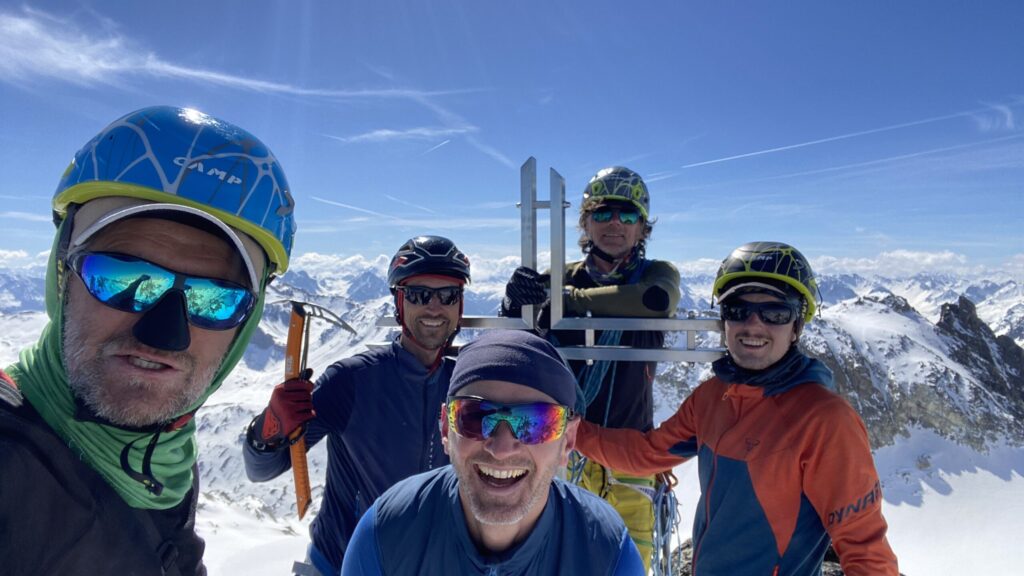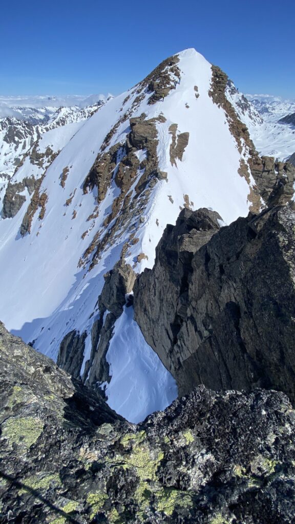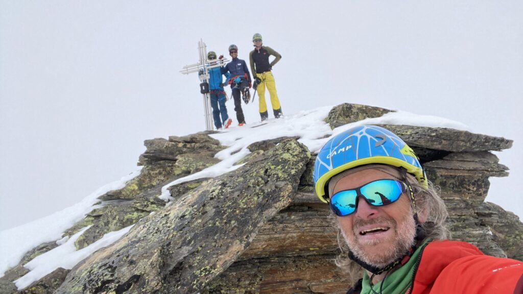 Für den Rückweg zur Wiesbadnerhütte nehmen wir den längeren Weg über die Jamtalscharte. Am Weg nehmen wir zu Übungszwecken noch einmal die Überschreitung über die Chalausköpfe mit und besteigen ein weiteres Mal den Mittleren Chalauskopf. Die Jamtalscharte ist dann etwas herausfordernder als gedacht. Das Schneeband in der Rinne ist nur noch teilweise vorhanden und ohne abseilen geht es kaum hinunter. Die ersten vier, wir haben auch noch Christian als Gast mit von der Partie, der uns schon seit ein paar Tagen „überholt“ und sich heute ganz offiziell angeschlossen hat, werden die die vollen 50 Meter abgeseilt und zum Schluß folge ich mit der halben Seillänge und steige wie die anderen den Rest stapfend ab. Gefahr besteht dabei keine, aber die feinen Steine aus dem Einstieg sind doch recht unangenehm. Dann geht es einfach zurück auf die Ochsenscharte die durch den Tagesverlauf recht weich ist. Oben entscheiden Gerald, Christian und ich uns für den Aufsteig zur Dreiländerspitze, während Oliver und Fabian bei besten Bedingungen zur Wiesbadnerhütte abfahren. Zu dritt geht es über sehr steiles Gelände (35 Grad) hinauf zum Skidepot. Am Weg fliegt noch der Inhalt eines Rucksacks an uns vorbei. Der Aufstieg zum Gipfel ist dann einfach, weil die Verhältnisse ideal sind. Der Stapfschnee ist perfekt und fast alle Felsen sind schneebedeckt. Den Sommergipfel lassen wir aus. Den Winter-Gipfel genießen wir nur kurz, weil hinter uns eine Gruppe mit über zehn Skitourengeher:innen heraufkommt und kein Platz ist. Der Abstieg ist dann ebenso unproblematisch und die Abfahrt auf die Wiesbadner sehr lässig.