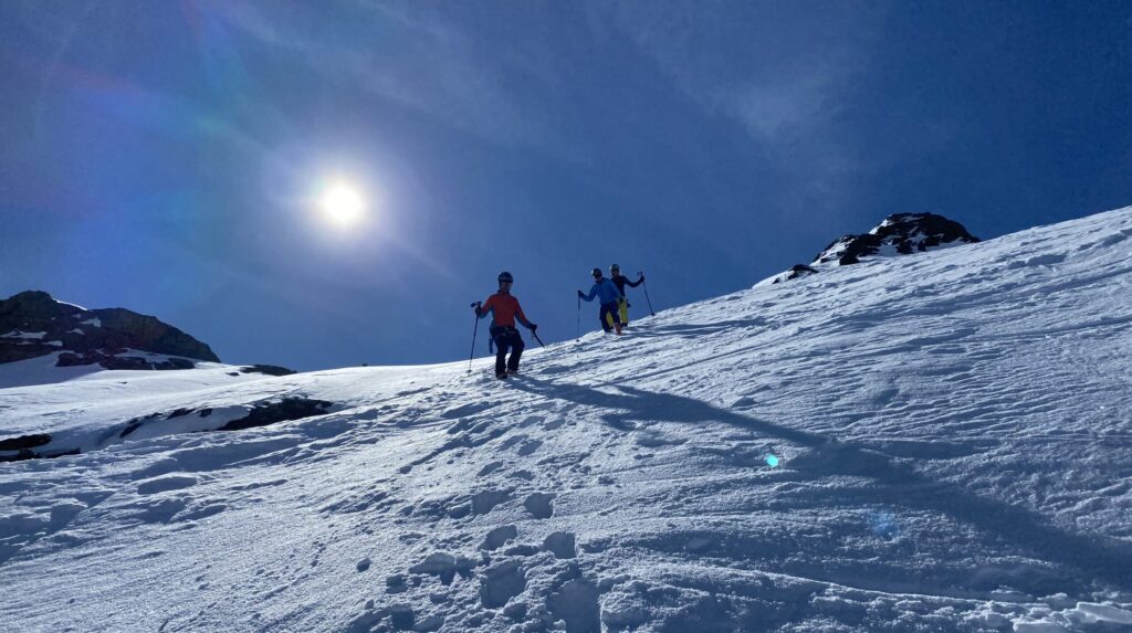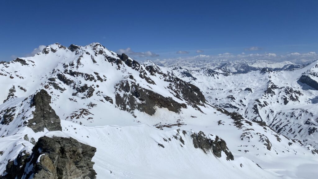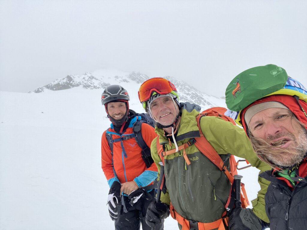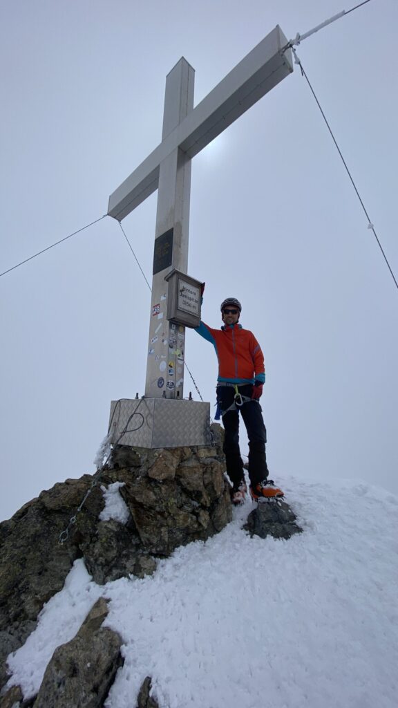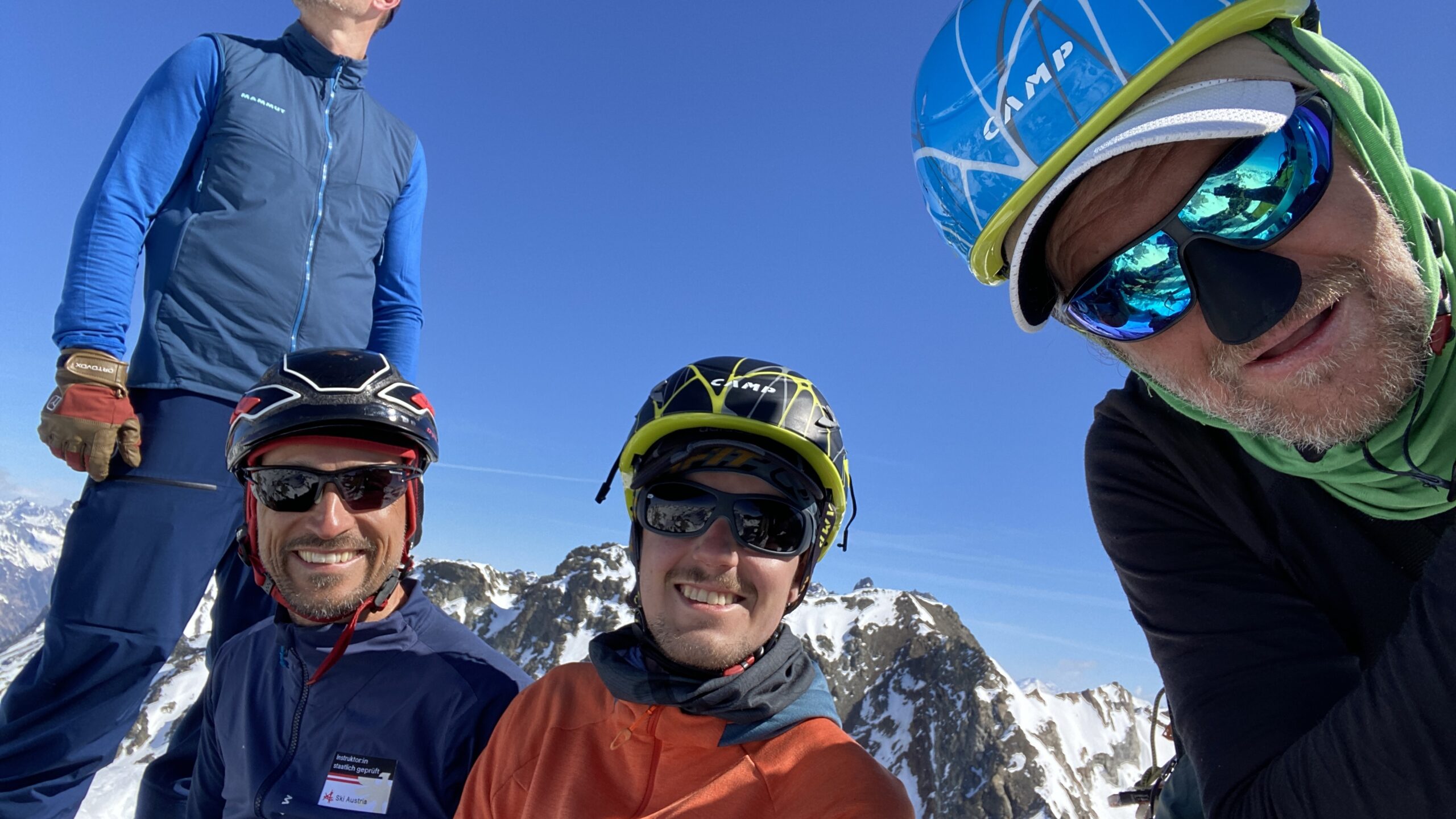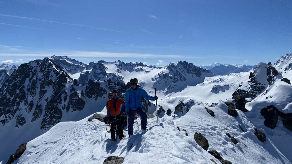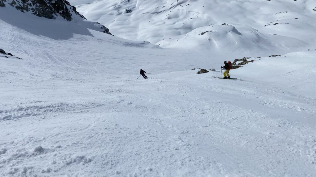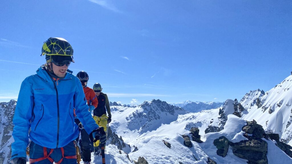 Für den Rückweg zur Wiesbadnerhütte nehmen wir den längeren Weg über die Jamtalscharte. Am Weg nehmen wir zu Übungszwecken noch einmal die Überschreitung über die Chalausköpfe mit und besteigen ein weiteres Mal den Mittleren Chalauskopf. Die Jamtalscharte ist dann etwas herausfordernder als gedacht. Das Schneeband in der Rinne ist nur noch teilweise vorhanden und ohne abseilen geht es kaum hinunter. Die ersten vier, wir haben auch noch Christian als Gast mit von der Partie, der uns schon seit ein paar Tagen „überholt“ und sich heute ganz offiziell angeschlossen hat, werden die die vollen 50 Meter abgeseilt und zum Schluß folge ich mit der halben Seillänge und steige wie die anderen den Rest stapfend ab. Gefahr besteht dabei keine, aber die feinen Steine aus dem Einstieg sind doch recht unangenehm. Dann geht es einfach zurück auf die Ochsenscharte die durch den Tagesverlauf recht weich ist. Oben entscheiden Gerald, Christian und ich uns für den Aufsteig zur Dreiländerspitze, während Oliver und Fabian bei besten Bedingungen zur Wiesbadnerhütte abfahren. Zu dritt geht es über sehr steiles Gelände (35 Grad) hinauf zum Skidepot. Am Weg fliegt noch der Inhalt eines Rucksacks an uns vorbei. Der Aufstieg zum Gipfel ist dann einfach, weil die Verhältnisse ideal sind. Der Stapfschnee ist perfekt und fast alle Felsen sind schneebedeckt. Den Sommergipfel lassen wir aus. Den Winter-Gipfel genießen wir nur kurz, weil hinter uns eine Gruppe mit über zehn Skitourengeher:innen heraufkommt und kein Platz ist. Der Abstieg ist dann ebenso unproblematisch und die Abfahrt auf die Wiesbadner sehr lässig.