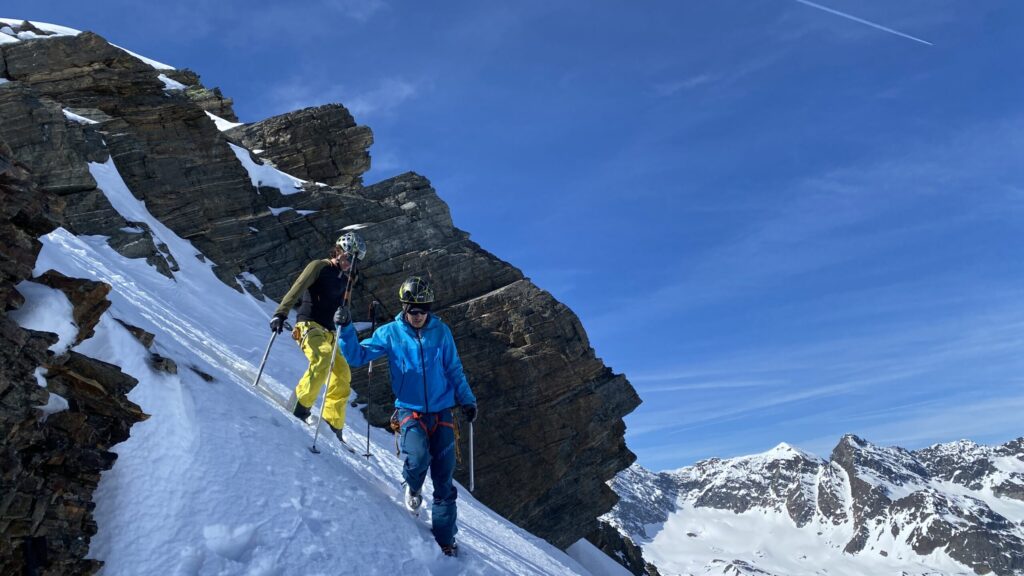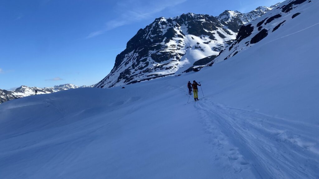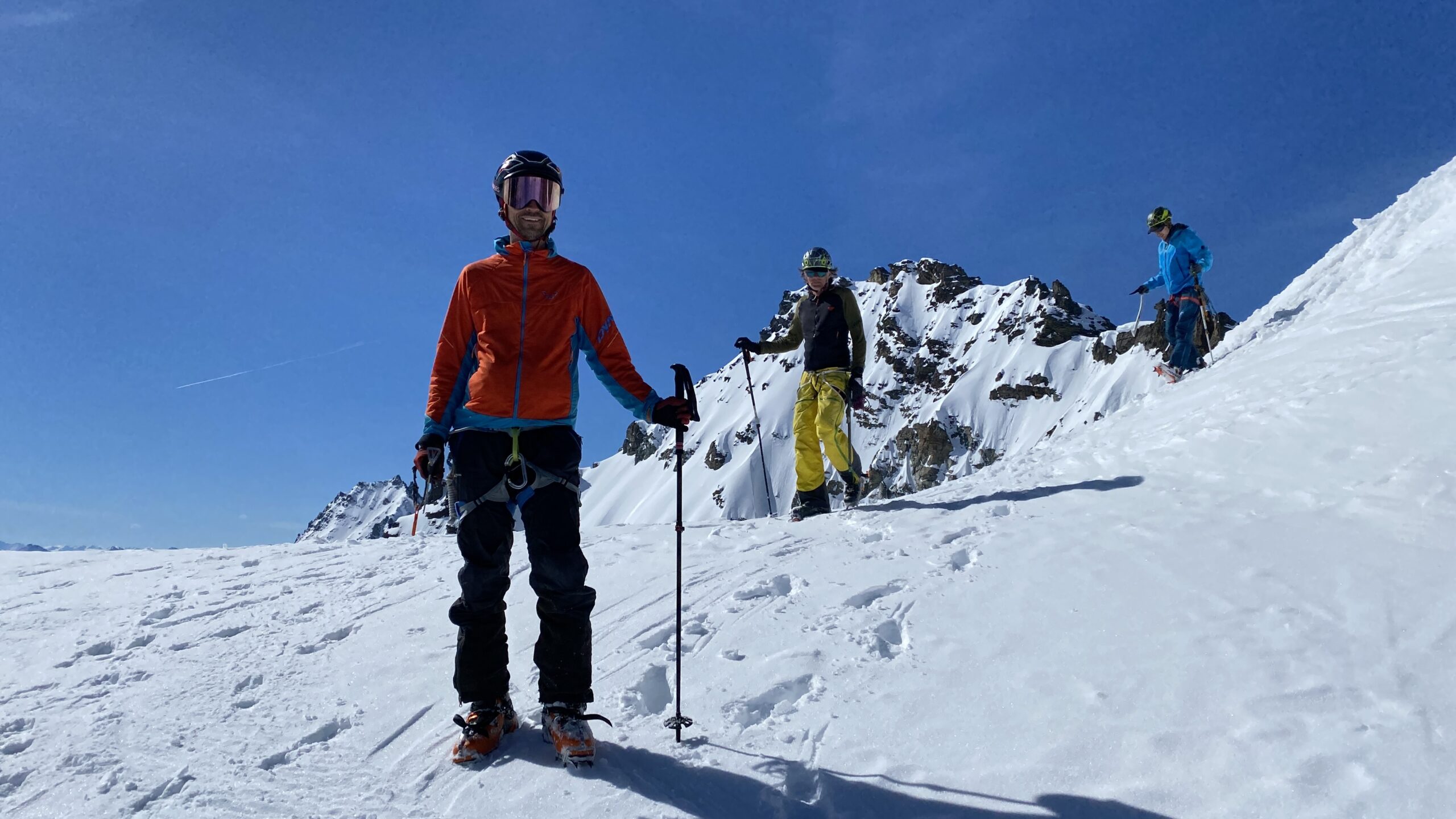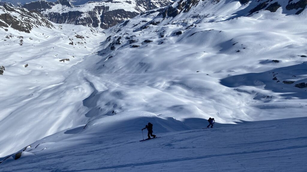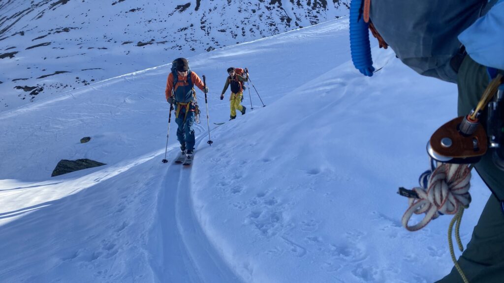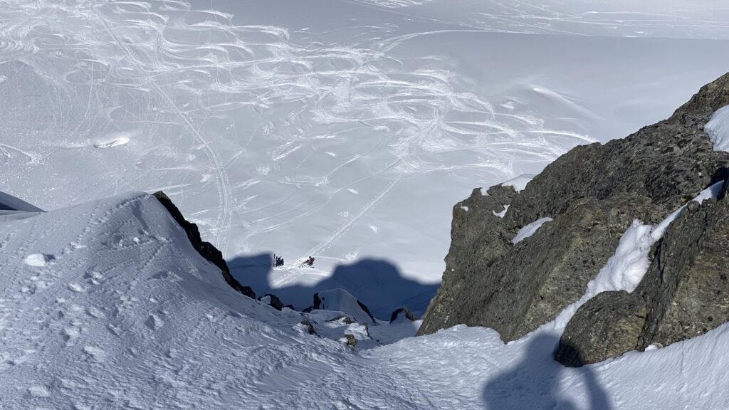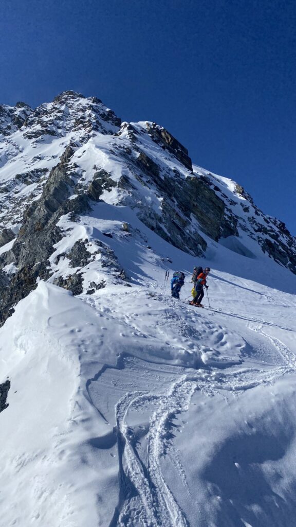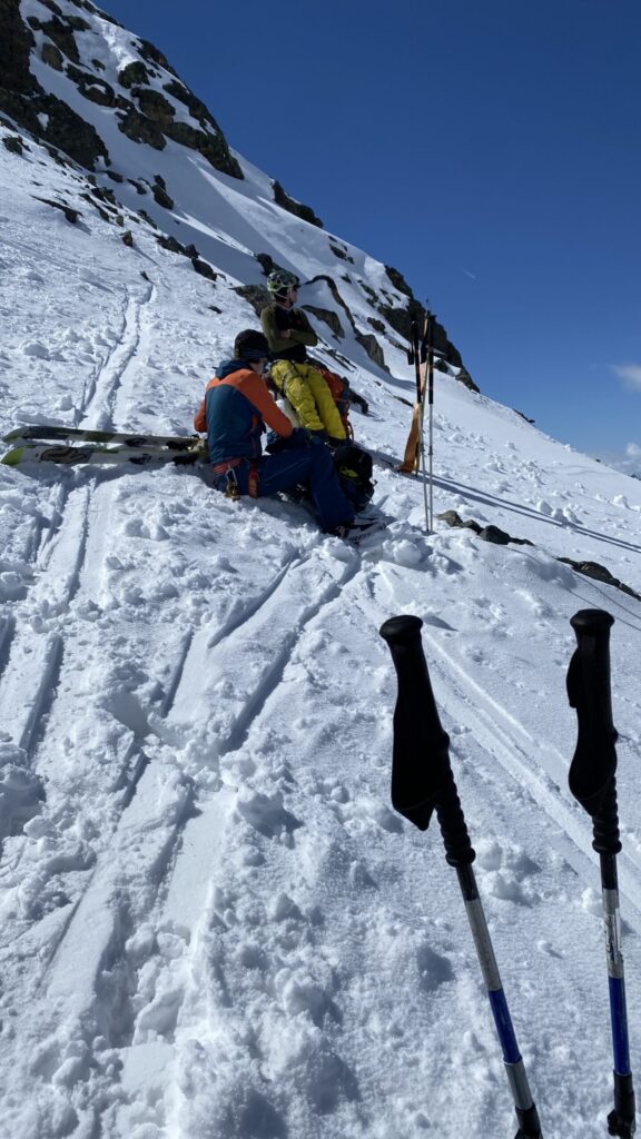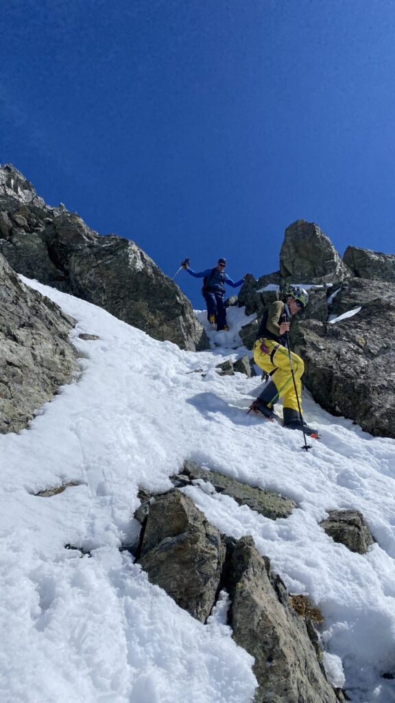 Für den Rückweg zur Wiesbadnerhütte nehmen wir den längeren Weg über die Jamtalscharte. Am Weg nehmen wir zu Übungszwecken noch einmal die Überschreitung über die Chalausköpfe mit und besteigen ein weiteres Mal den Mittleren Chalauskopf. Die Jamtalscharte ist dann etwas herausfordernder als gedacht. Das Schneeband in der Rinne ist nur noch teilweise vorhanden und ohne abseilen geht es kaum hinunter. Die ersten vier, wir haben auch noch Christian als Gast mit von der Partie, der uns schon seit ein paar Tagen „überholt“ und sich heute ganz offiziell angeschlossen hat, werden die die vollen 50 Meter abgeseilt und zum Schluß folge ich mit der halben Seillänge und steige wie die anderen den Rest stapfend ab. Gefahr besteht dabei keine, aber die feinen Steine aus dem Einstieg sind doch recht unangenehm. Dann geht es einfach zurück auf die Ochsenscharte die durch den Tagesverlauf recht weich ist. Oben entscheiden Gerald, Christian und ich uns für den Aufsteig zur Dreiländerspitze, während Oliver und Fabian bei besten Bedingungen zur Wiesbadnerhütte abfahren. Zu dritt geht es über sehr steiles Gelände (35 Grad) hinauf zum Skidepot. Am Weg fliegt noch der Inhalt eines Rucksacks an uns vorbei. Der Aufstieg zum Gipfel ist dann einfach, weil die Verhältnisse ideal sind. Der Stapfschnee ist perfekt und fast alle Felsen sind schneebedeckt. Den Sommergipfel lassen wir aus. Den Winter-Gipfel genießen wir nur kurz, weil hinter uns eine Gruppe mit über zehn Skitourengeher:innen heraufkommt und kein Platz ist. Der Abstieg ist dann ebenso unproblematisch und die Abfahrt auf die Wiesbadner sehr lässig.