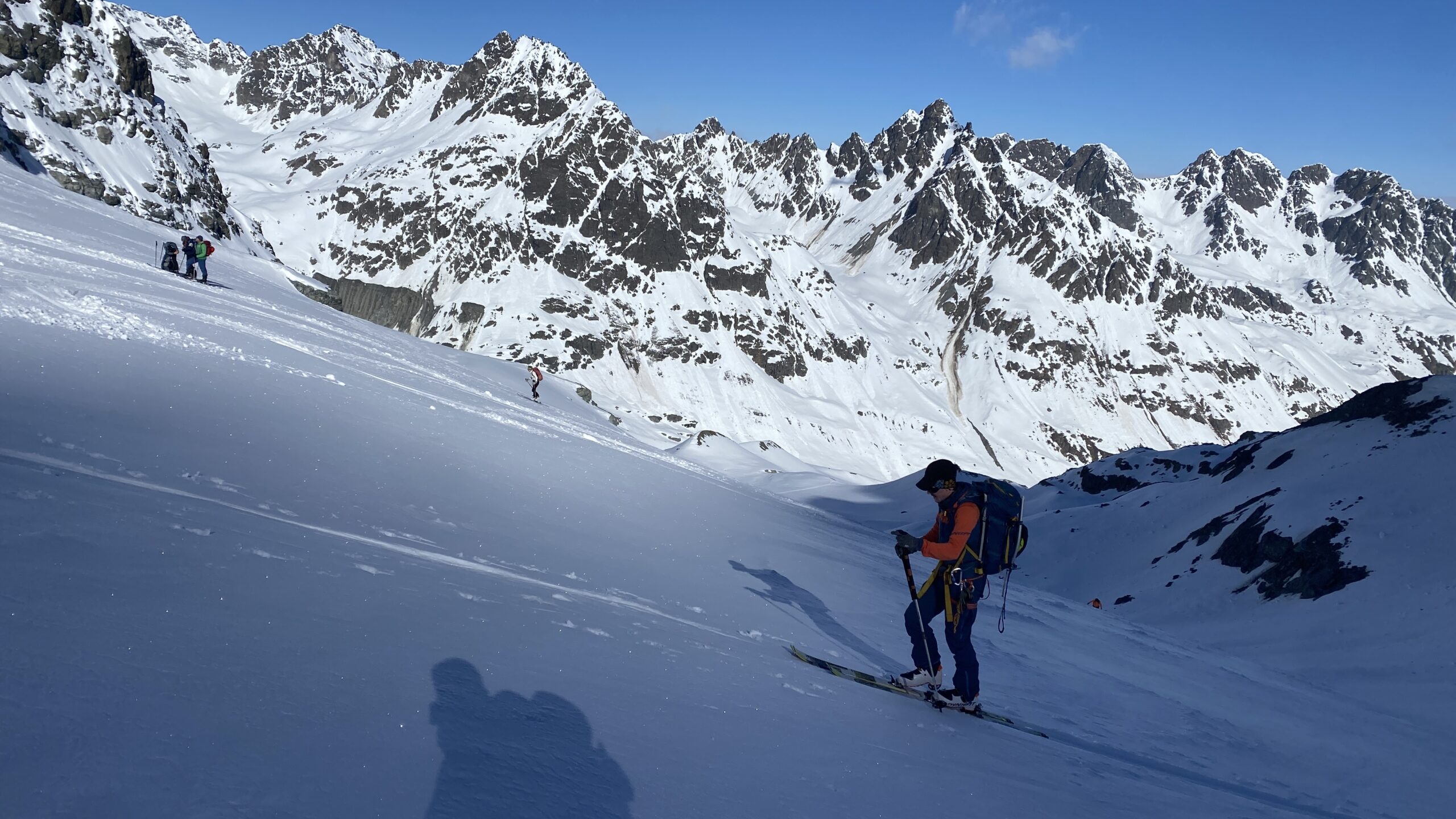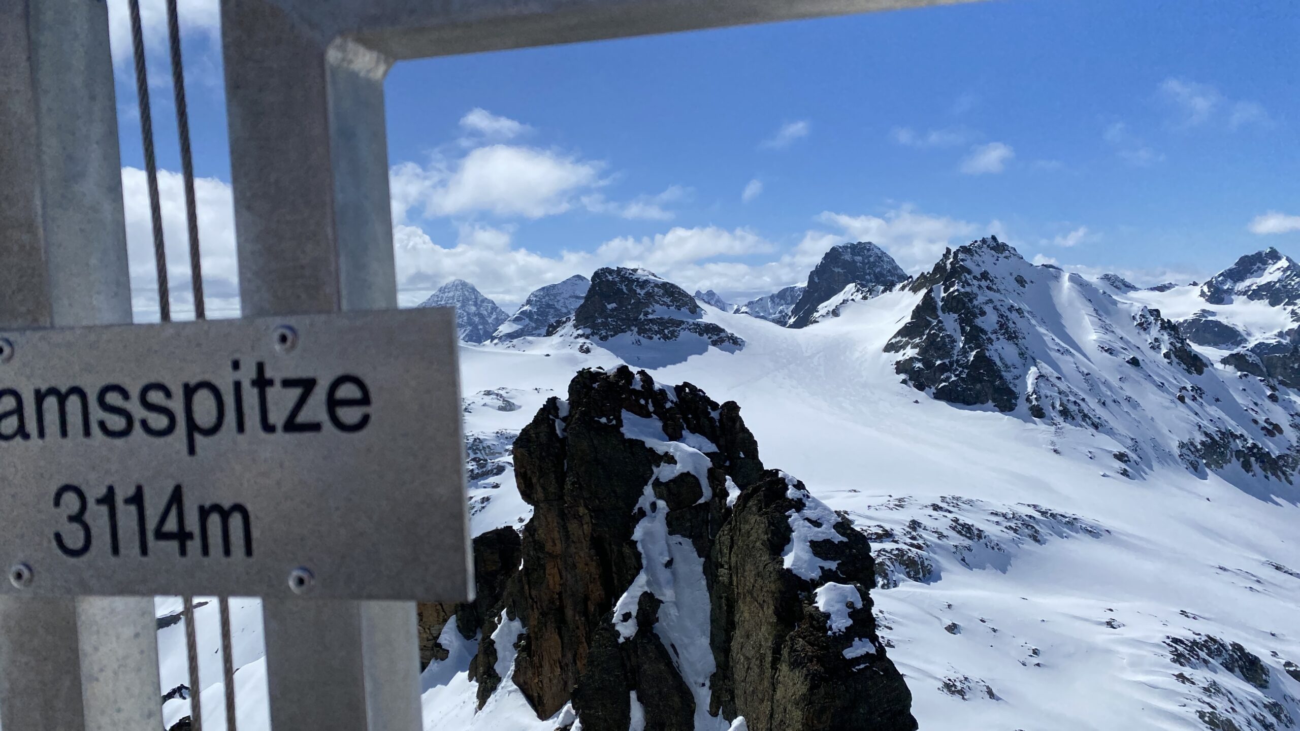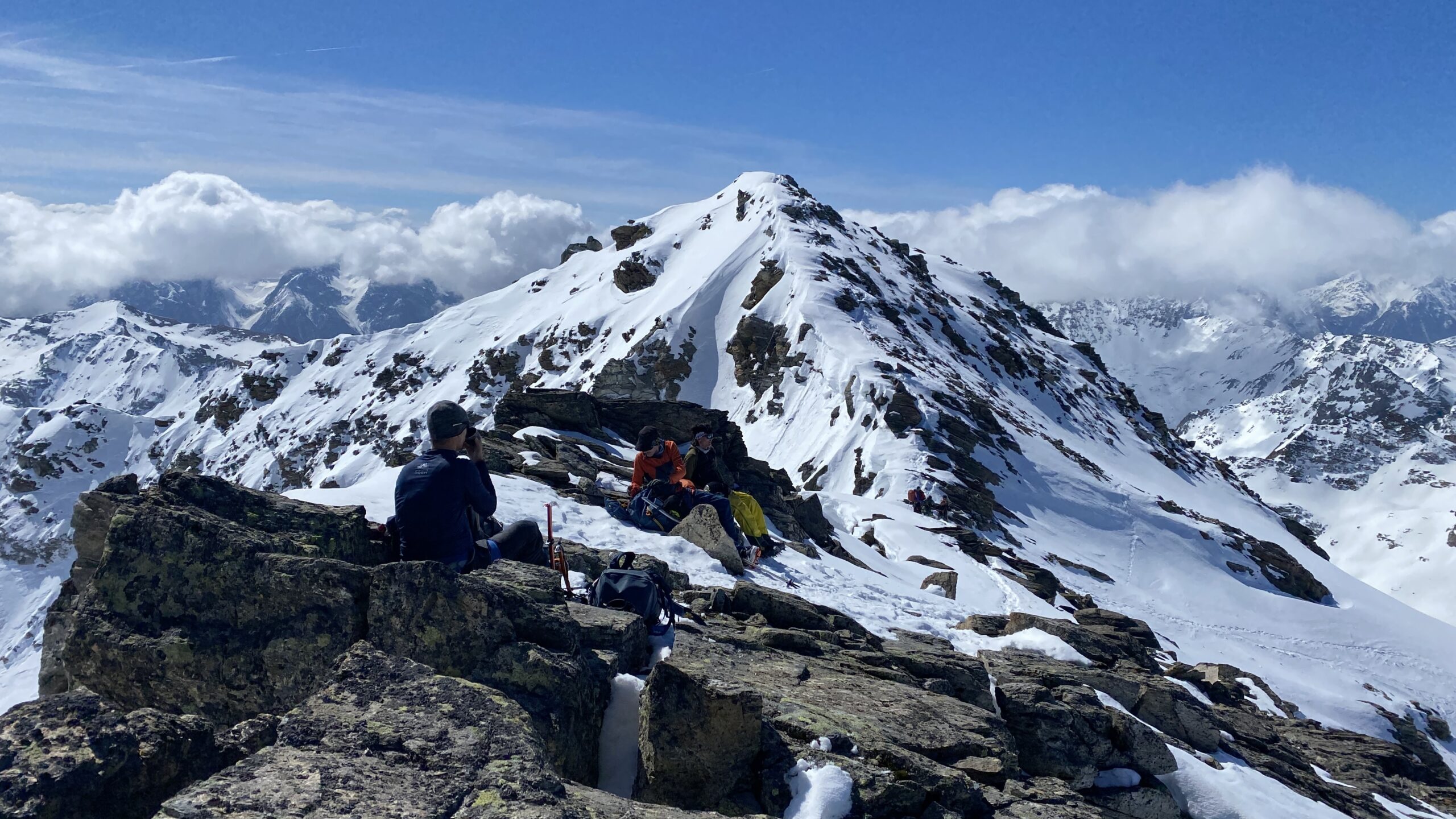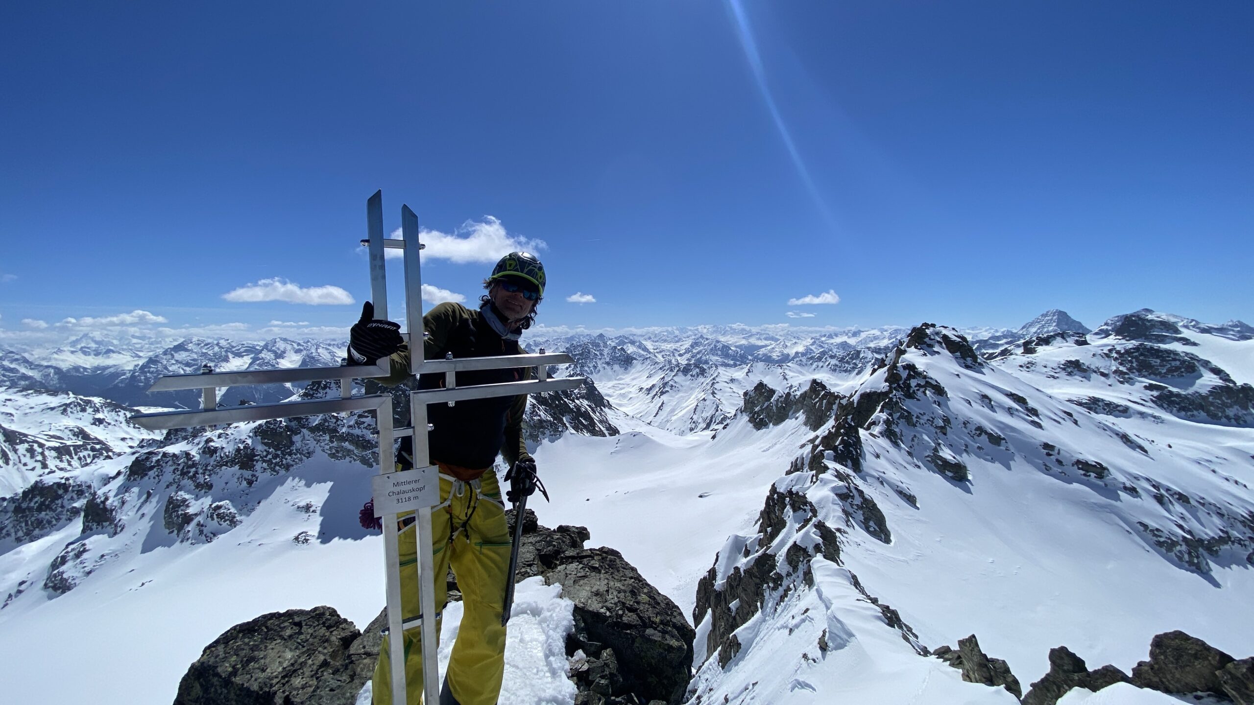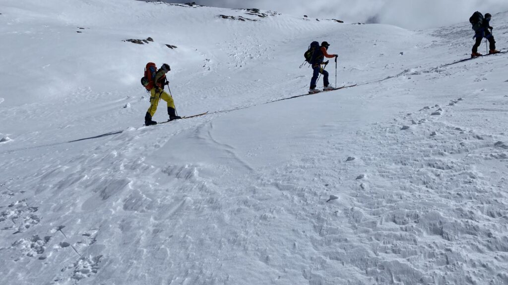 Für den Rückweg zur Wiesbadnerhütte nehmen wir den längeren Weg über die Jamtalscharte. Am Weg nehmen wir zu Übungszwecken noch einmal die Überschreitung über die Chalausköpfe mit und besteigen ein weiteres Mal den Mittleren Chalauskopf. Die Jamtalscharte ist dann etwas herausfordernder als gedacht. Das Schneeband in der Rinne ist nur noch teilweise vorhanden und ohne abseilen geht es kaum hinunter. Die ersten vier, wir haben auch noch Christian als Gast mit von der Partie, der uns schon seit ein paar Tagen „überholt“ und sich heute ganz offiziell angeschlossen hat, werden die die vollen 50 Meter abgeseilt und zum Schluß folge ich mit der halben Seillänge und steige wie die anderen den Rest stapfend ab. Gefahr besteht dabei keine, aber die feinen Steine aus dem Einstieg sind doch recht unangenehm. Dann geht es einfach zurück auf die Ochsenscharte die durch den Tagesverlauf recht weich ist. Oben entscheiden Gerald, Christian und ich uns für den Aufsteig zur Dreiländerspitze, während Oliver und Fabian bei besten Bedingungen zur Wiesbadnerhütte abfahren. Zu dritt geht es über sehr steiles Gelände (35 Grad) hinauf zum Skidepot. Am Weg fliegt noch der Inhalt eines Rucksacks an uns vorbei. Der Aufstieg zum Gipfel ist dann einfach, weil die Verhältnisse ideal sind. Der Stapfschnee ist perfekt und fast alle Felsen sind schneebedeckt. Den Sommergipfel lassen wir aus. Den Winter-Gipfel genießen wir nur kurz, weil hinter uns eine Gruppe mit über zehn Skitourengeher:innen heraufkommt und kein Platz ist. Der Abstieg ist dann ebenso unproblematisch und die Abfahrt auf die Wiesbadner sehr lässig.