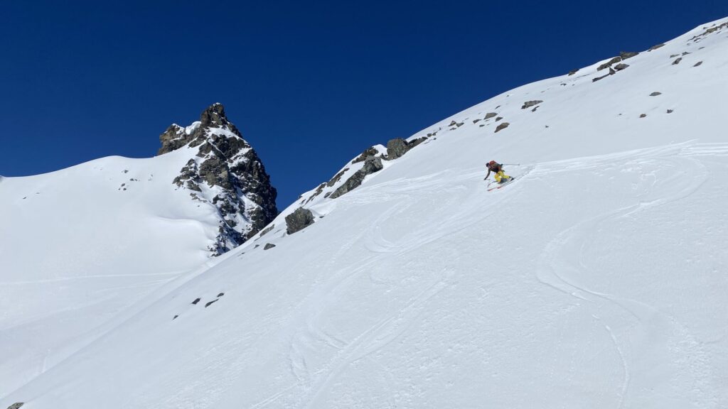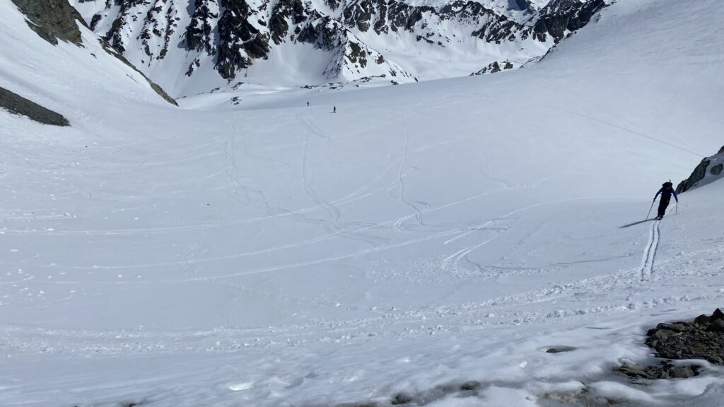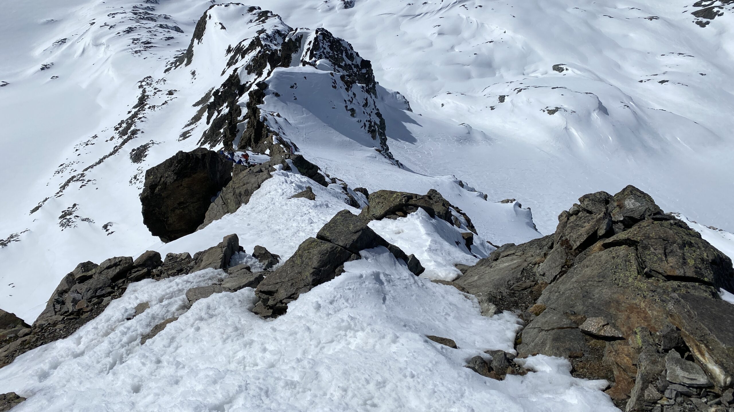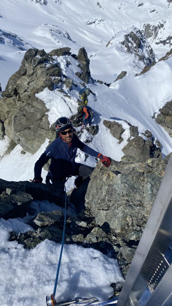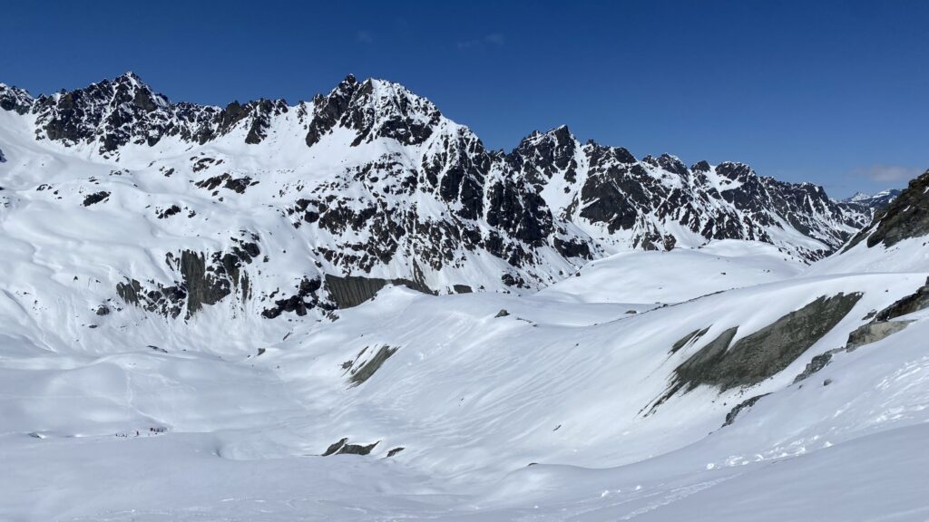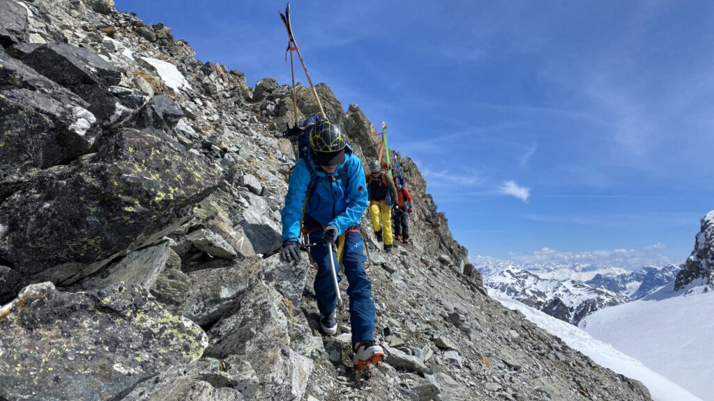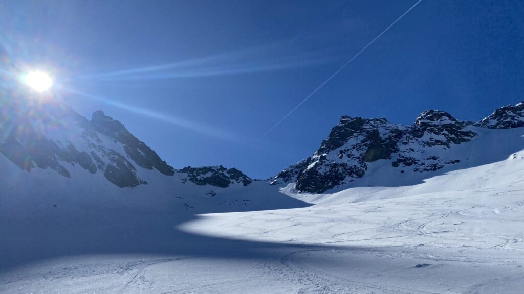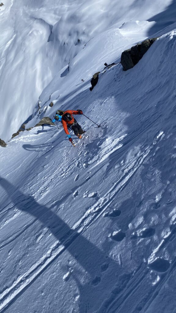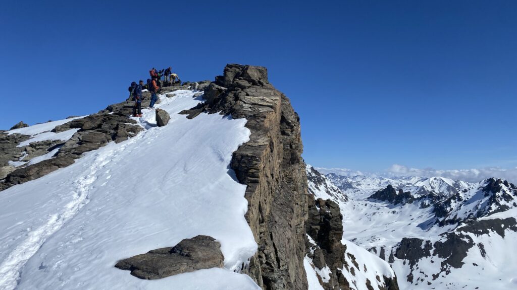 Für den Rückweg zur Wiesbadnerhütte nehmen wir den längeren Weg über die Jamtalscharte. Am Weg nehmen wir zu Übungszwecken noch einmal die Überschreitung über die Chalausköpfe mit und besteigen ein weiteres Mal den Mittleren Chalauskopf. Die Jamtalscharte ist dann etwas herausfordernder als gedacht. Das Schneeband in der Rinne ist nur noch teilweise vorhanden und ohne abseilen geht es kaum hinunter. Die ersten vier, wir haben auch noch Christian als Gast mit von der Partie, der uns schon seit ein paar Tagen „überholt“ und sich heute ganz offiziell angeschlossen hat, werden die die vollen 50 Meter abgeseilt und zum Schluß folge ich mit der halben Seillänge und steige wie die anderen den Rest stapfend ab. Gefahr besteht dabei keine, aber die feinen Steine aus dem Einstieg sind doch recht unangenehm. Dann geht es einfach zurück auf die Ochsenscharte die durch den Tagesverlauf recht weich ist. Oben entscheiden Gerald, Christian und ich uns für den Aufsteig zur Dreiländerspitze, während Oliver und Fabian bei besten Bedingungen zur Wiesbadnerhütte abfahren. Zu dritt geht es über sehr steiles Gelände (35 Grad) hinauf zum Skidepot. Am Weg fliegt noch der Inhalt eines Rucksacks an uns vorbei. Der Aufstieg zum Gipfel ist dann einfach, weil die Verhältnisse ideal sind. Der Stapfschnee ist perfekt und fast alle Felsen sind schneebedeckt. Den Sommergipfel lassen wir aus. Den Winter-Gipfel genießen wir nur kurz, weil hinter uns eine Gruppe mit über zehn Skitourengeher:innen heraufkommt und kein Platz ist. Der Abstieg ist dann ebenso unproblematisch und die Abfahrt auf die Wiesbadner sehr lässig.