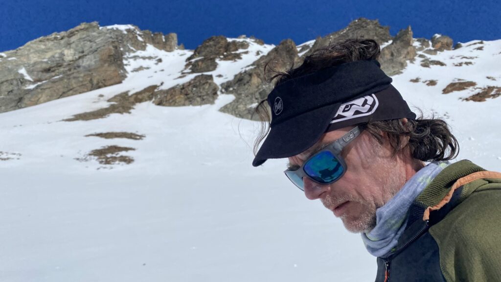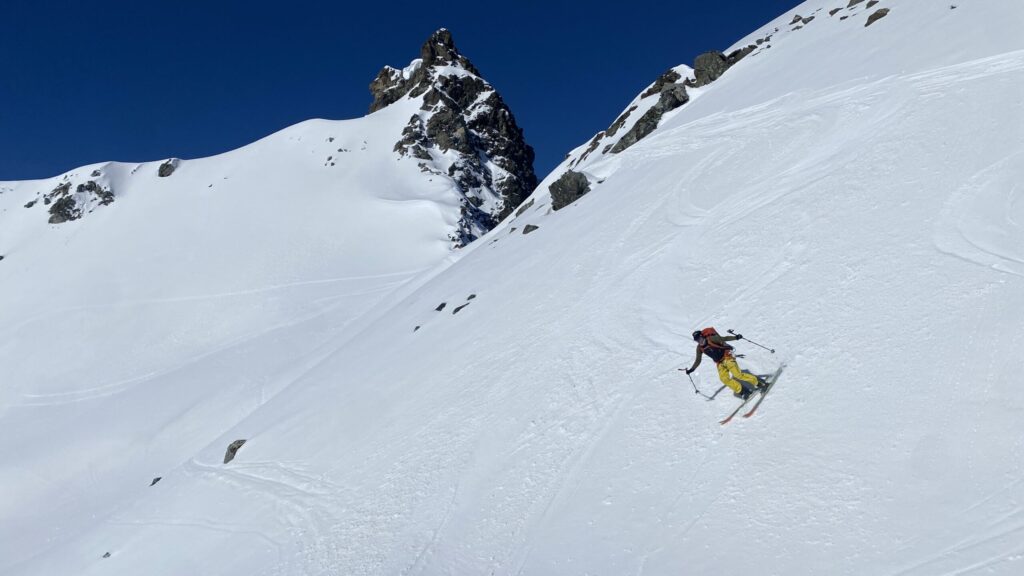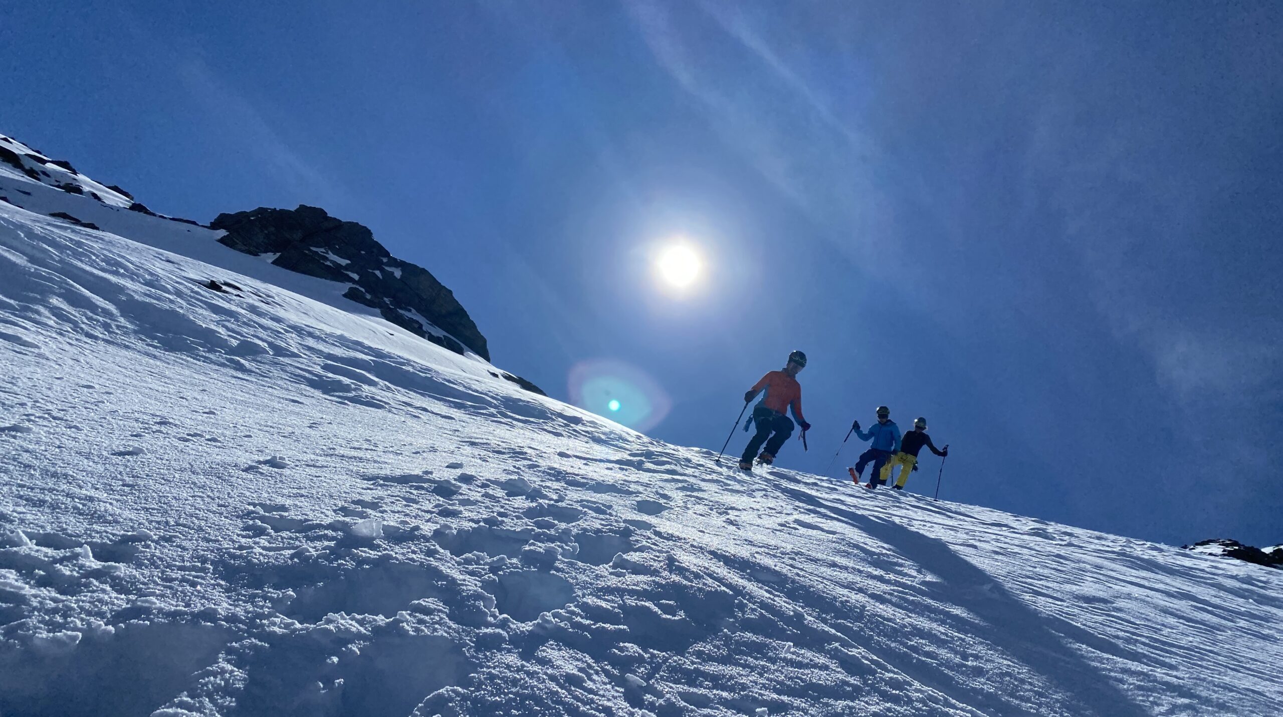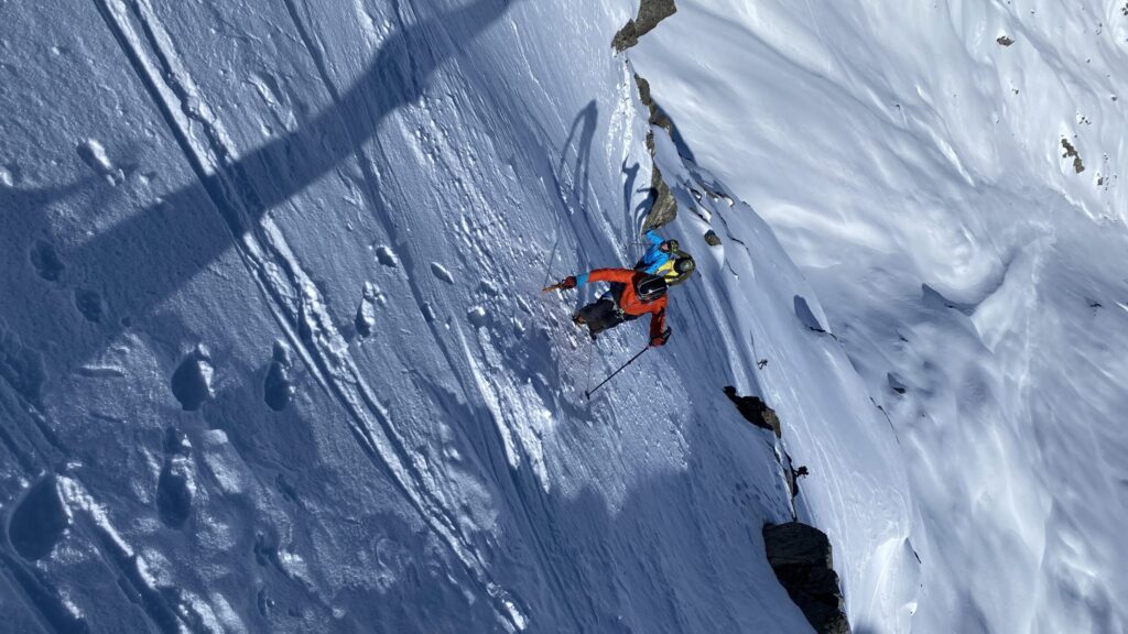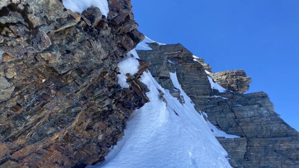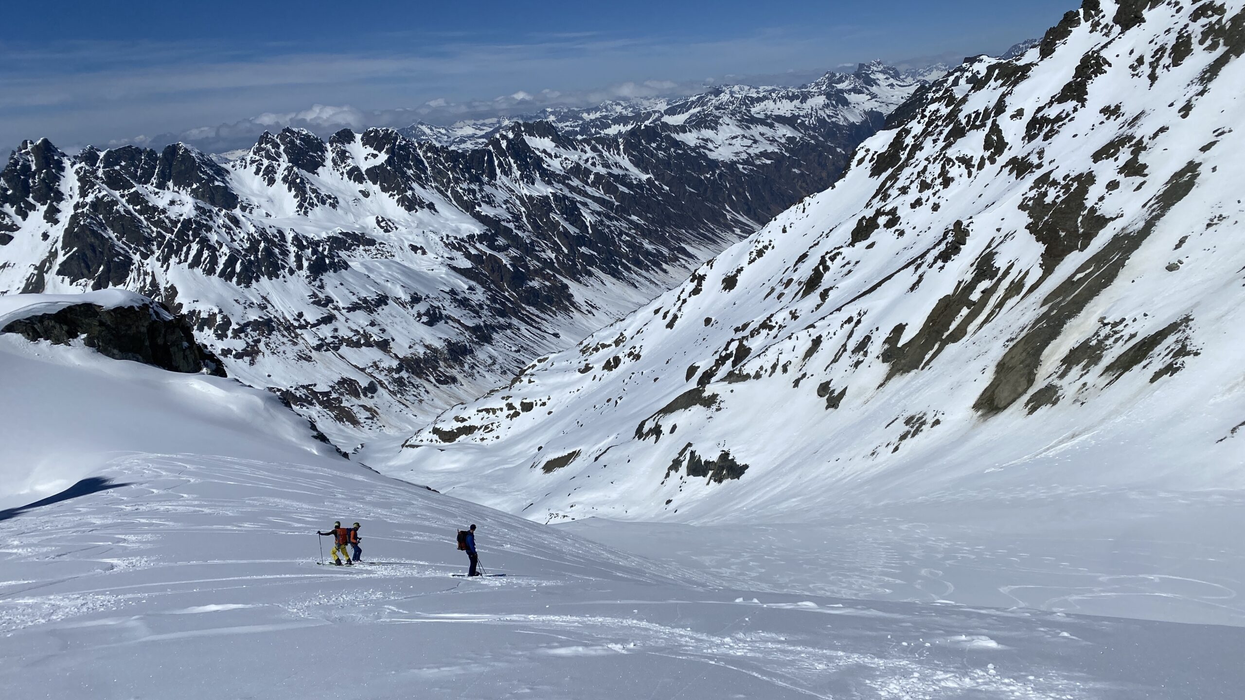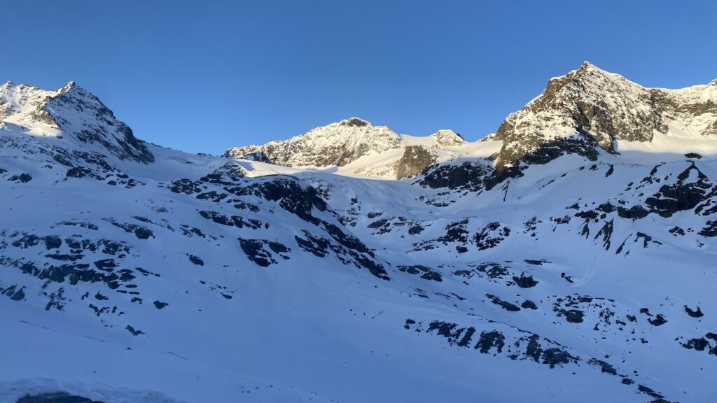Für den Rückweg zur Wiesbadnerhütte nehmen wir den längeren Weg über die Jamtalscharte. Am Weg nehmen wir zu Übungszwecken noch einmal die Überschreitung über die Chalausköpfe mit und besteigen ein weiteres Mal den Mittleren Chalauskopf. Die Jamtalscharte ist dann etwas herausfordernder als gedacht. Das Schneeband in der Rinne ist nur noch teilweise vorhanden und ohne abseilen geht es kaum hinunter. Die ersten vier, wir haben auch noch Christian als Gast mit von der Partie, der uns schon seit ein paar Tagen „überholt“ und sich heute ganz offiziell angeschlossen hat, werden die die vollen 50 Meter abgeseilt und zum Schluß folge ich mit der halben Seillänge und steige wie die anderen den Rest stapfend ab. Gefahr besteht dabei keine, aber die feinen Steine aus dem Einstieg sind doch recht unangenehm. Dann geht es einfach zurück auf die Ochsenscharte die durch den Tagesverlauf recht weich ist. Oben entscheiden Gerald, Christian und ich uns für den Aufsteig zur Dreiländerspitze, während Oliver und Fabian bei besten Bedingungen zur Wiesbadnerhütte abfahren. Zu dritt geht es über sehr steiles Gelände (35 Grad) hinauf zum Skidepot. Am Weg fliegt noch der Inhalt eines Rucksacks an uns vorbei. Der Aufstieg zum Gipfel ist dann einfach, weil die Verhältnisse ideal sind. Der Stapfschnee ist perfekt und fast alle Felsen sind schneebedeckt. Den Sommergipfel lassen wir aus. Den Winter-Gipfel genießen wir nur kurz, weil hinter uns eine Gruppe mit über zehn Skitourengeher:innen heraufkommt und kein Platz ist. Der Abstieg ist dann ebenso unproblematisch und die Abfahrt auf die Wiesbadner sehr lässig.