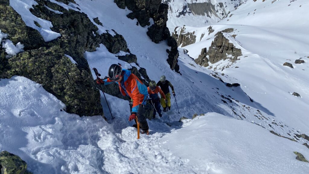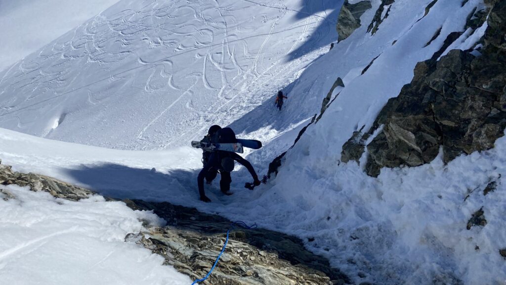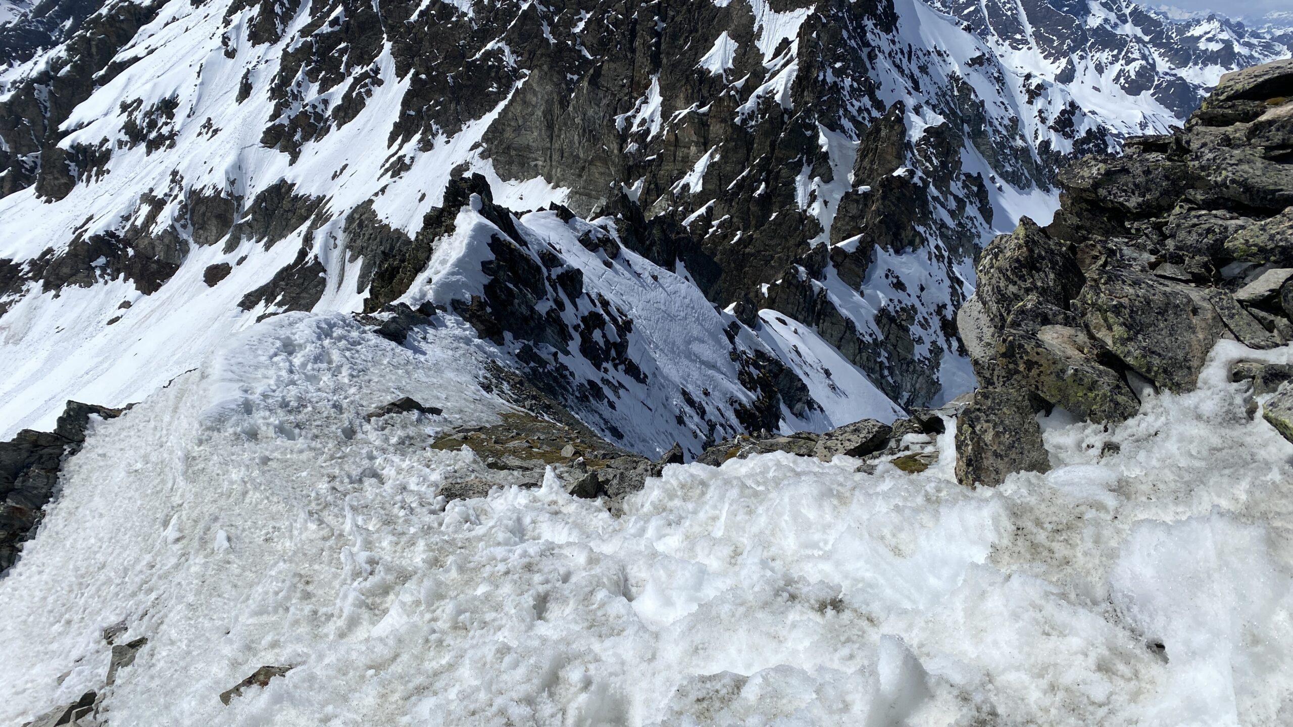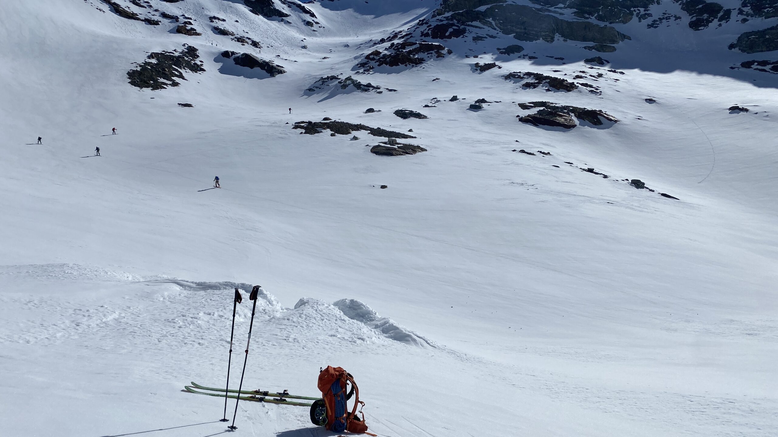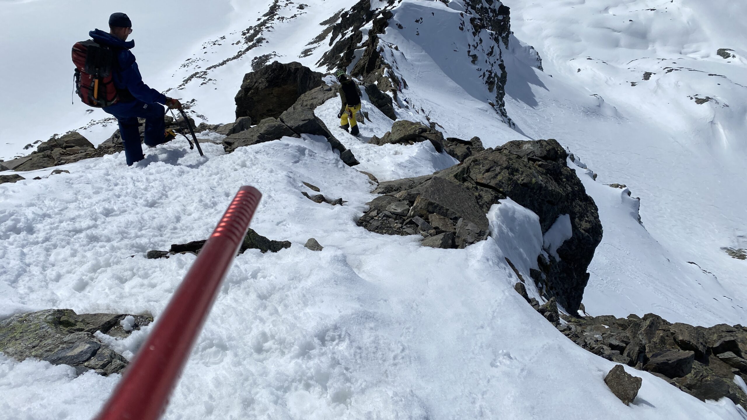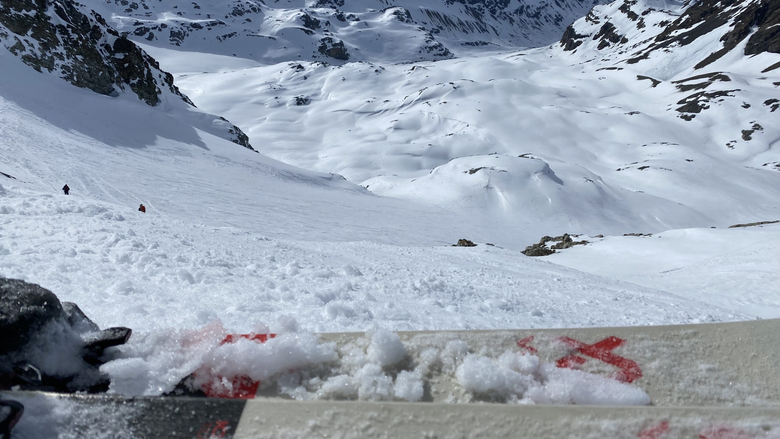 Für den Rückweg zur Wiesbadnerhütte nehmen wir den längeren Weg über die Jamtalscharte. Am Weg nehmen wir zu Übungszwecken noch einmal die Überschreitung über die Chalausköpfe mit und besteigen ein weiteres Mal den Mittleren Chalauskopf. Die Jamtalscharte ist dann etwas herausfordernder als gedacht. Das Schneeband in der Rinne ist nur noch teilweise vorhanden und ohne abseilen geht es kaum hinunter. Die ersten vier, wir haben auch noch Christian als Gast mit von der Partie, der uns schon seit ein paar Tagen „überholt“ und sich heute ganz offiziell angeschlossen hat, werden die die vollen 50 Meter abgeseilt und zum Schluß folge ich mit der halben Seillänge und steige wie die anderen den Rest stapfend ab. Gefahr besteht dabei keine, aber die feinen Steine aus dem Einstieg sind doch recht unangenehm. Dann geht es einfach zurück auf die Ochsenscharte die durch den Tagesverlauf recht weich ist. Oben entscheiden Gerald, Christian und ich uns für den Aufsteig zur Dreiländerspitze, während Oliver und Fabian bei besten Bedingungen zur Wiesbadnerhütte abfahren. Zu dritt geht es über sehr steiles Gelände (35 Grad) hinauf zum Skidepot. Am Weg fliegt noch der Inhalt eines Rucksacks an uns vorbei. Der Aufstieg zum Gipfel ist dann einfach, weil die Verhältnisse ideal sind. Der Stapfschnee ist perfekt und fast alle Felsen sind schneebedeckt. Den Sommergipfel lassen wir aus. Den Winter-Gipfel genießen wir nur kurz, weil hinter uns eine Gruppe mit über zehn Skitourengeher:innen heraufkommt und kein Platz ist. Der Abstieg ist dann ebenso unproblematisch und die Abfahrt auf die Wiesbadner sehr lässig.
