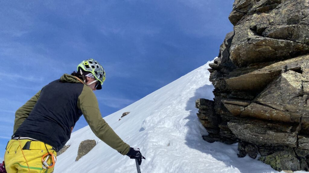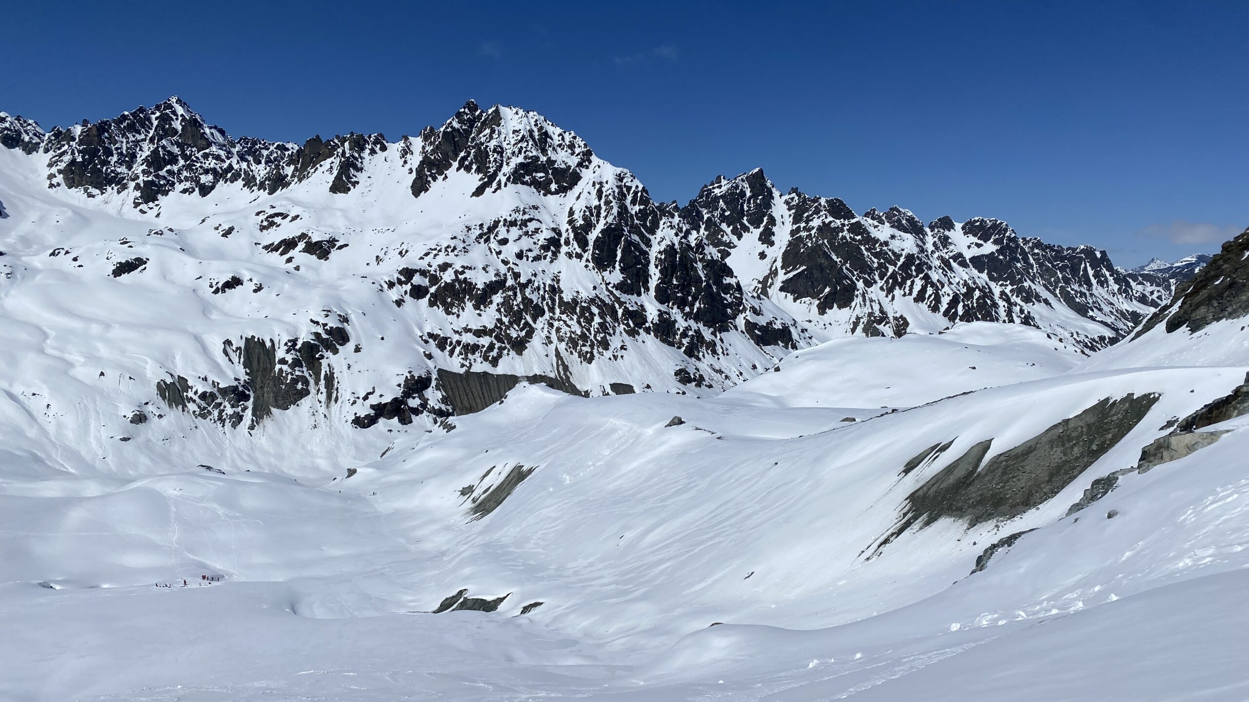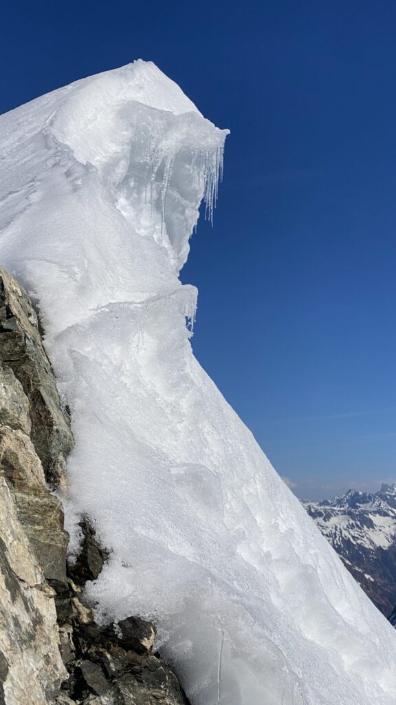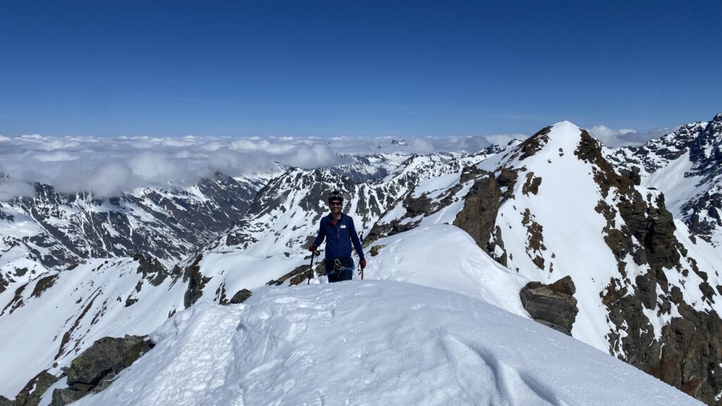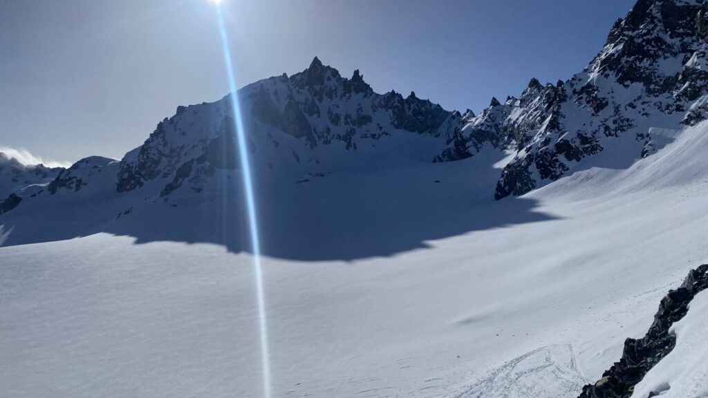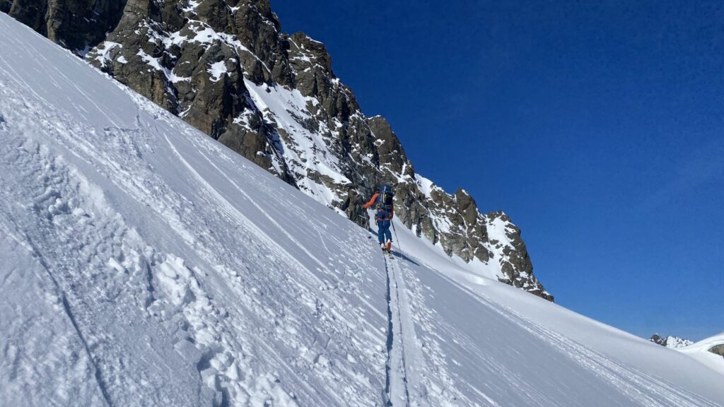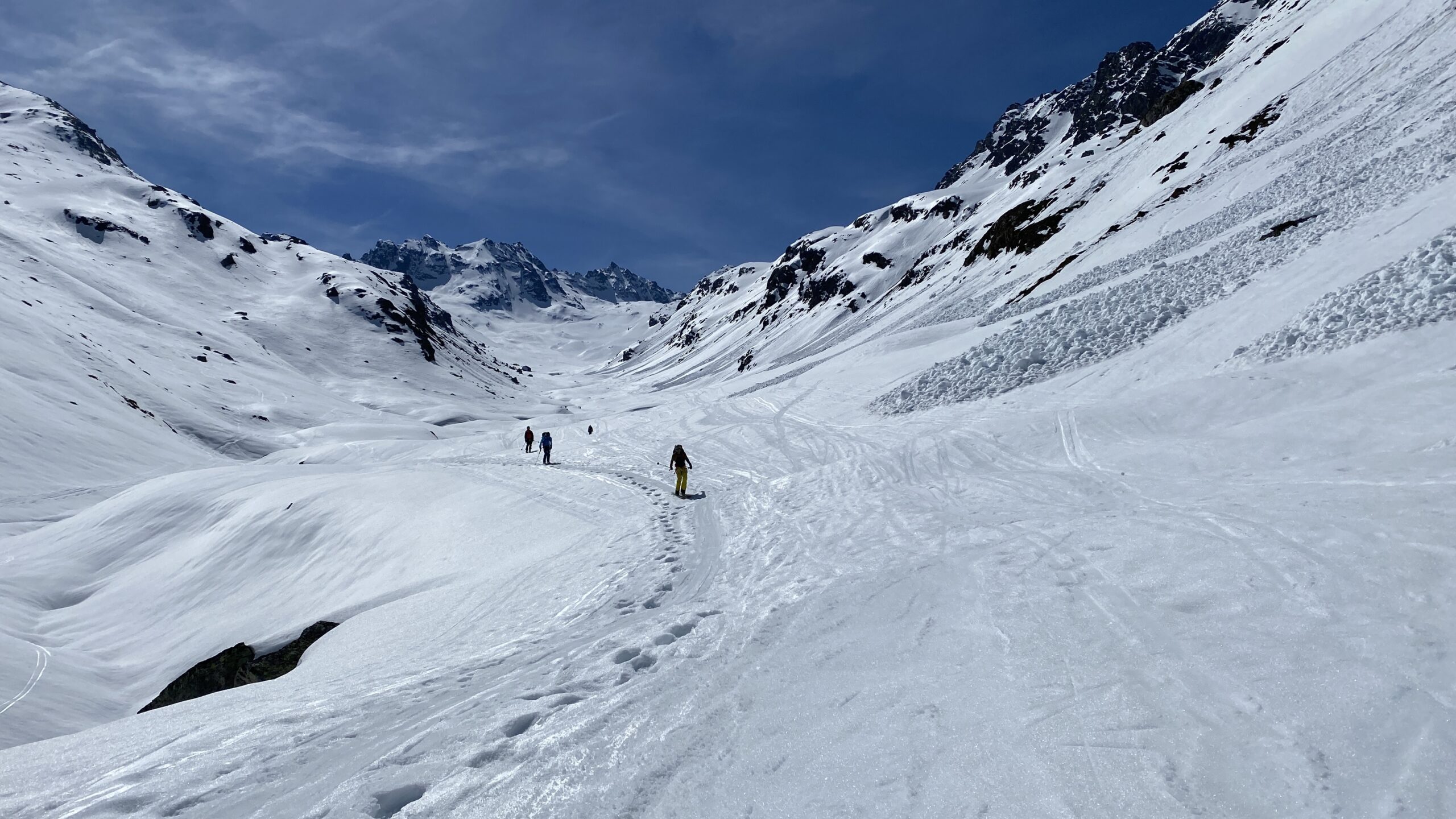 Für den Rückweg zur Wiesbadnerhütte nehmen wir den längeren Weg über die Jamtalscharte. Am Weg nehmen wir zu Übungszwecken noch einmal die Überschreitung über die Chalausköpfe mit und besteigen ein weiteres Mal den Mittleren Chalauskopf. Die Jamtalscharte ist dann etwas herausfordernder als gedacht. Das Schneeband in der Rinne ist nur noch teilweise vorhanden und ohne abseilen geht es kaum hinunter. Die ersten vier, wir haben auch noch Christian als Gast mit von der Partie, der uns schon seit ein paar Tagen „überholt“ und sich heute ganz offiziell angeschlossen hat, werden die die vollen 50 Meter abgeseilt und zum Schluß folge ich mit der halben Seillänge und steige wie die anderen den Rest stapfend ab. Gefahr besteht dabei keine, aber die feinen Steine aus dem Einstieg sind doch recht unangenehm. Dann geht es einfach zurück auf die Ochsenscharte die durch den Tagesverlauf recht weich ist. Oben entscheiden Gerald, Christian und ich uns für den Aufsteig zur Dreiländerspitze, während Oliver und Fabian bei besten Bedingungen zur Wiesbadnerhütte abfahren. Zu dritt geht es über sehr steiles Gelände (35 Grad) hinauf zum Skidepot. Am Weg fliegt noch der Inhalt eines Rucksacks an uns vorbei. Der Aufstieg zum Gipfel ist dann einfach, weil die Verhältnisse ideal sind. Der Stapfschnee ist perfekt und fast alle Felsen sind schneebedeckt. Den Sommergipfel lassen wir aus. Den Winter-Gipfel genießen wir nur kurz, weil hinter uns eine Gruppe mit über zehn Skitourengeher:innen heraufkommt und kein Platz ist. Der Abstieg ist dann ebenso unproblematisch und die Abfahrt auf die Wiesbadner sehr lässig.