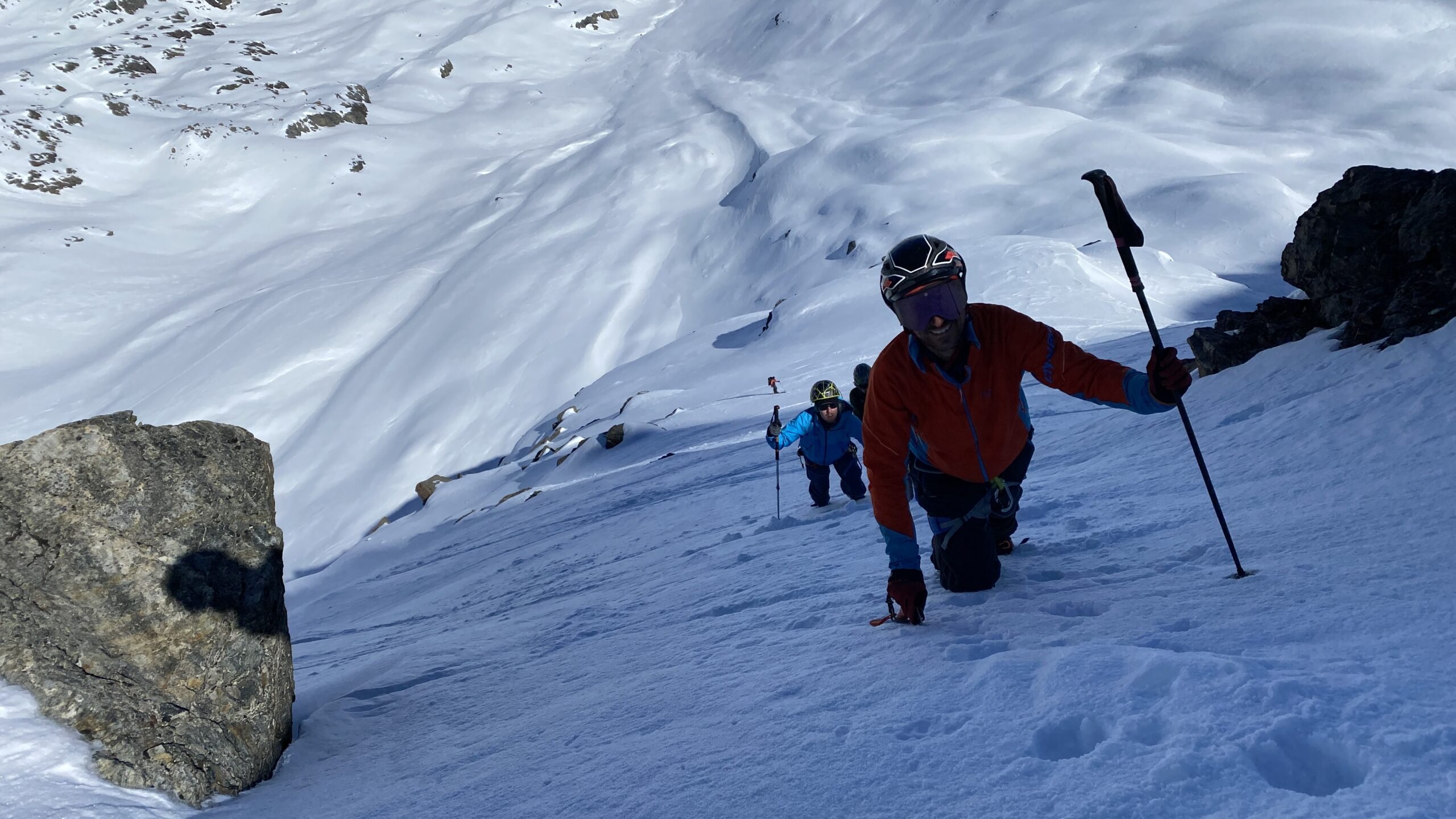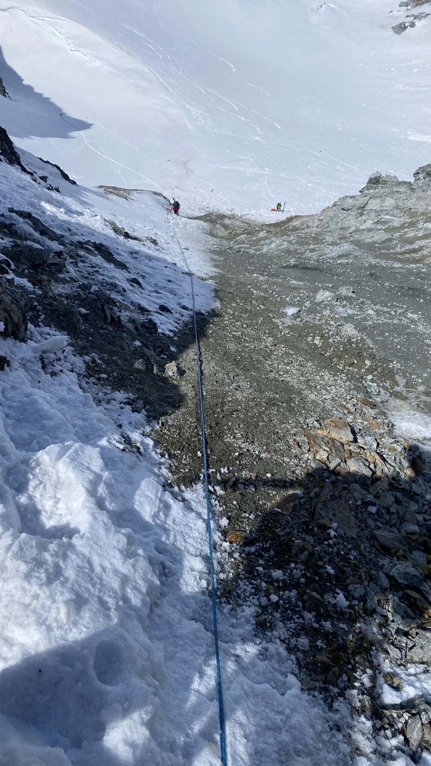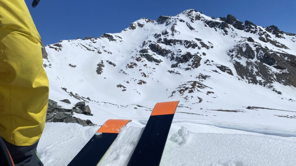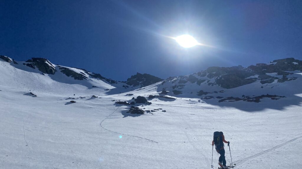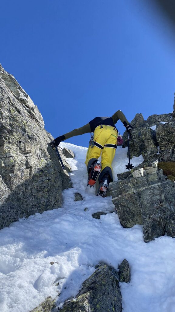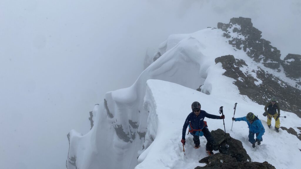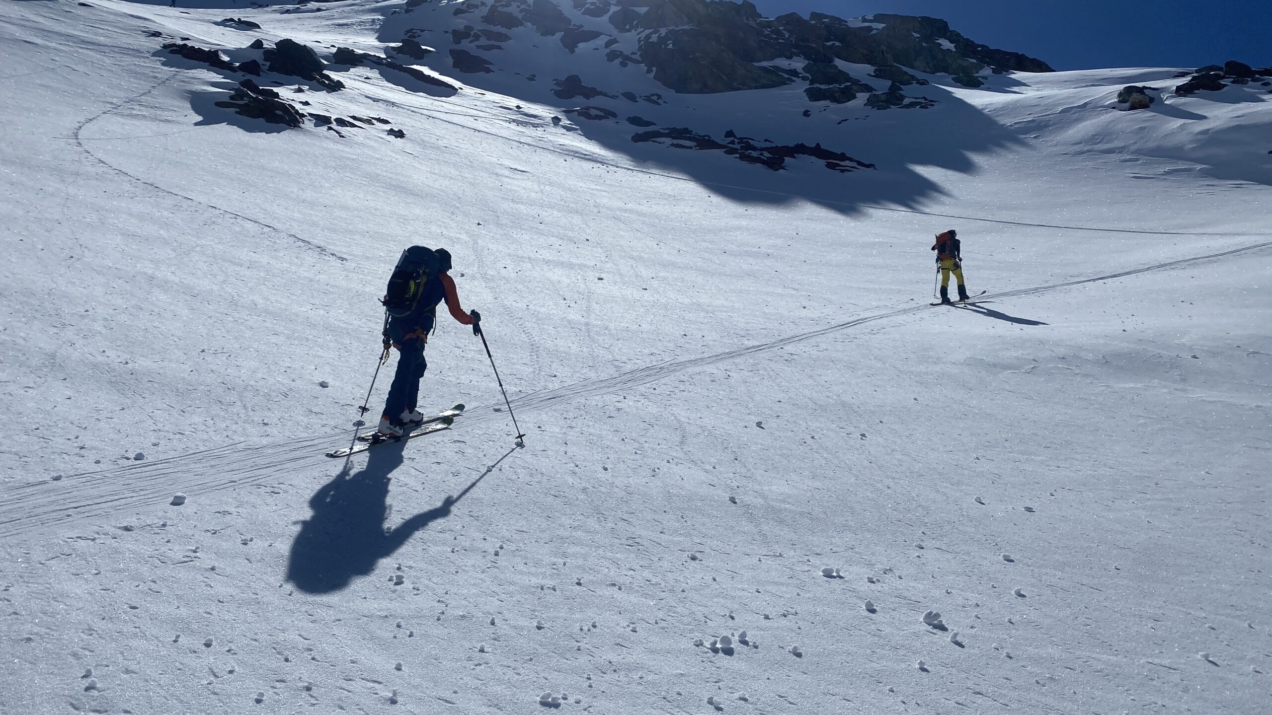 Für den Rückweg zur Wiesbadnerhütte nehmen wir den längeren Weg über die Jamtalscharte. Am Weg nehmen wir zu Übungszwecken noch einmal die Überschreitung über die Chalausköpfe mit und besteigen ein weiteres Mal den Mittleren Chalauskopf. Die Jamtalscharte ist dann etwas herausfordernder als gedacht. Das Schneeband in der Rinne ist nur noch teilweise vorhanden und ohne abseilen geht es kaum hinunter. Die ersten vier, wir haben auch noch Christian als Gast mit von der Partie, der uns schon seit ein paar Tagen „überholt“ und sich heute ganz offiziell angeschlossen hat, werden die die vollen 50 Meter abgeseilt und zum Schluß folge ich mit der halben Seillänge und steige wie die anderen den Rest stapfend ab. Gefahr besteht dabei keine, aber die feinen Steine aus dem Einstieg sind doch recht unangenehm. Dann geht es einfach zurück auf die Ochsenscharte die durch den Tagesverlauf recht weich ist. Oben entscheiden Gerald, Christian und ich uns für den Aufsteig zur Dreiländerspitze, während Oliver und Fabian bei besten Bedingungen zur Wiesbadnerhütte abfahren. Zu dritt geht es über sehr steiles Gelände (35 Grad) hinauf zum Skidepot. Am Weg fliegt noch der Inhalt eines Rucksacks an uns vorbei. Der Aufstieg zum Gipfel ist dann einfach, weil die Verhältnisse ideal sind. Der Stapfschnee ist perfekt und fast alle Felsen sind schneebedeckt. Den Sommergipfel lassen wir aus. Den Winter-Gipfel genießen wir nur kurz, weil hinter uns eine Gruppe mit über zehn Skitourengeher:innen heraufkommt und kein Platz ist. Der Abstieg ist dann ebenso unproblematisch und die Abfahrt auf die Wiesbadner sehr lässig.
