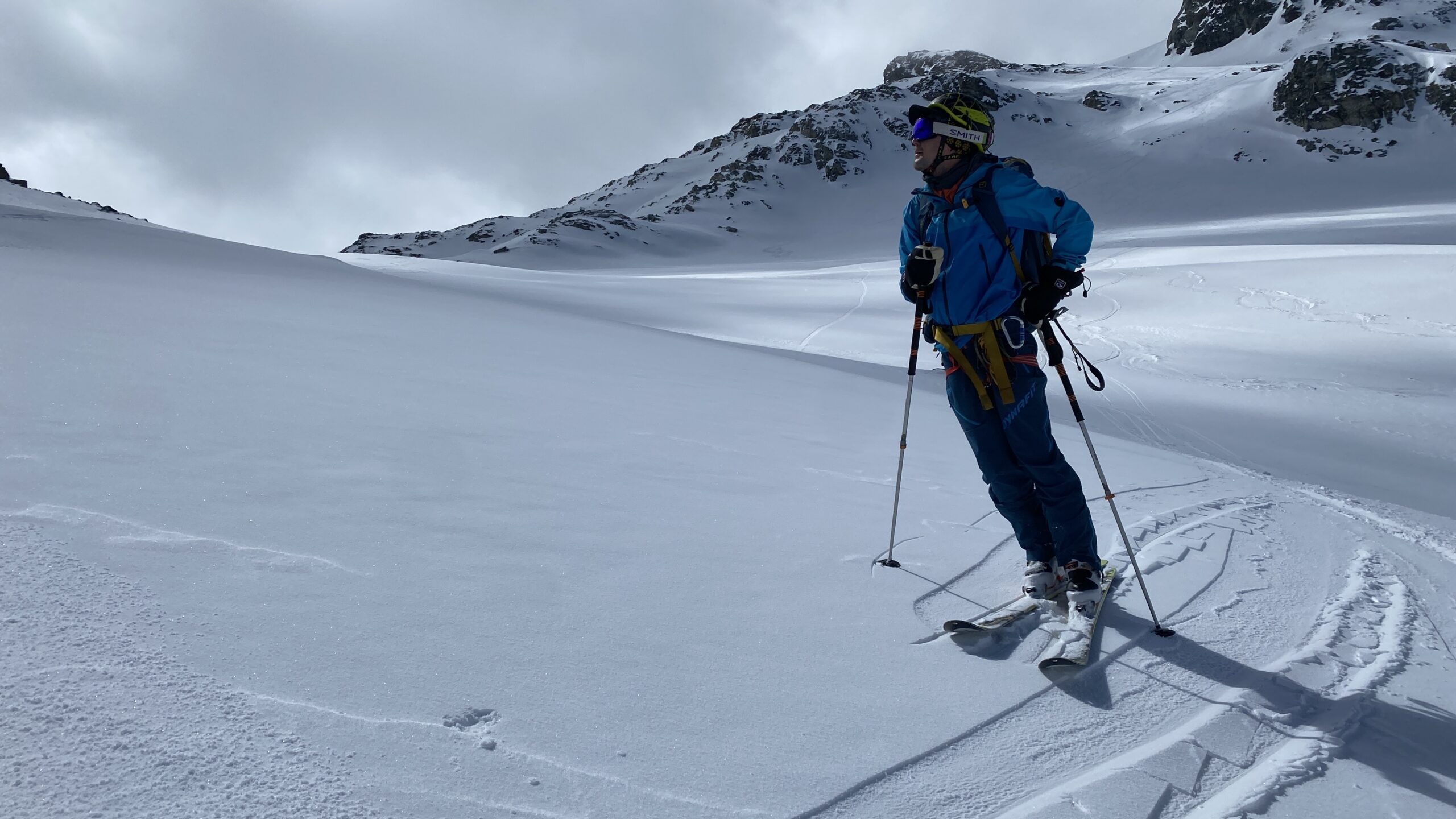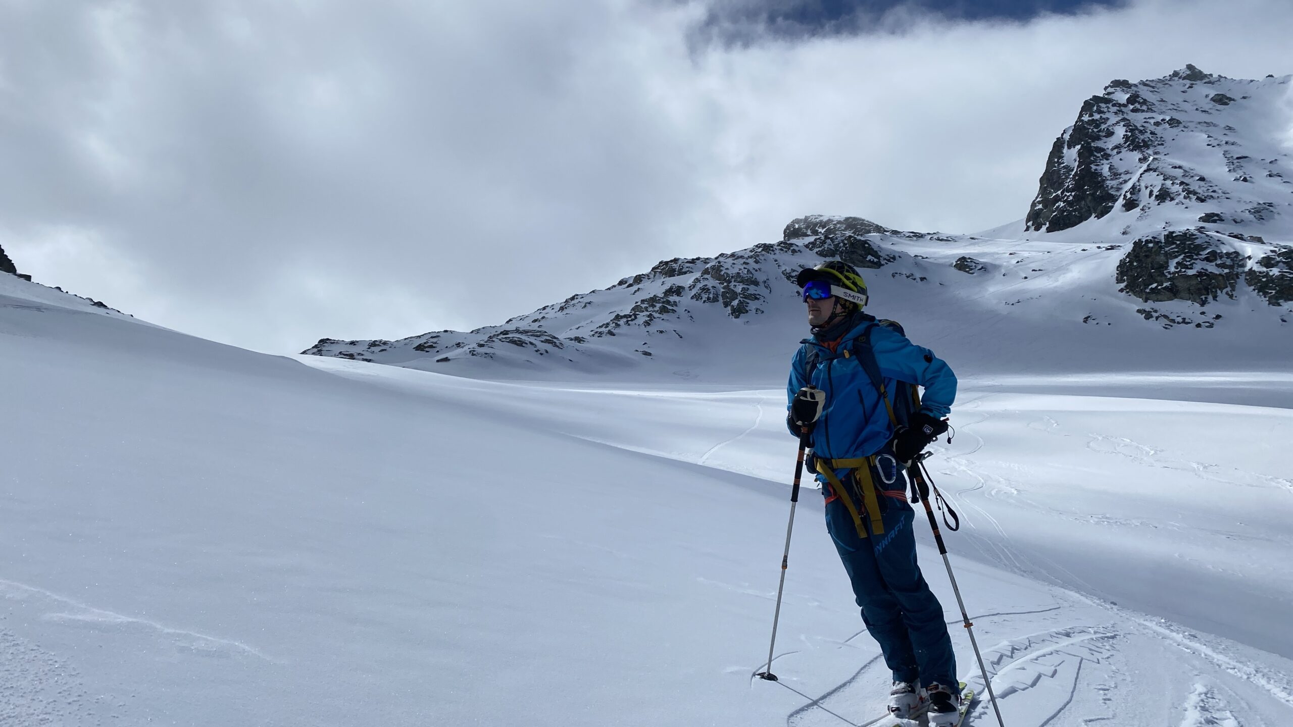 Fabian, Oliver, Gerald und ich fahren wieder öffentlich zum Hochtouren in den Westen. Geplant war die ganze Runde stark von Wolfi, aber der muss schweren Herzens krankheitsbedingt zu Hause bleiben. Ich komme dann Arbeitsbedingt direkt vom Arlberg und wir treffen uns Montagmorgen in Schruns. Von dort geht es im Bus zur Vermuntbahn und mit dem Tunnelbus auf die Bielerhöhe. Um 10:45 stehen wir auf den Skiern und steigen gemütlich zur Wiesbadnerhütte auf. Schnee ist genug, Nebel auch und der sanfte feuchte Schneefall begleitet uns bis zu Hütte. Wo wir umpacken und dann zu dritt noch einige Höhenmeter im dichten Nebel Richtung Ochsenscharte aufsteigen. Wir steigen gemütlich bis kurz vor den Gletscher auf, wo jede Orientierungspunkte wegfallen und wir vernunftsgesteuert bei 2800 Meter umdrehen. Die Abfahrt durch den Nebel ist dann besser als gedacht und so kommen wir zu den ersten schönen Schwüngen im frischen Pulverschnee (viel ist es nicht). Auf der Hütte lernen wir Jörg vom Alpenverein kennen, also ich spreche ihn an, weil mir sein Gesicht sehr bekannt vorkommt und auch er erinnert sich an mich. Später stelle ich fest, dass ich ihn vom Winterupdate (Moderation) und von seinen Auftritten als Pressesprecher bei den heurigen Lawinenunfällen aus dem ORF kennen. In Folge sehen wir uns regelmäßig und tauschen uns über die Lawinensituation und die jeweiligen Touren aus, weil wir sehr ähnliche Wege gehen.